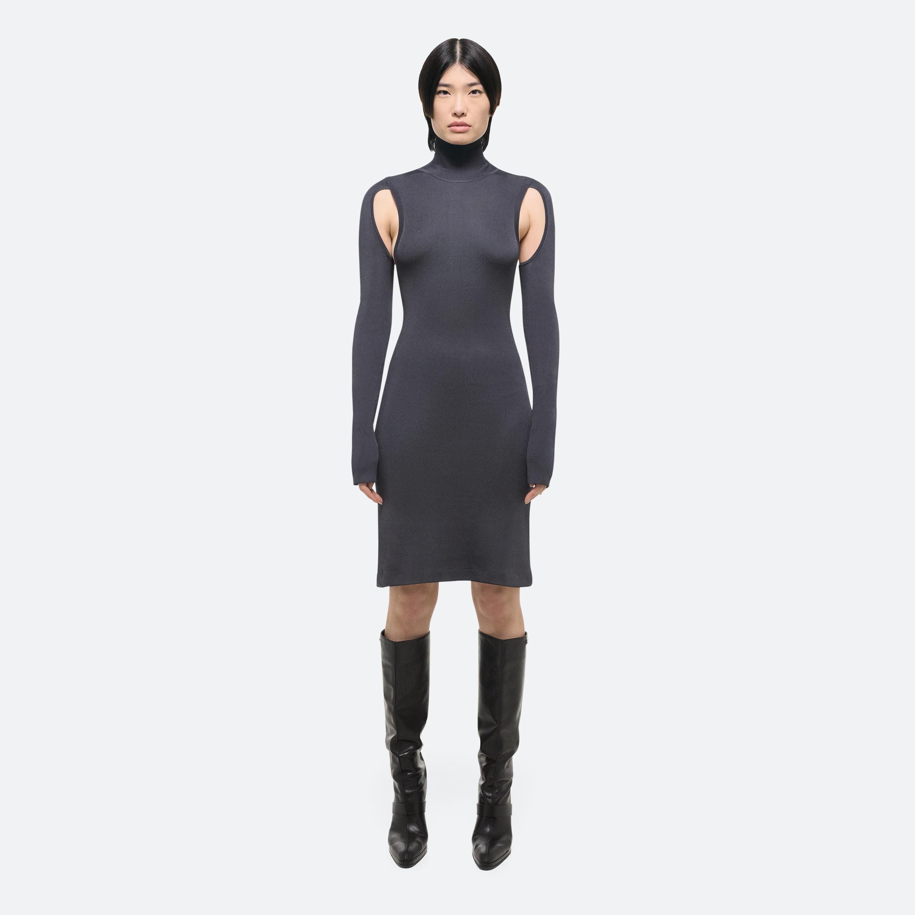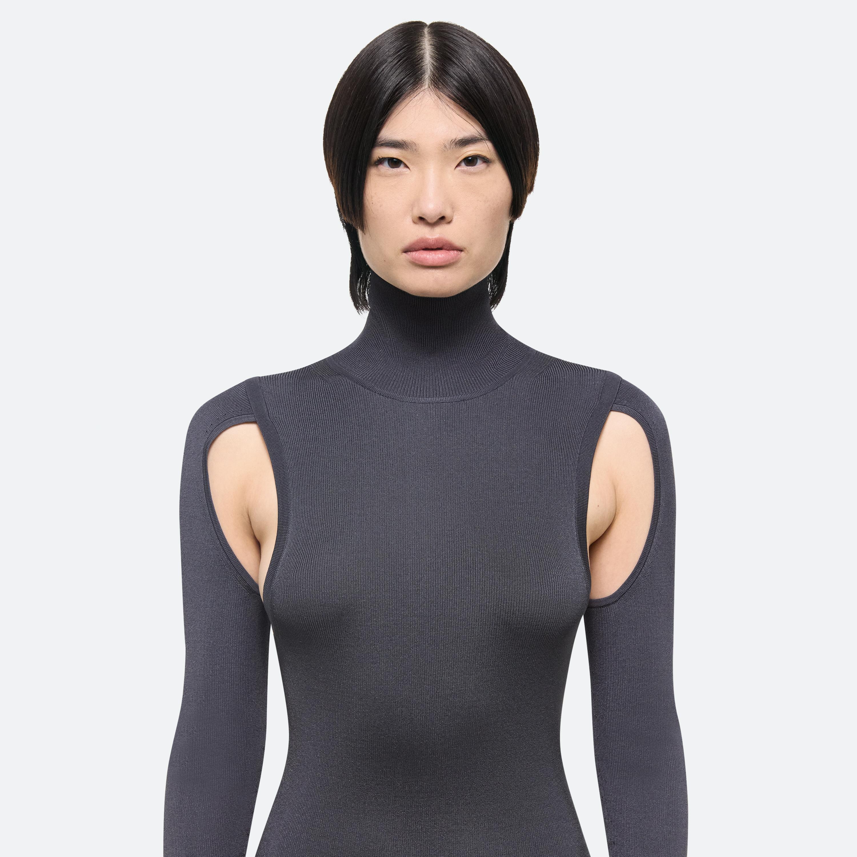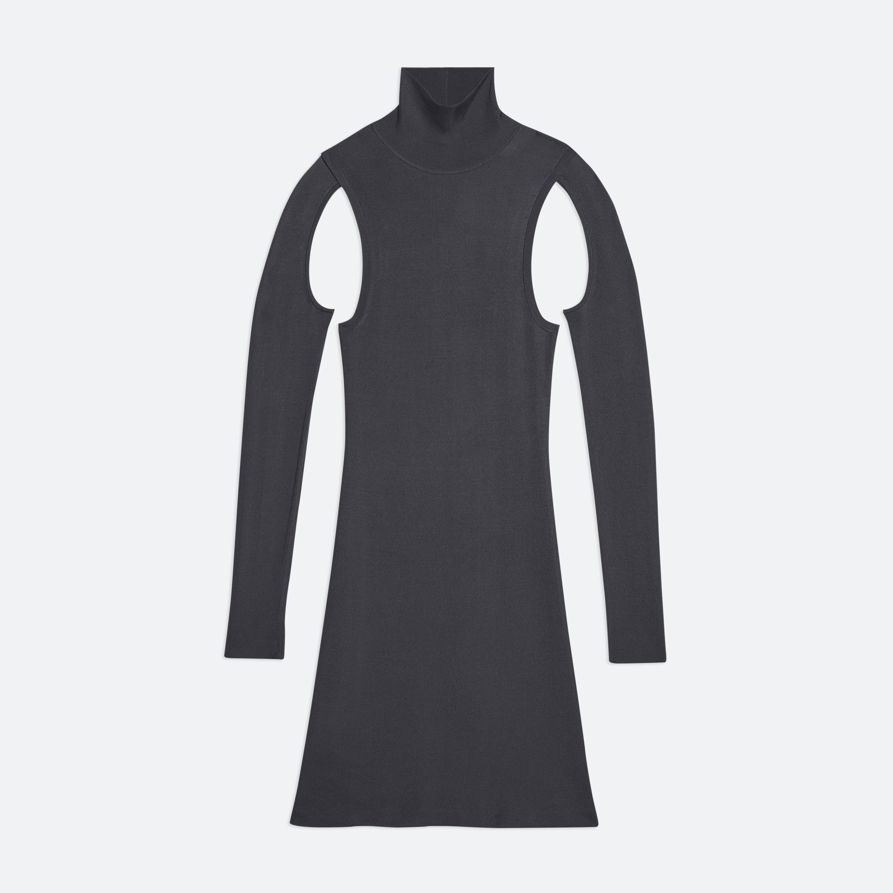 Fine-gauge turtleneck sweater dress in a viscose knit with a subtle sheen. Slim fit with underarms cutouts finished with clean self knit trims.
