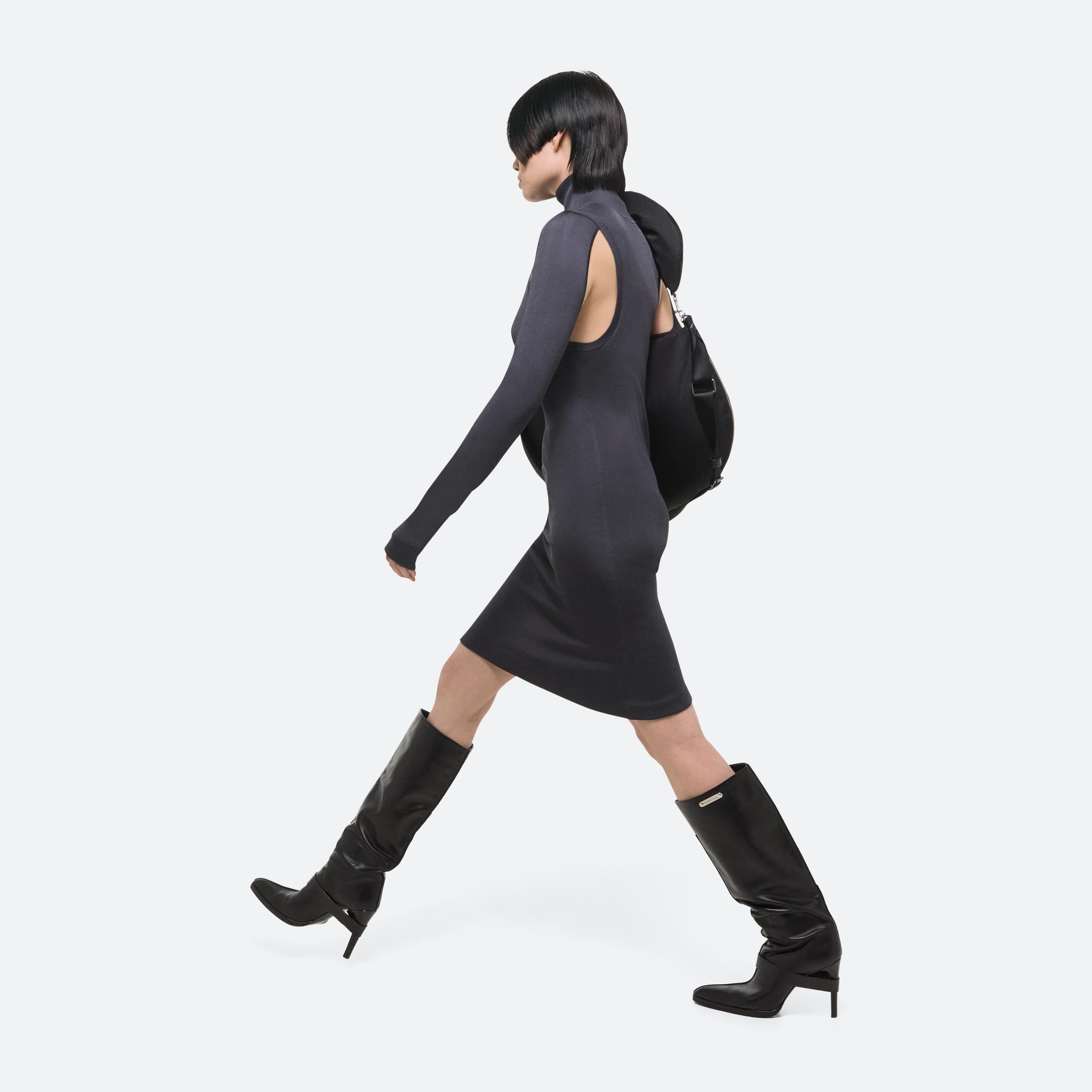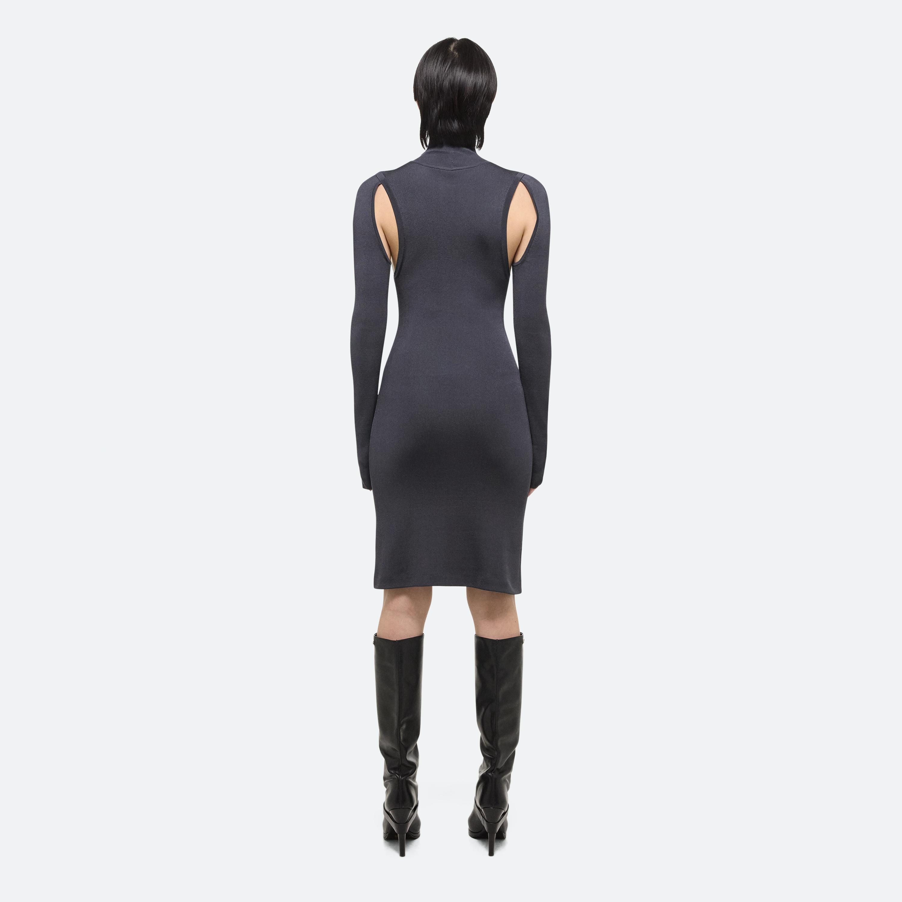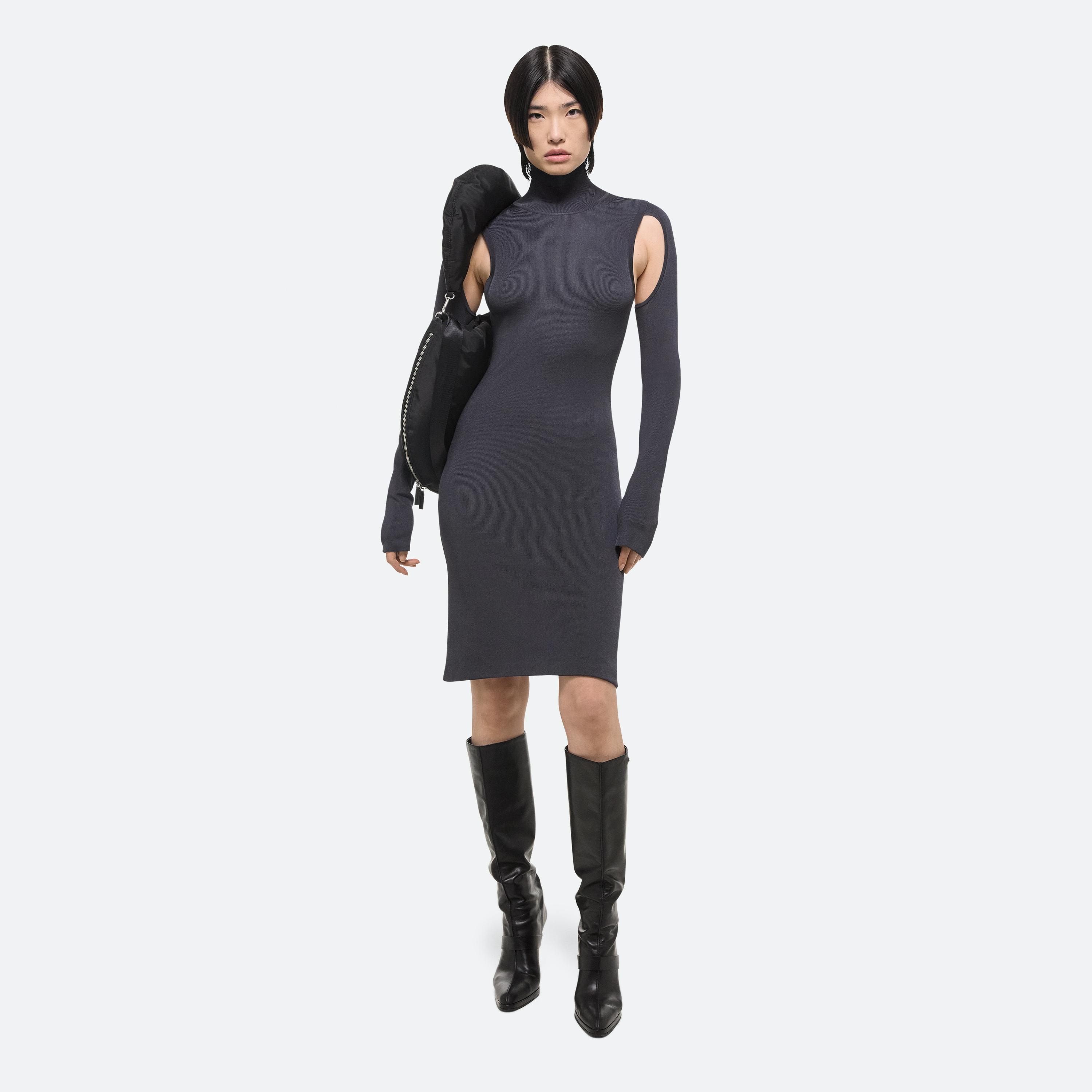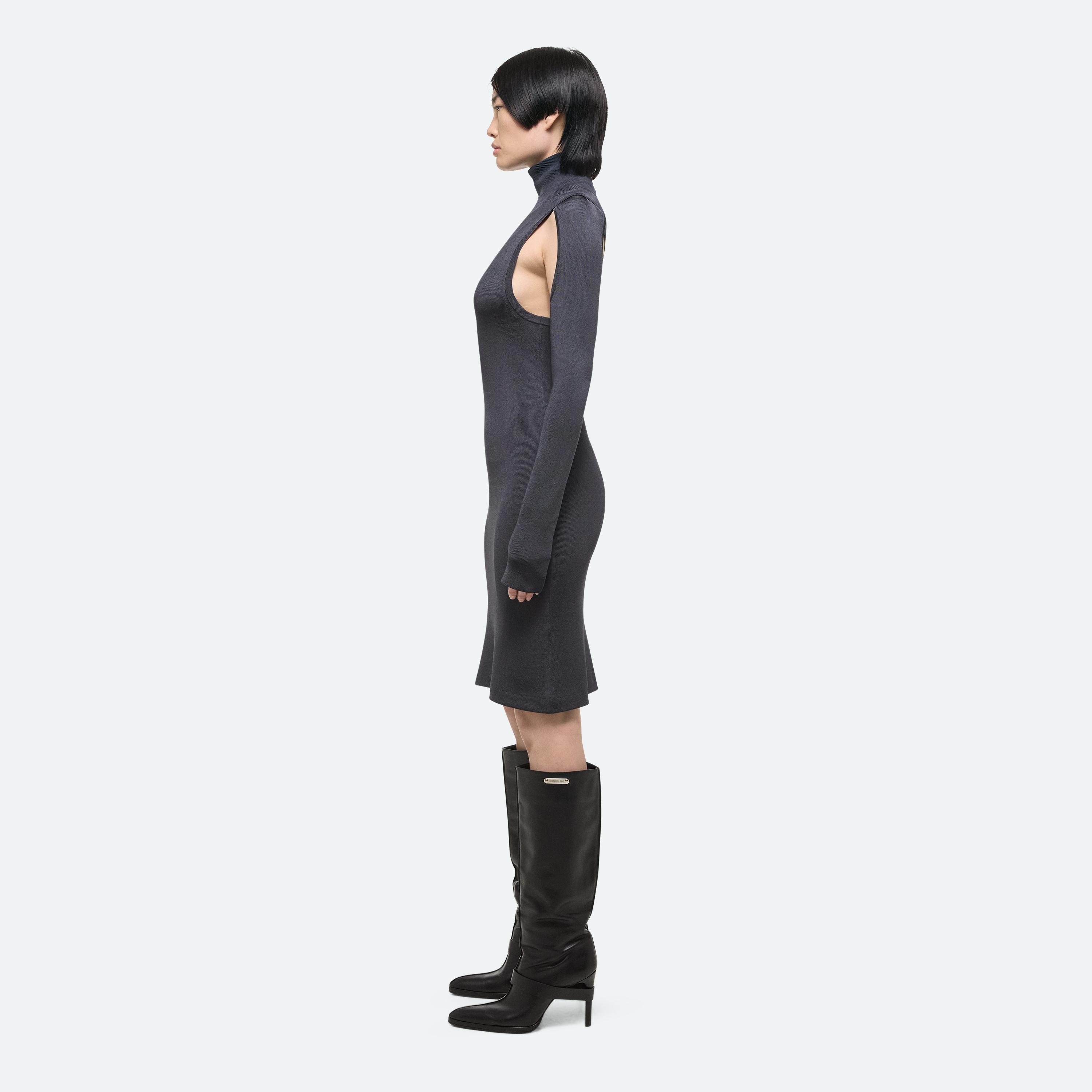 Fine-gauge turtleneck sweater dress in a viscose knit with a subtle sheen. Slim fit with underarms cutouts finished with clean self knit trims.