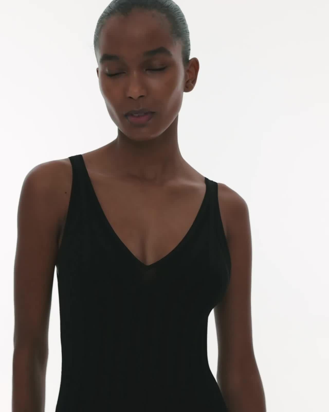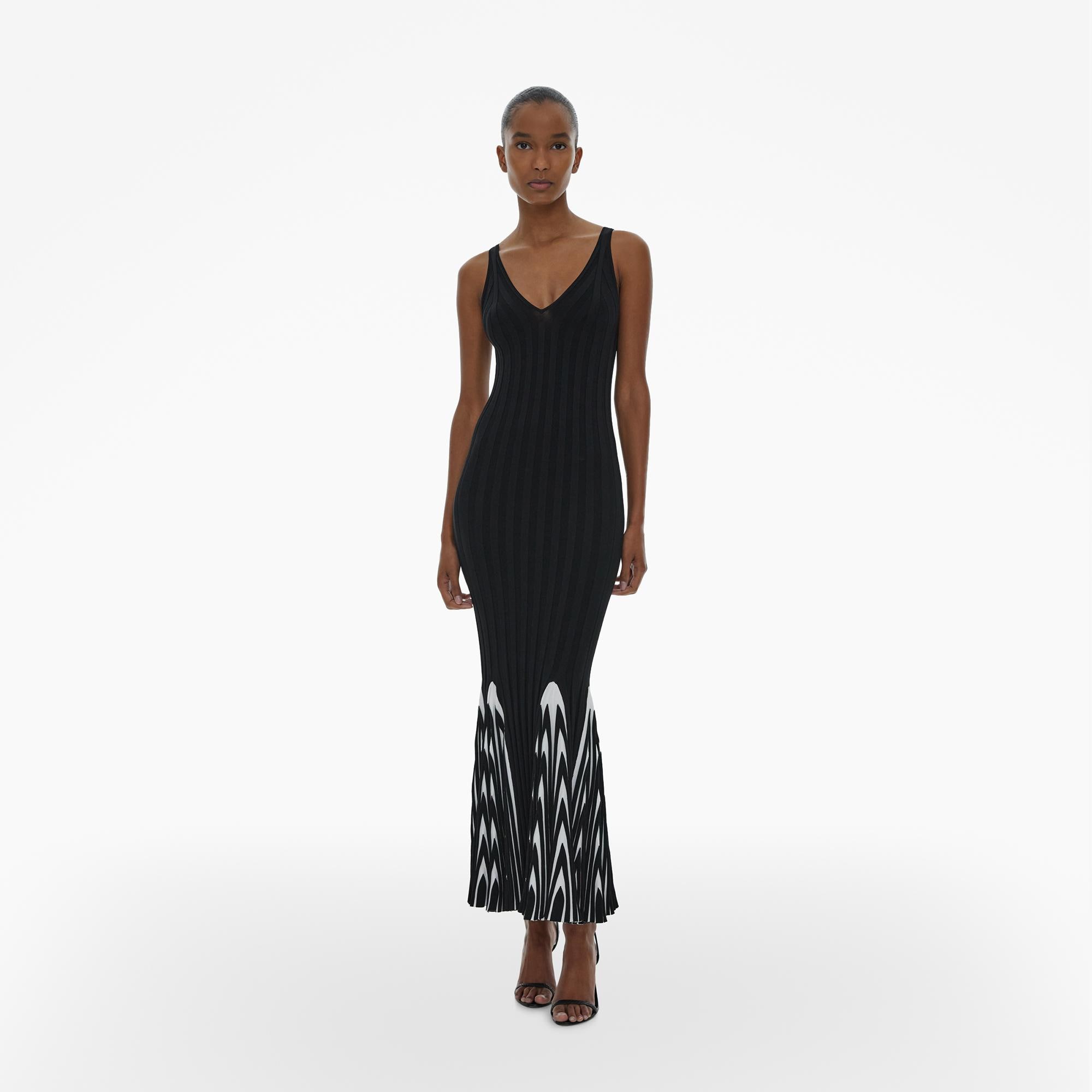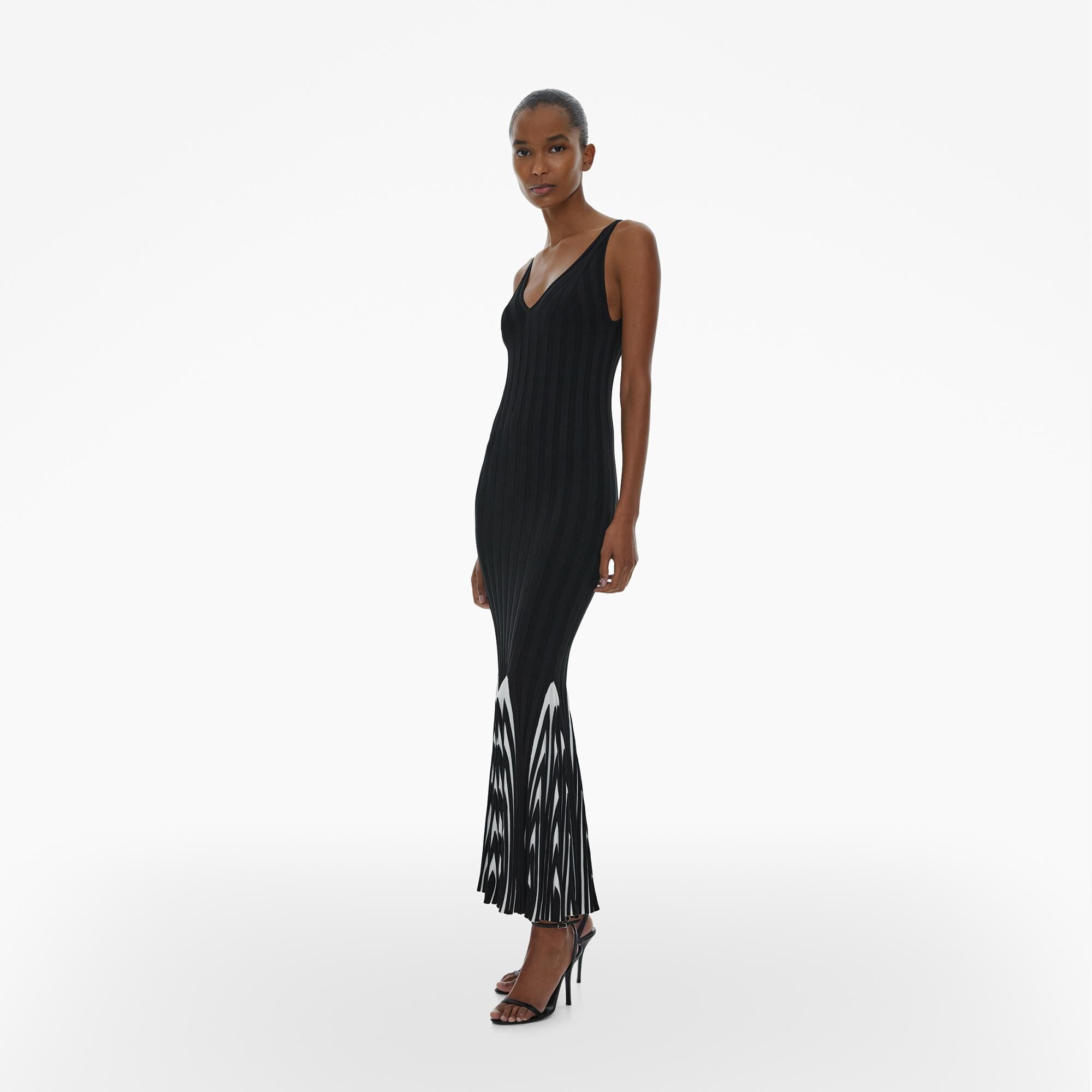The Helmut Lang Angela Knit Dress is a sleeveless midi style in a rib knit viscose blend that is detailed with a V-neckline and flared at the hem with godets.