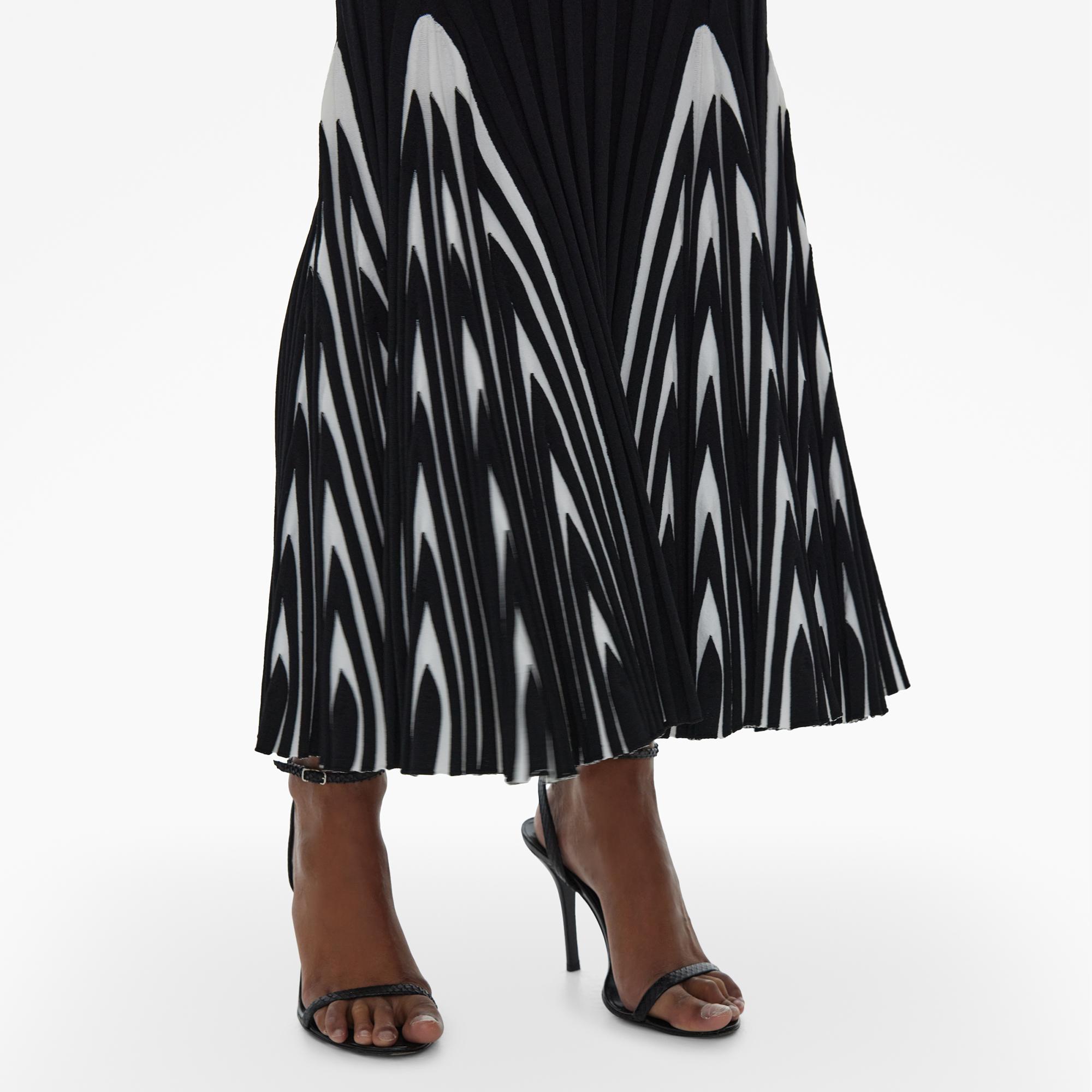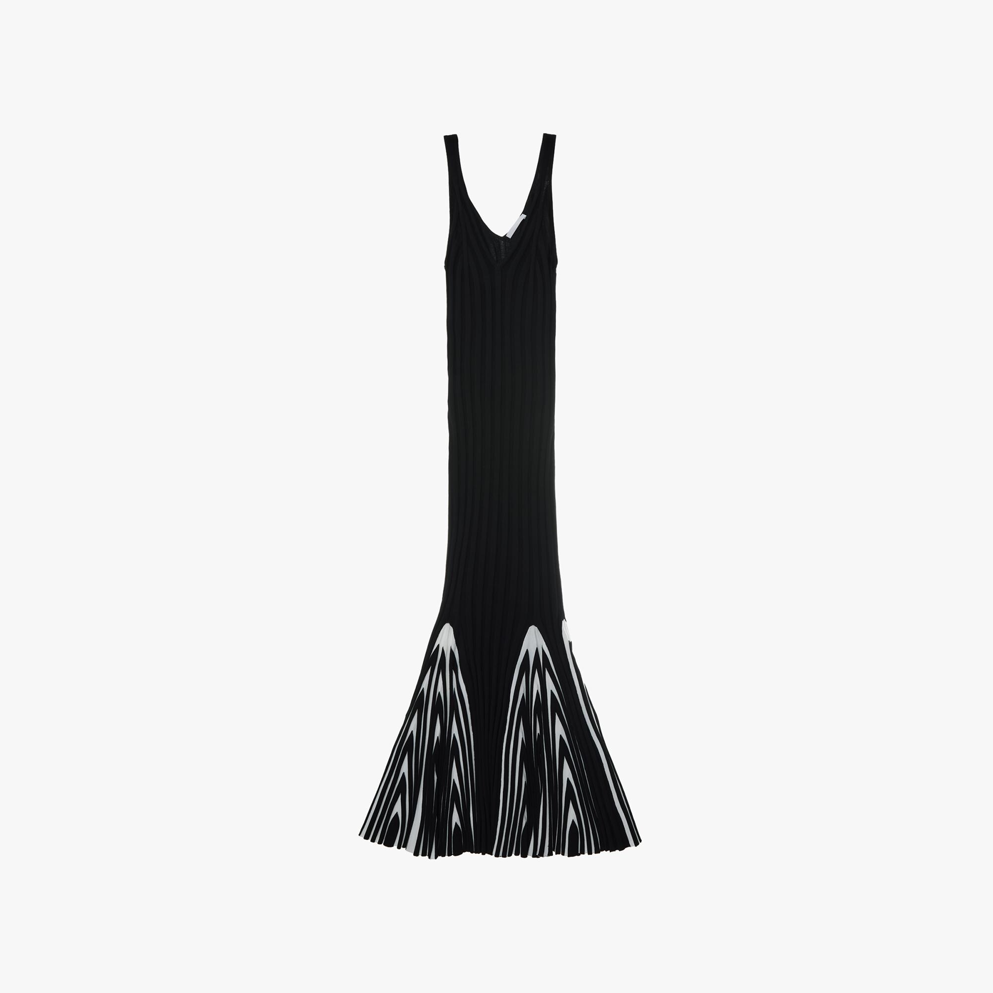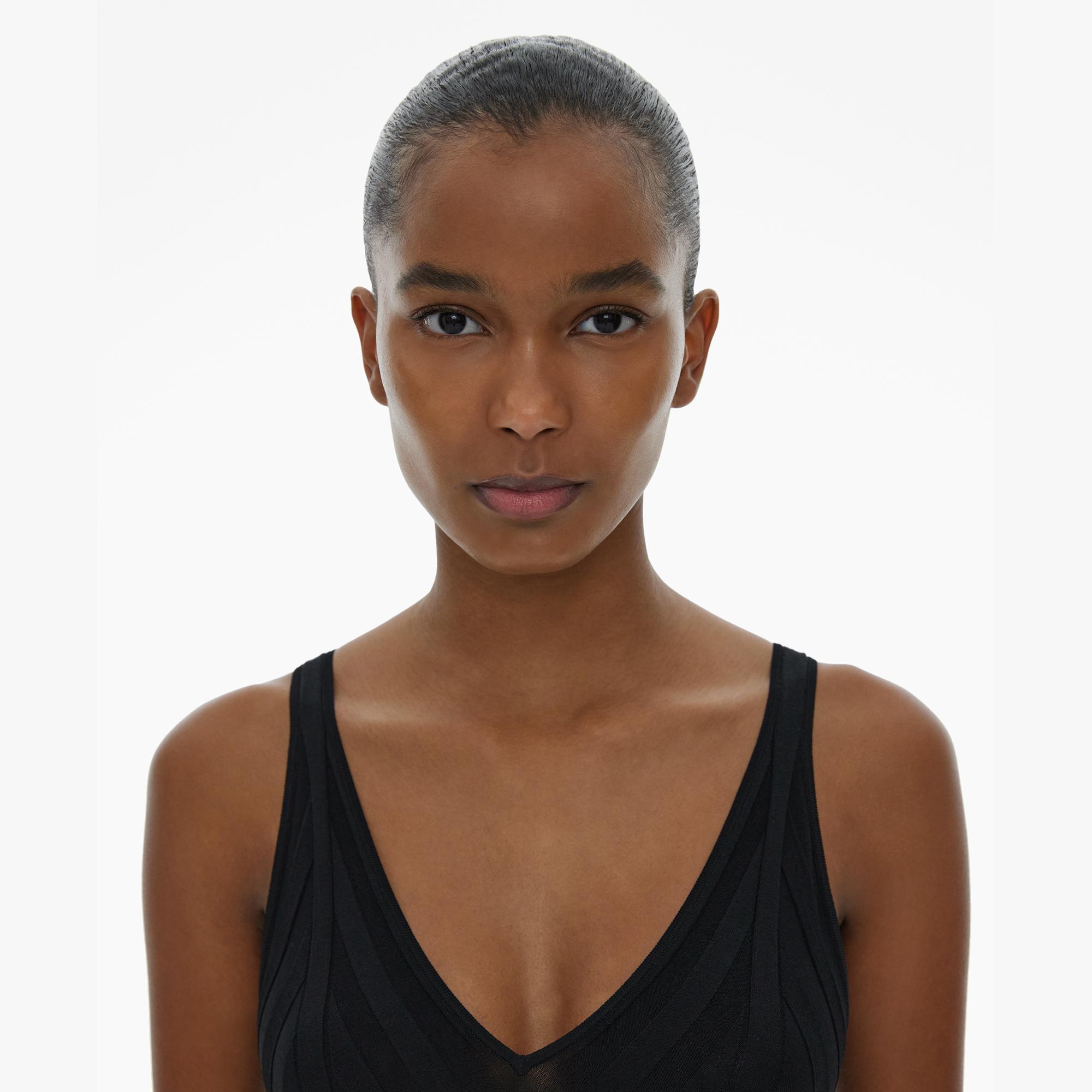 The Helmut Lang Angela Knit Dress is a sleeveless midi style in a rib knit viscose blend that is detailed with a V-neckline and flared at the hem with godets.