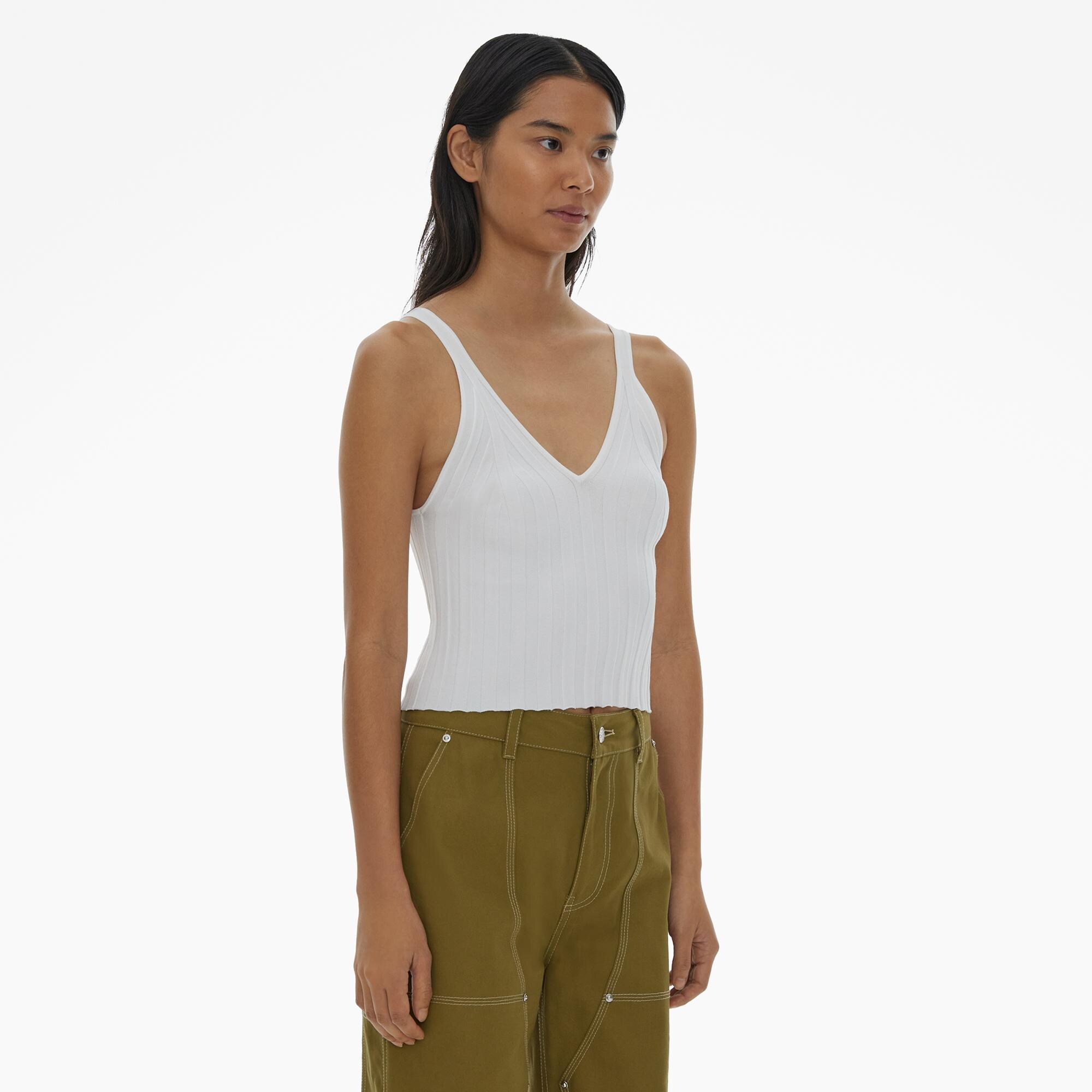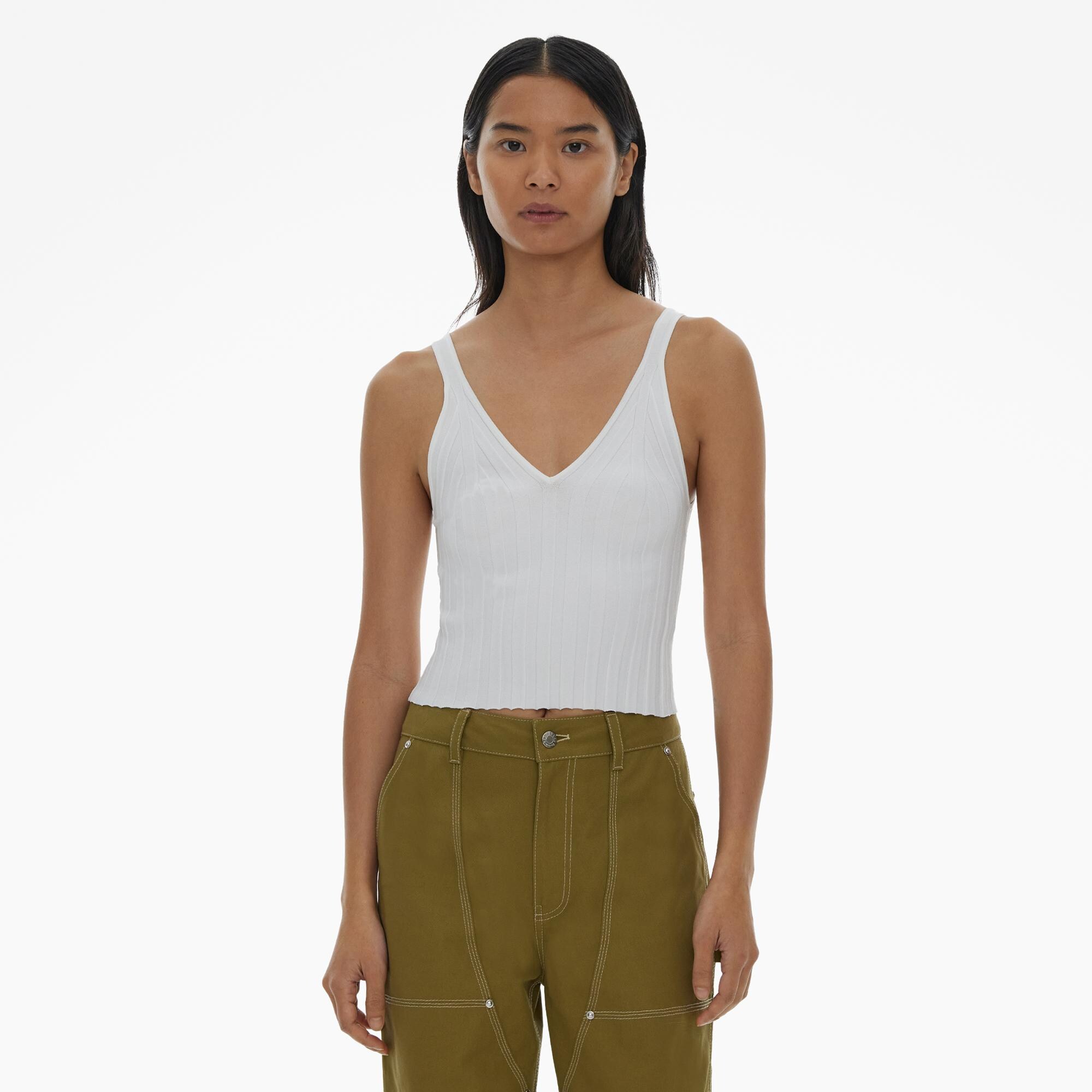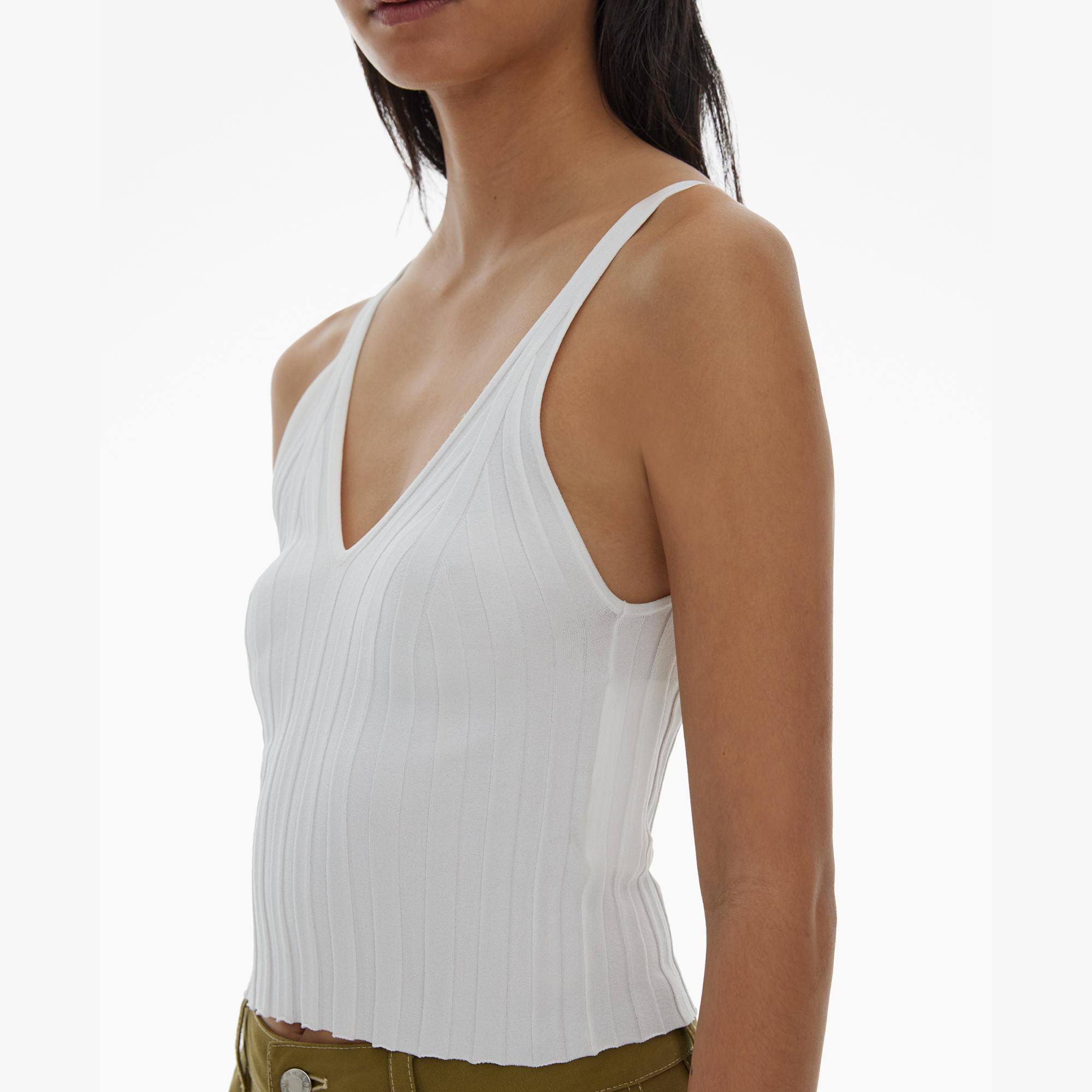 The Helmut Lang Angela Knit Tank is a sleeveless style in a rib knit viscose blend that is detailed with a V-neckline.