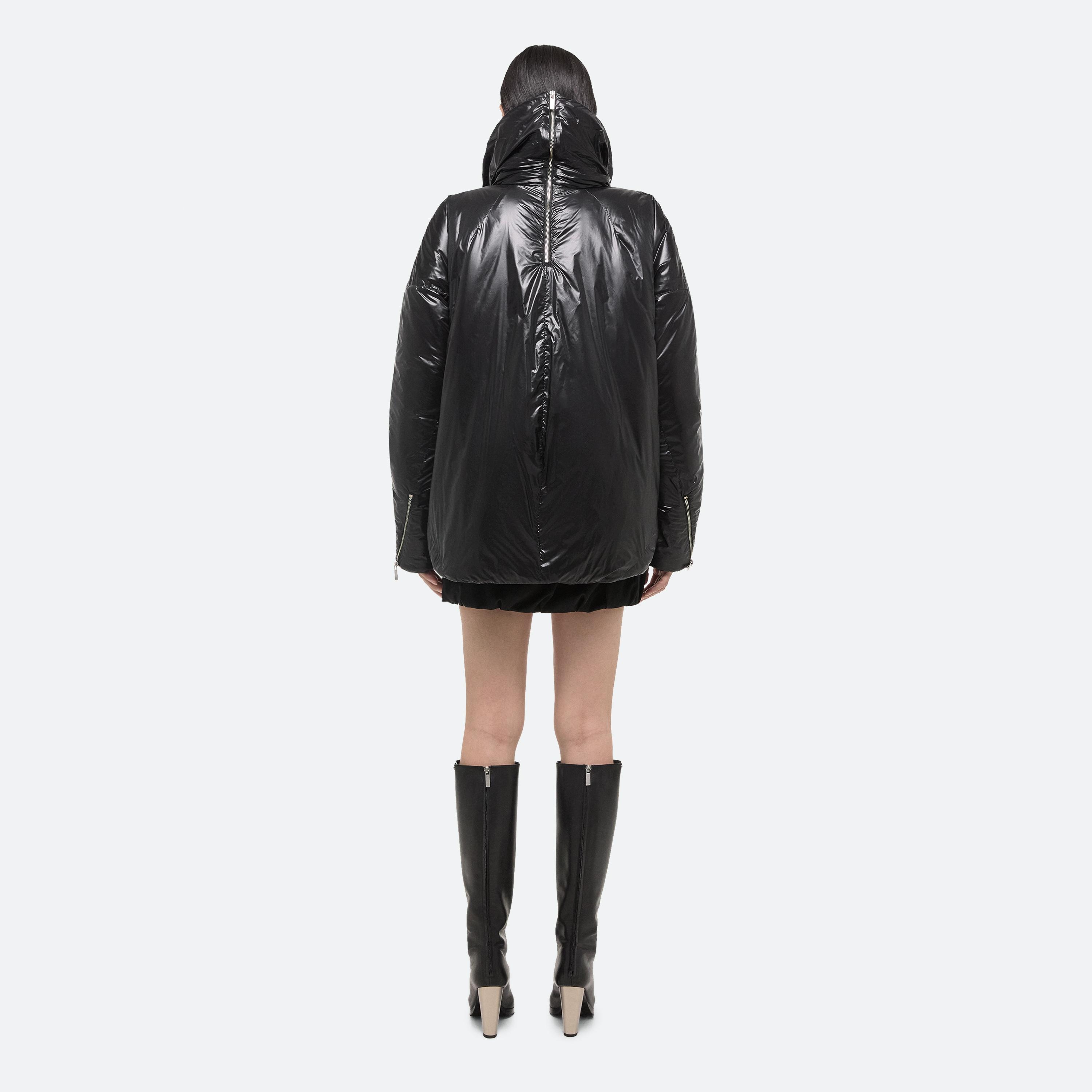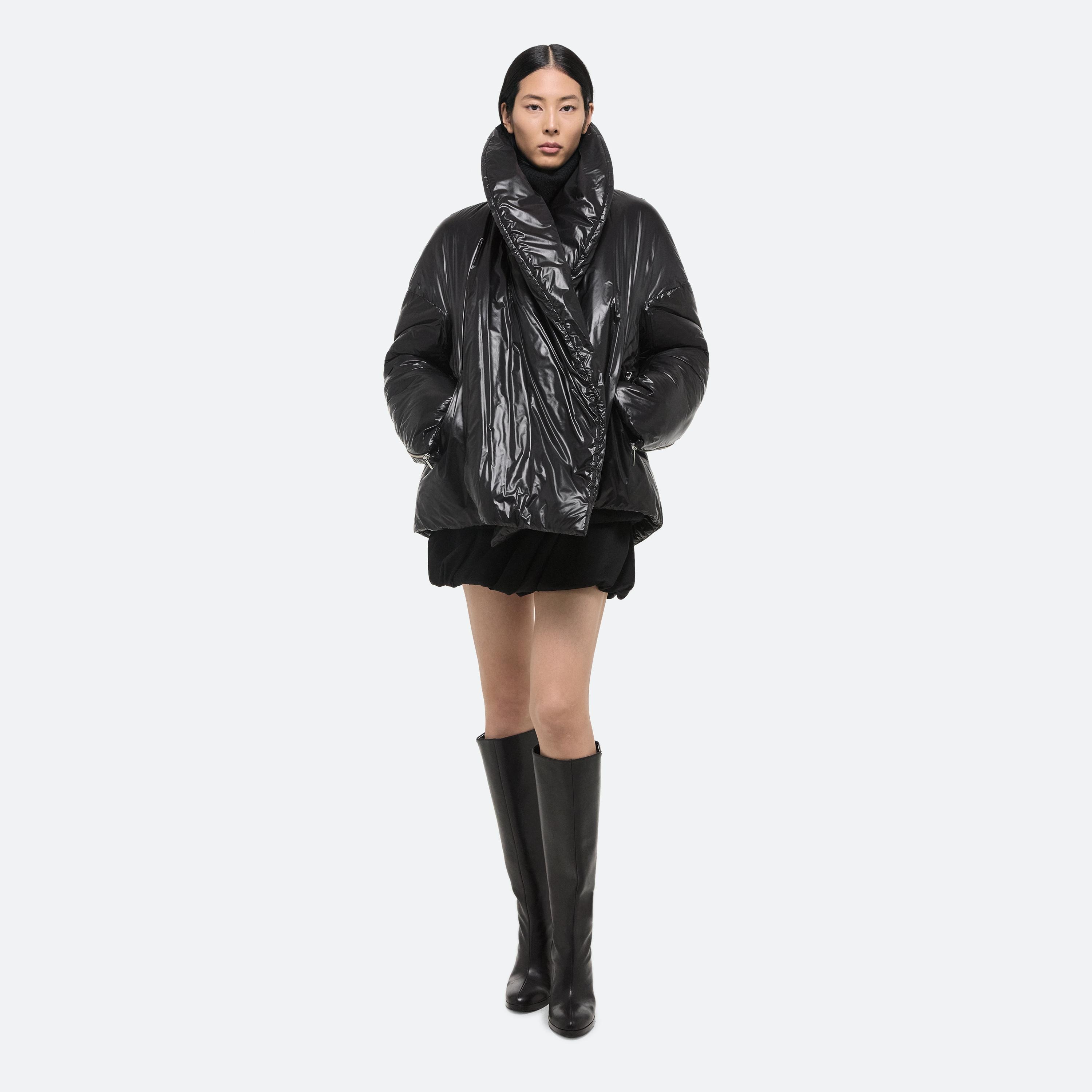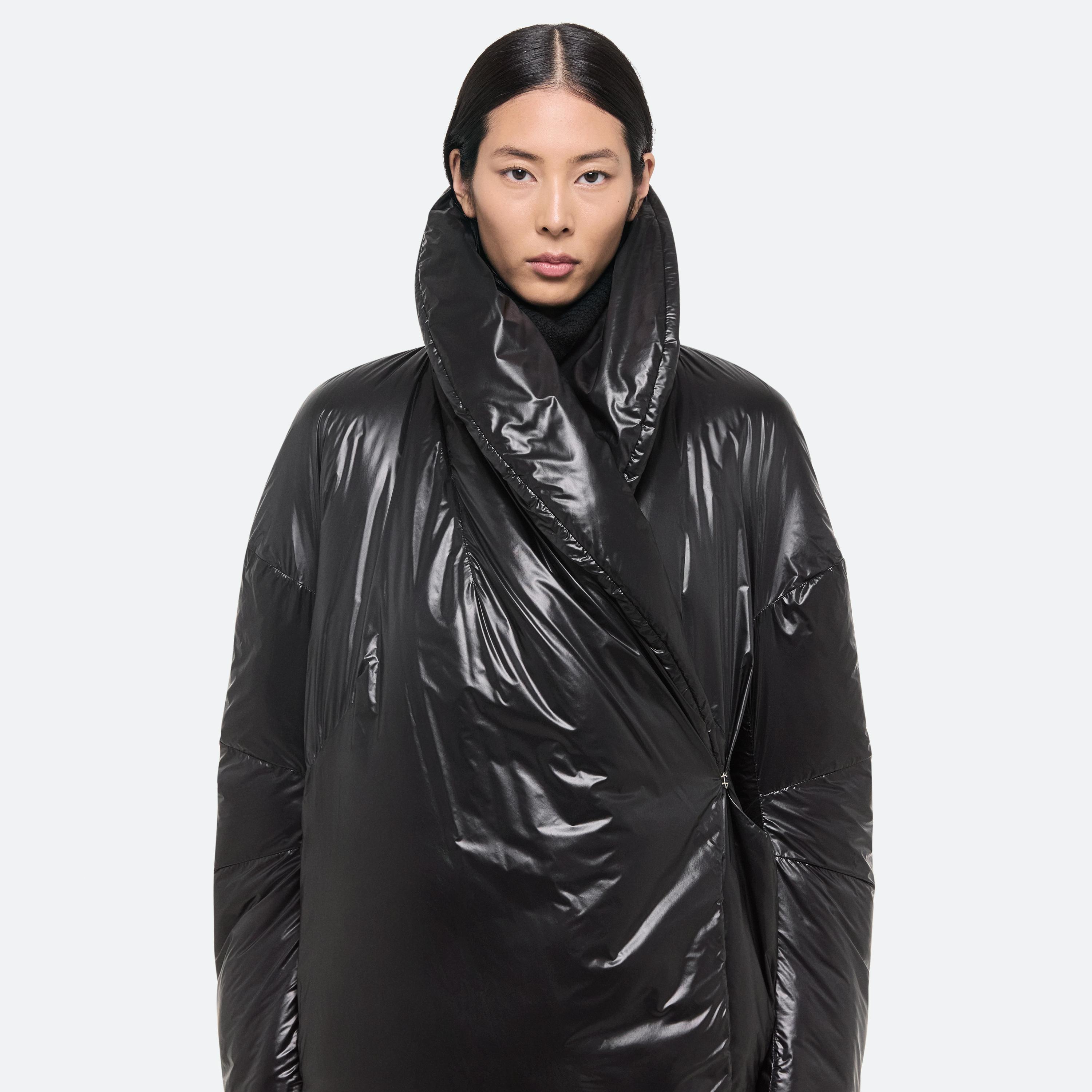 Down puffer jacket in glossy nylon. Wrapped seams and a dropped shoulder create a softly curved silhouette. Open the back zipper for an exaggerated shawl collar, or zip closed for more protection against the elements.