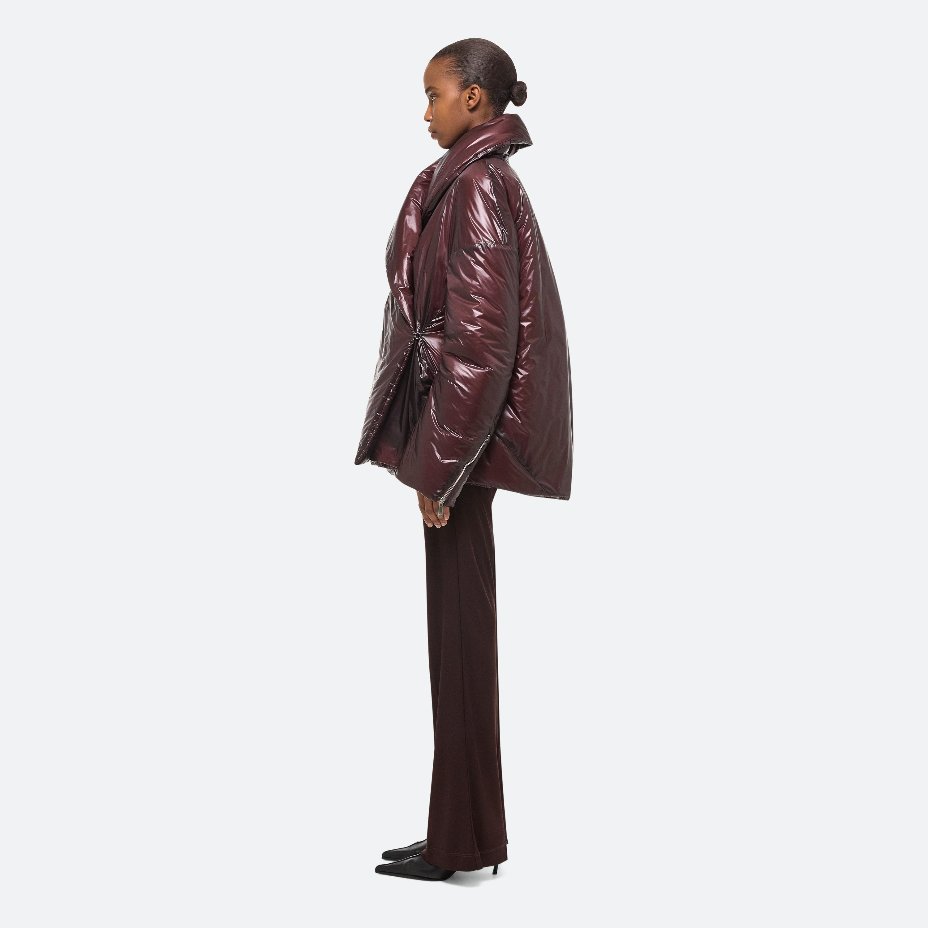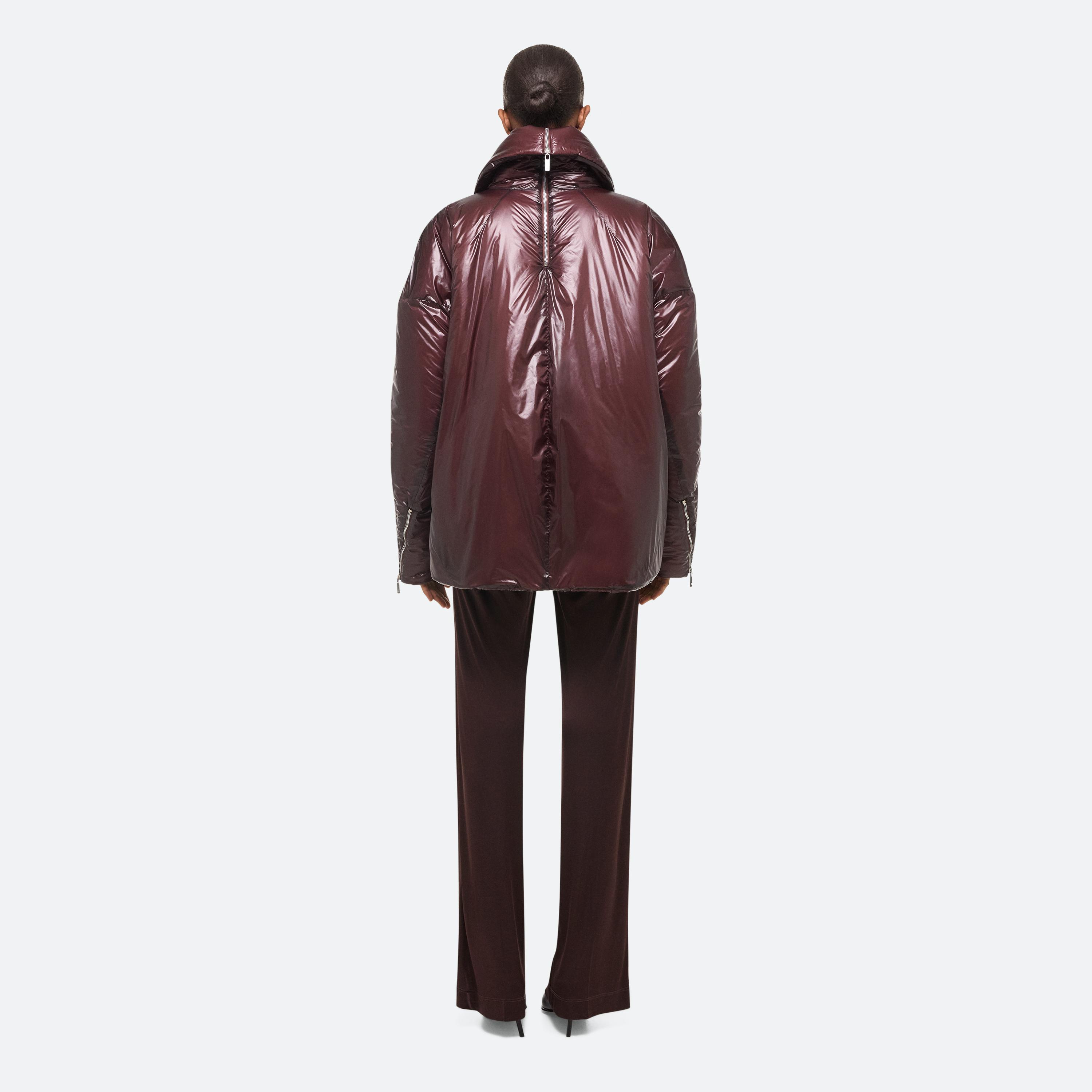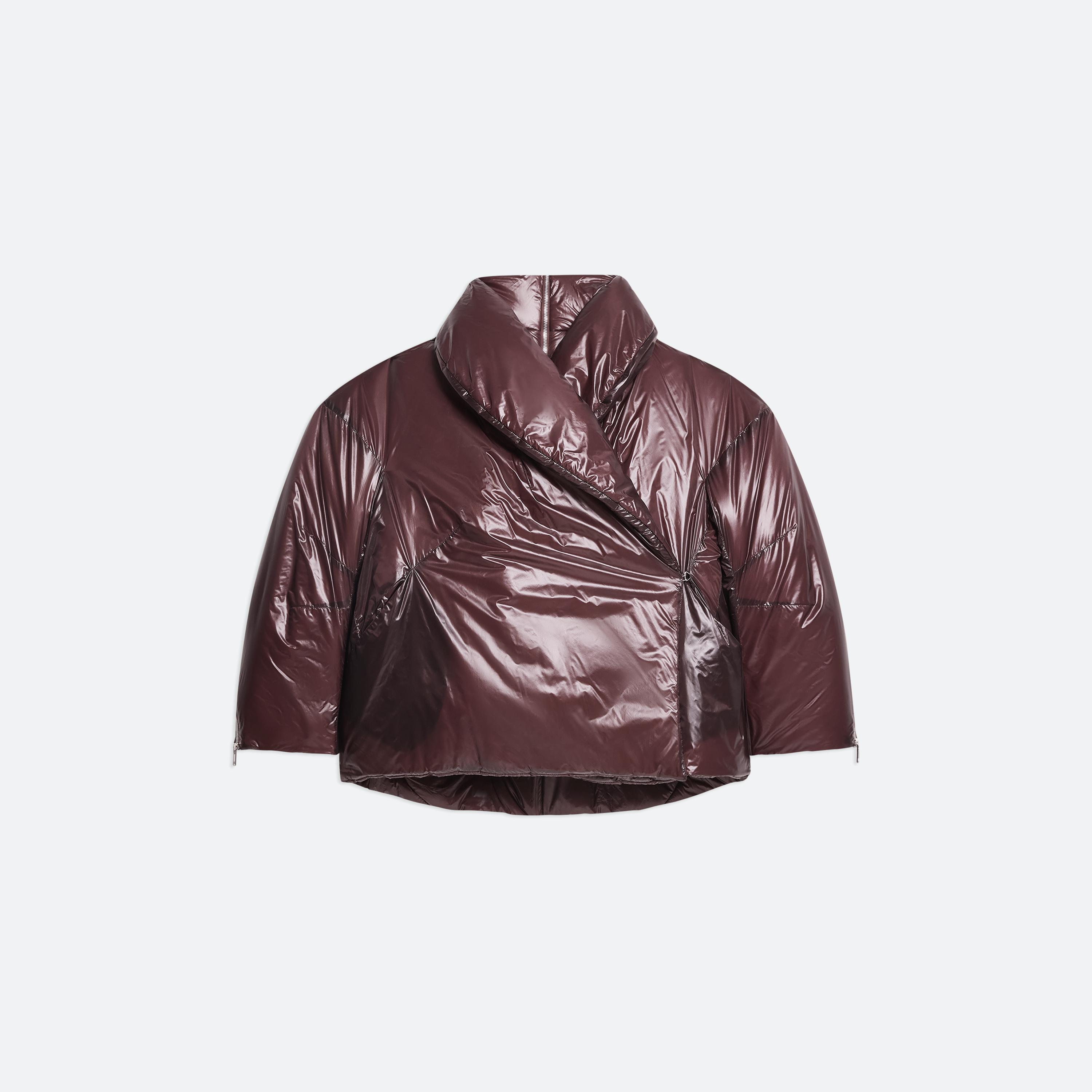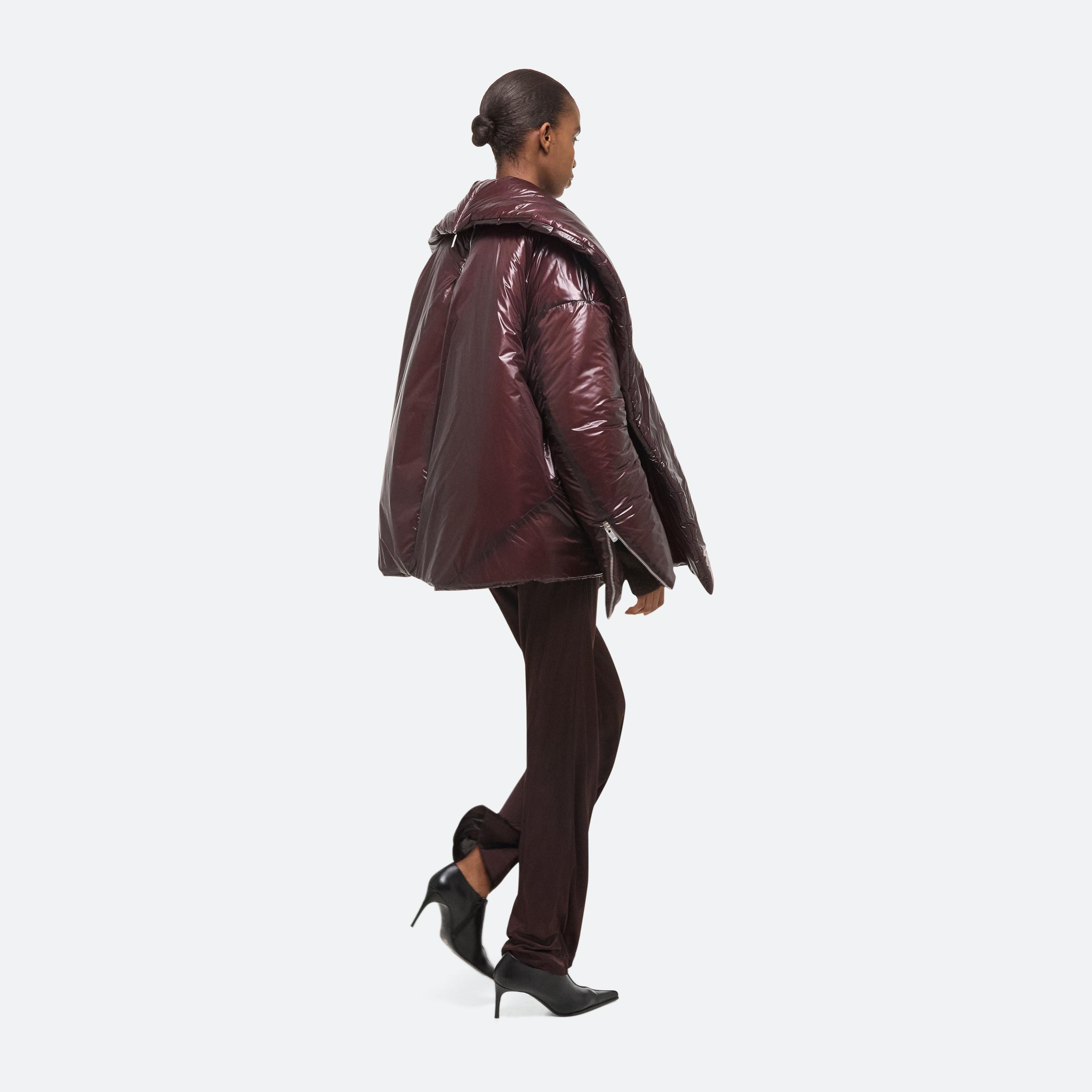 Down puffer jacket in glossy nylon. Wrapped seams and a dropped shoulder create a softly curved silhouette. Open the back zipper for an exaggerated shawl collar, or zip closed for more protection against the elements.