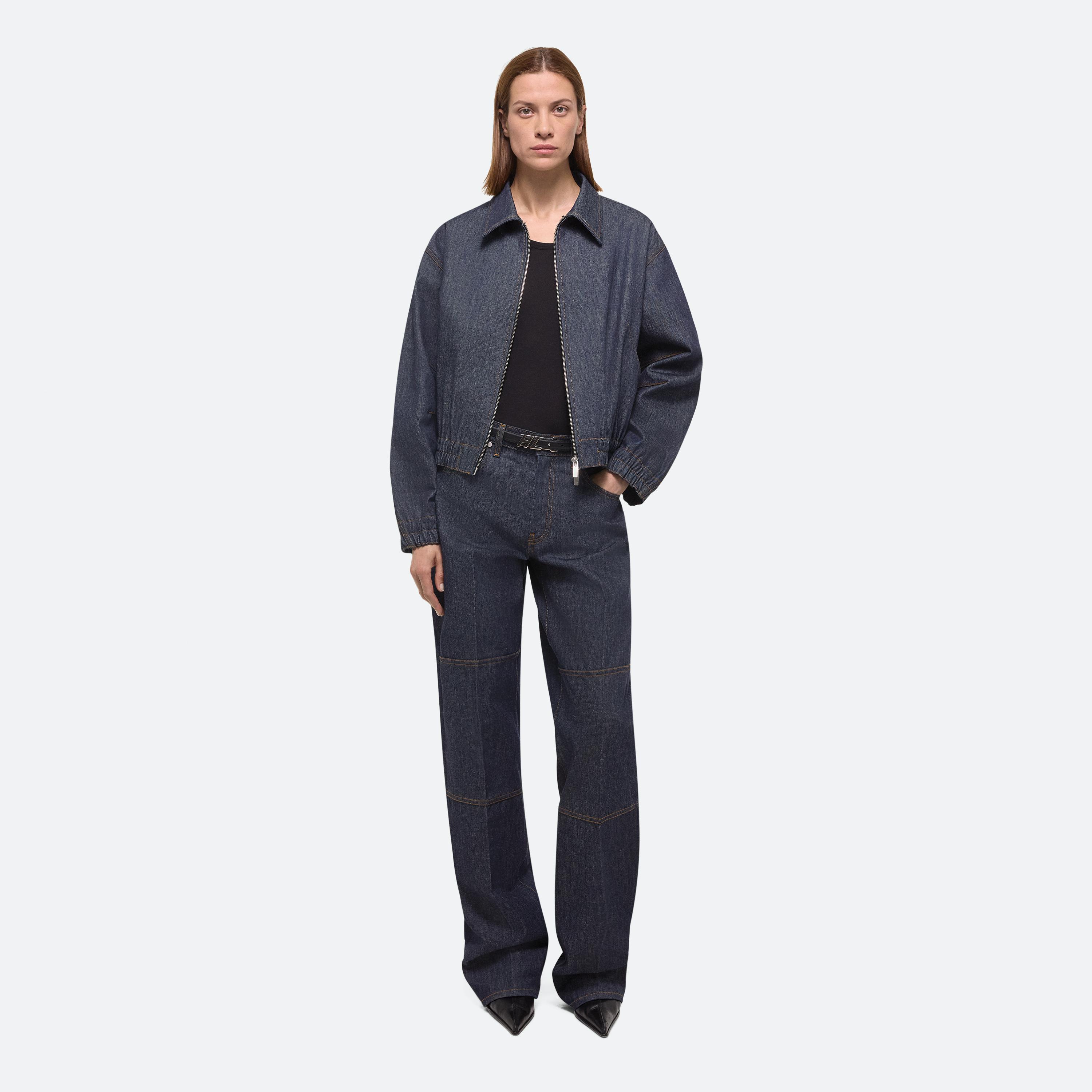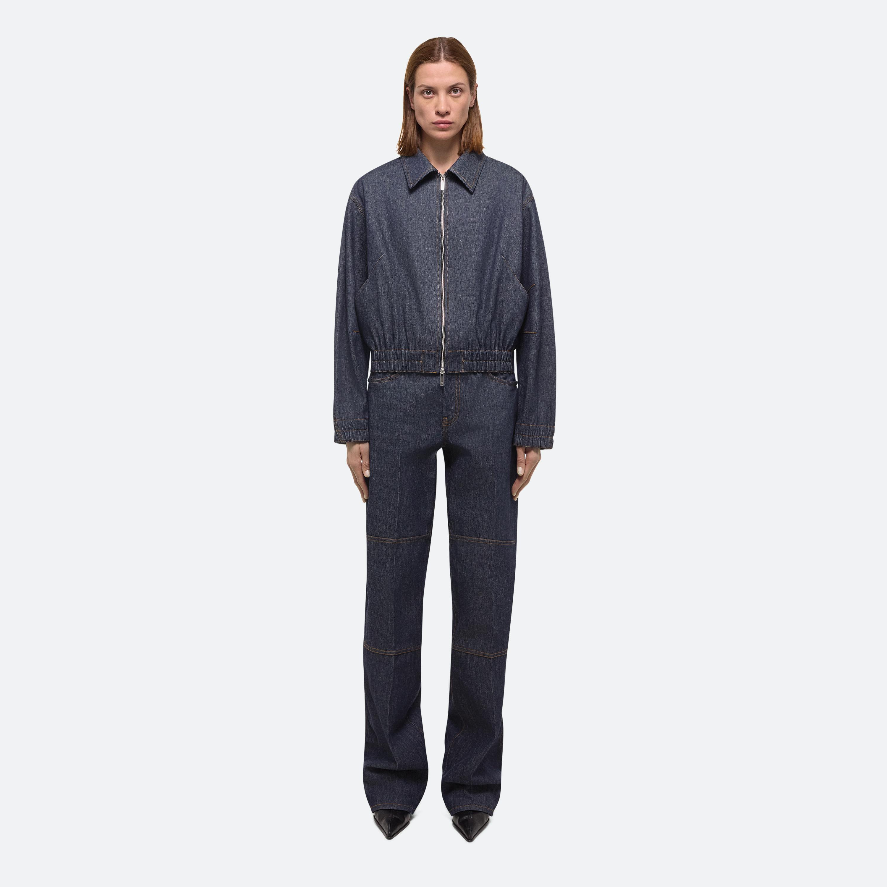 Zip-front denim jacket in a raw indigo rinse with a cropped fit. Curved seams and elastic cuffs create a gently rounded silhouette.