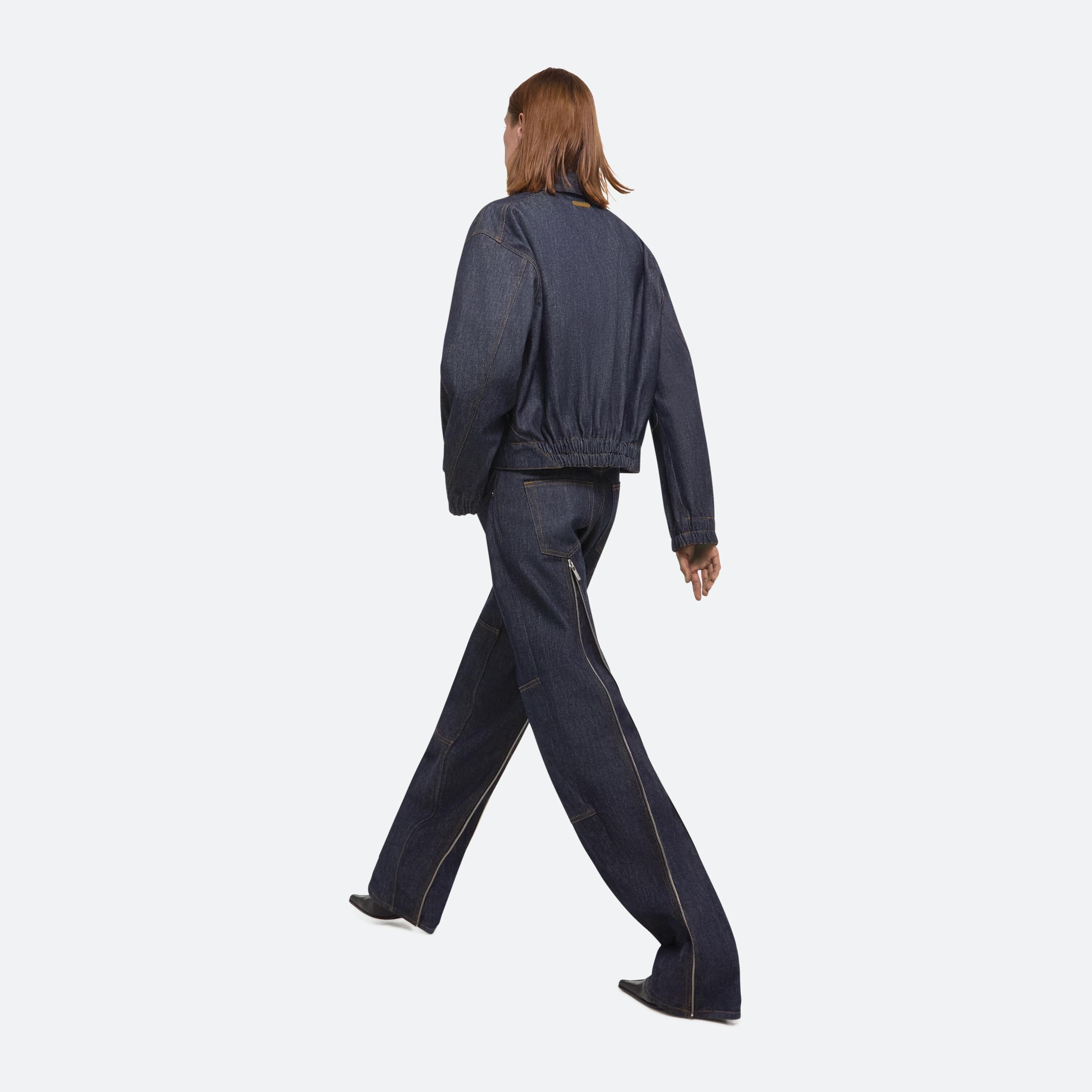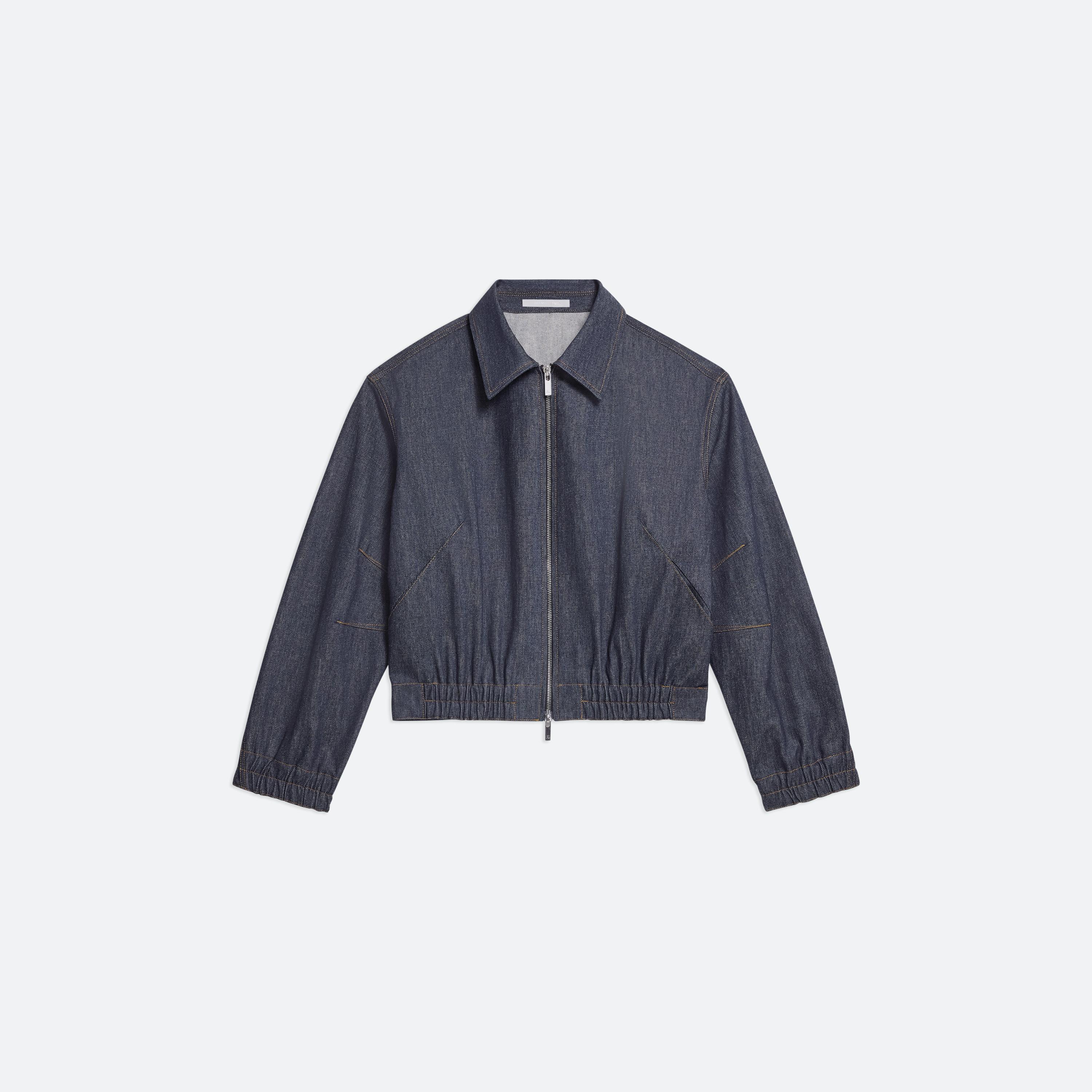 Zip-front denim jacket in a raw indigo rinse with a cropped fit. Curved seams and elastic cuffs create a gently rounded silhouette.