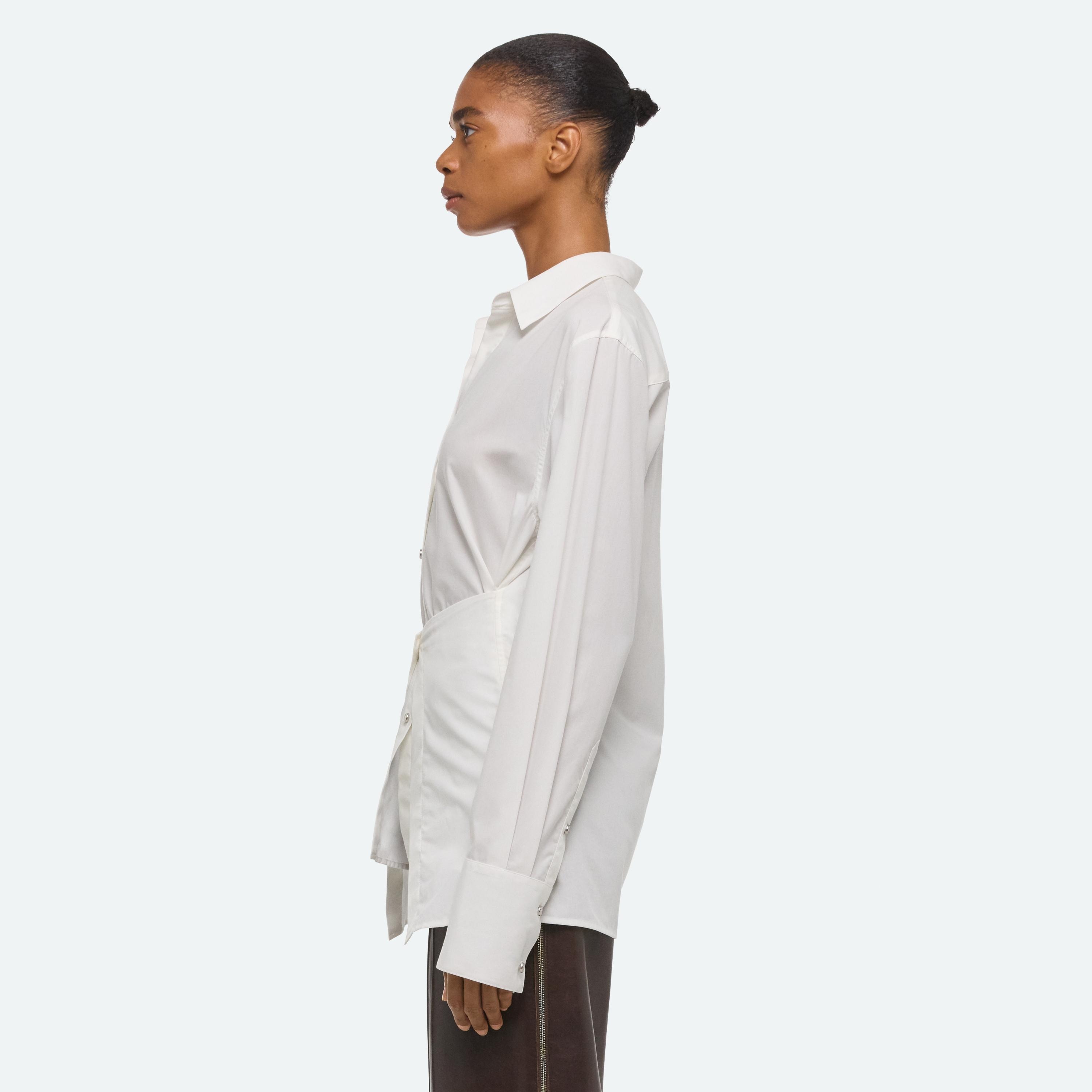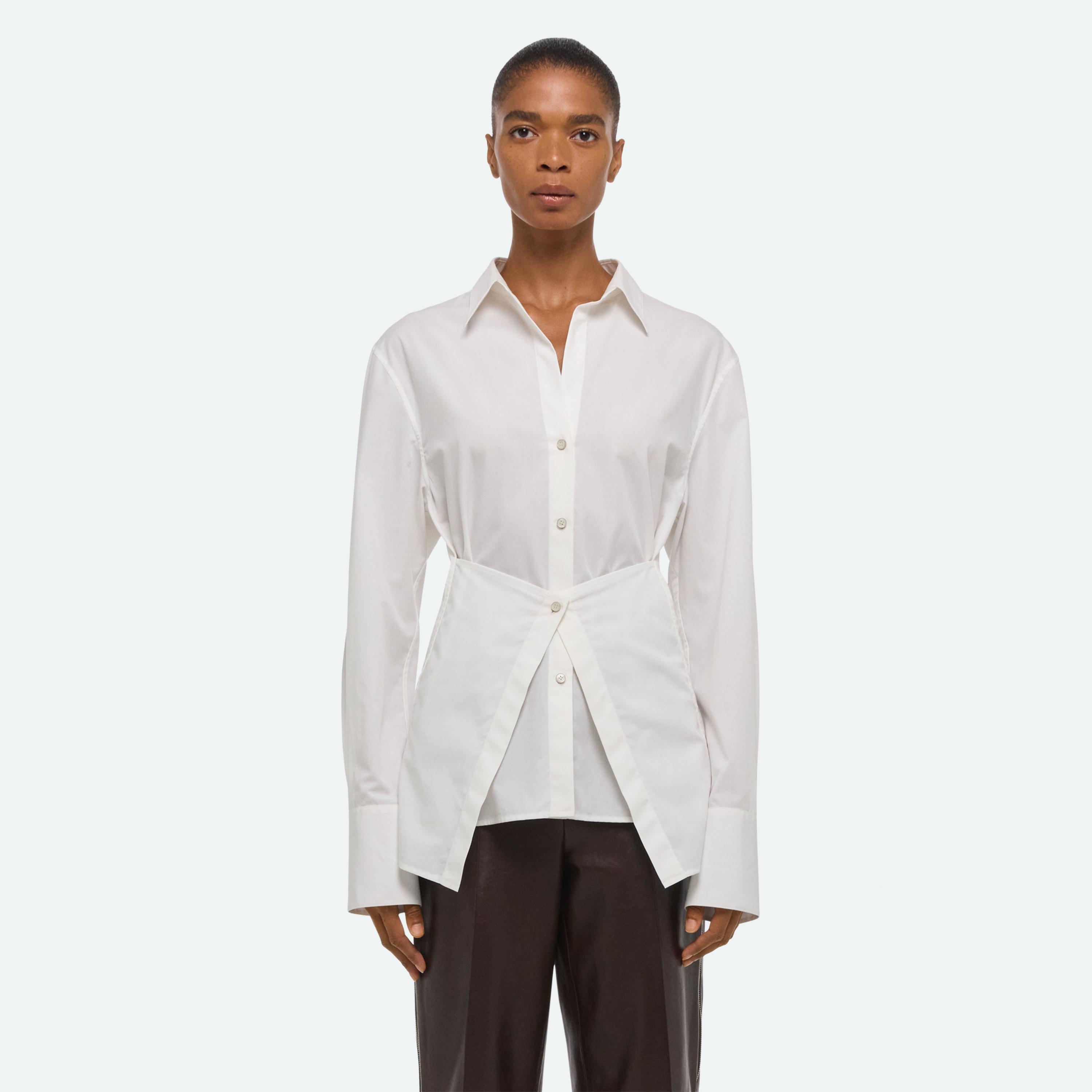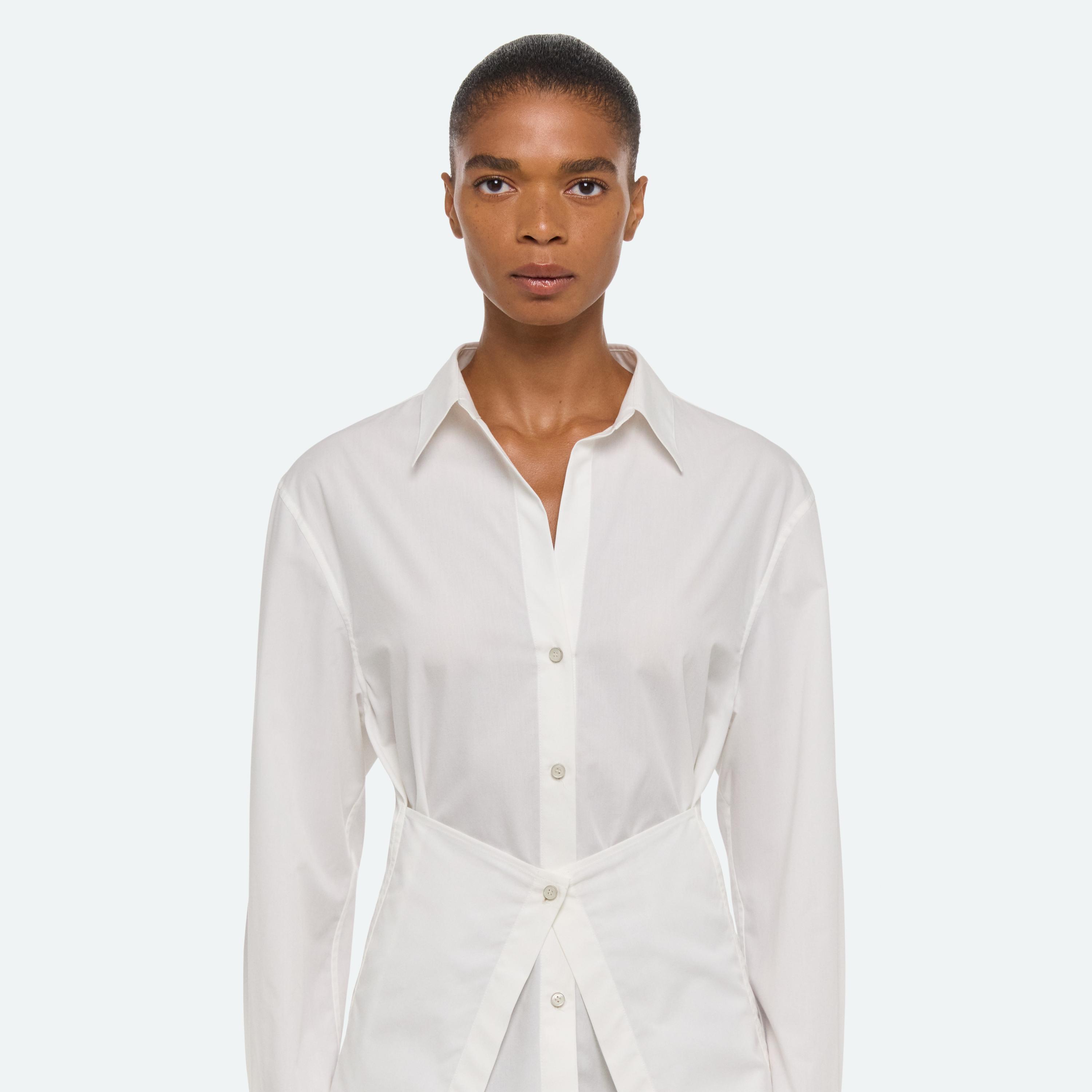 Button-front shirt in soft cotton poplin. An attached panel wraps around the waist in the front or back, creating a more fitted look.