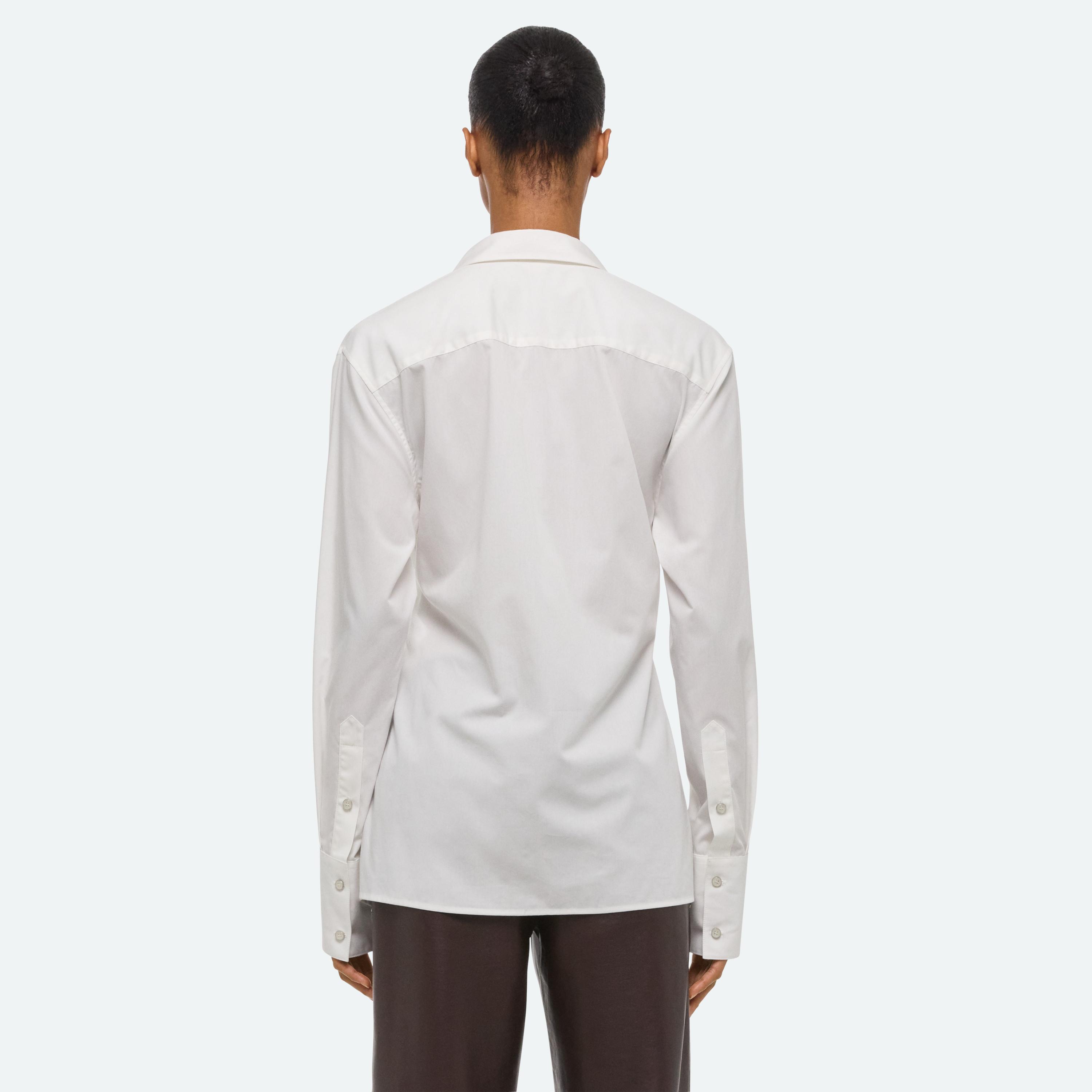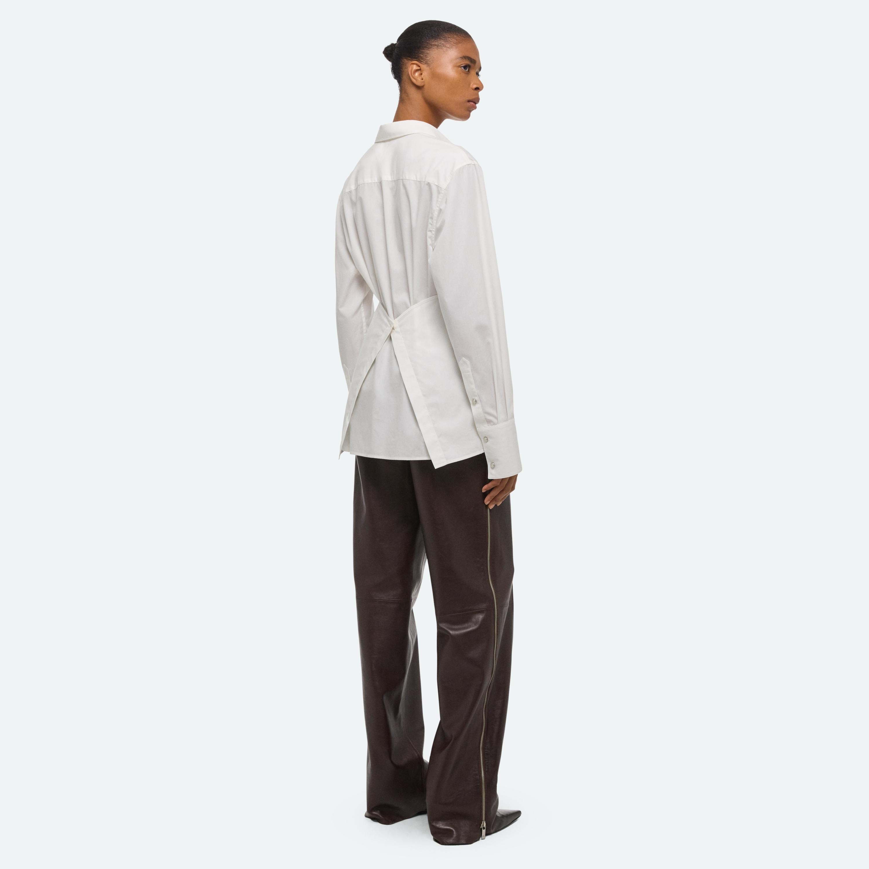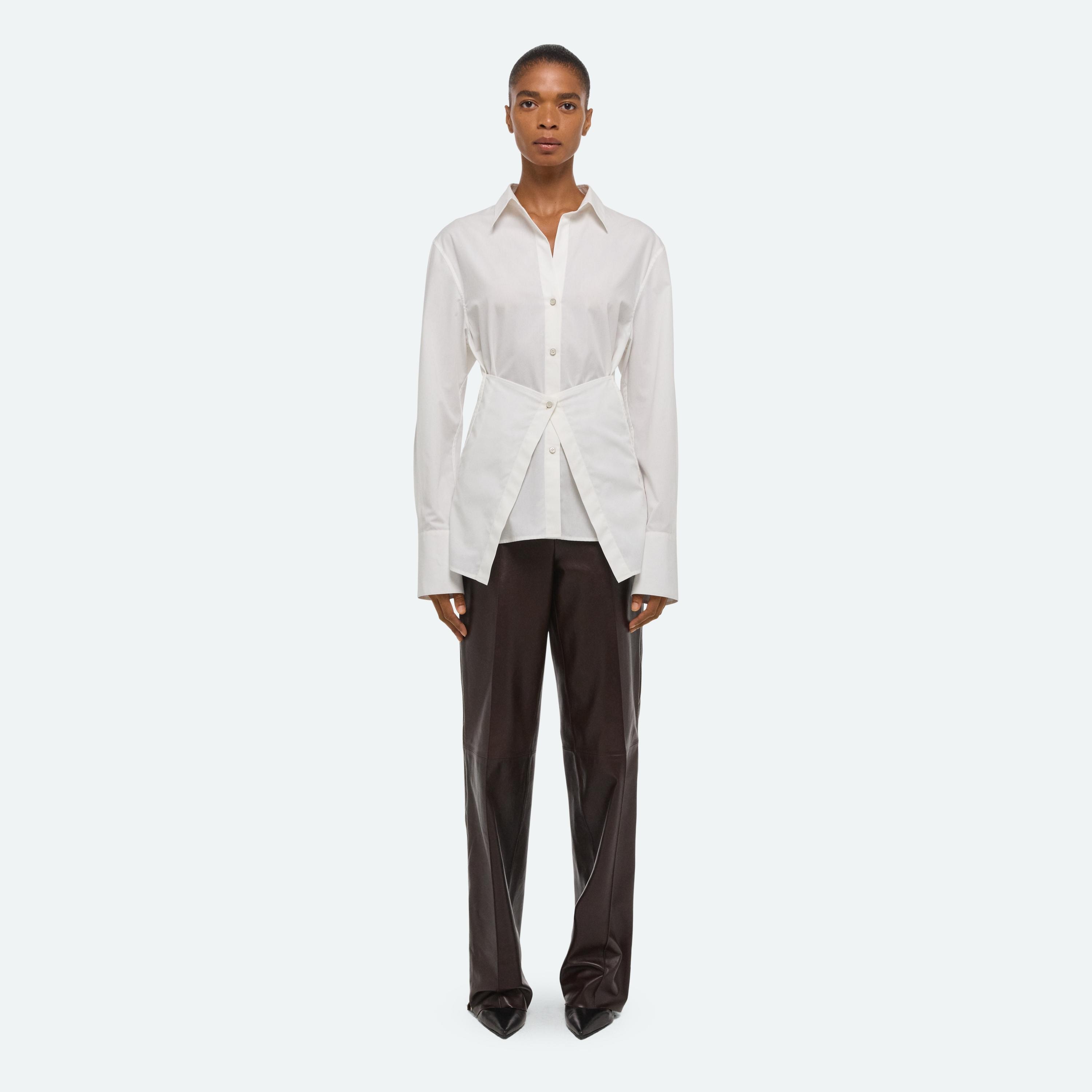 Button-front shirt in soft cotton poplin. An attached panel wraps around the waist in the front or back, creating a more fitted look.