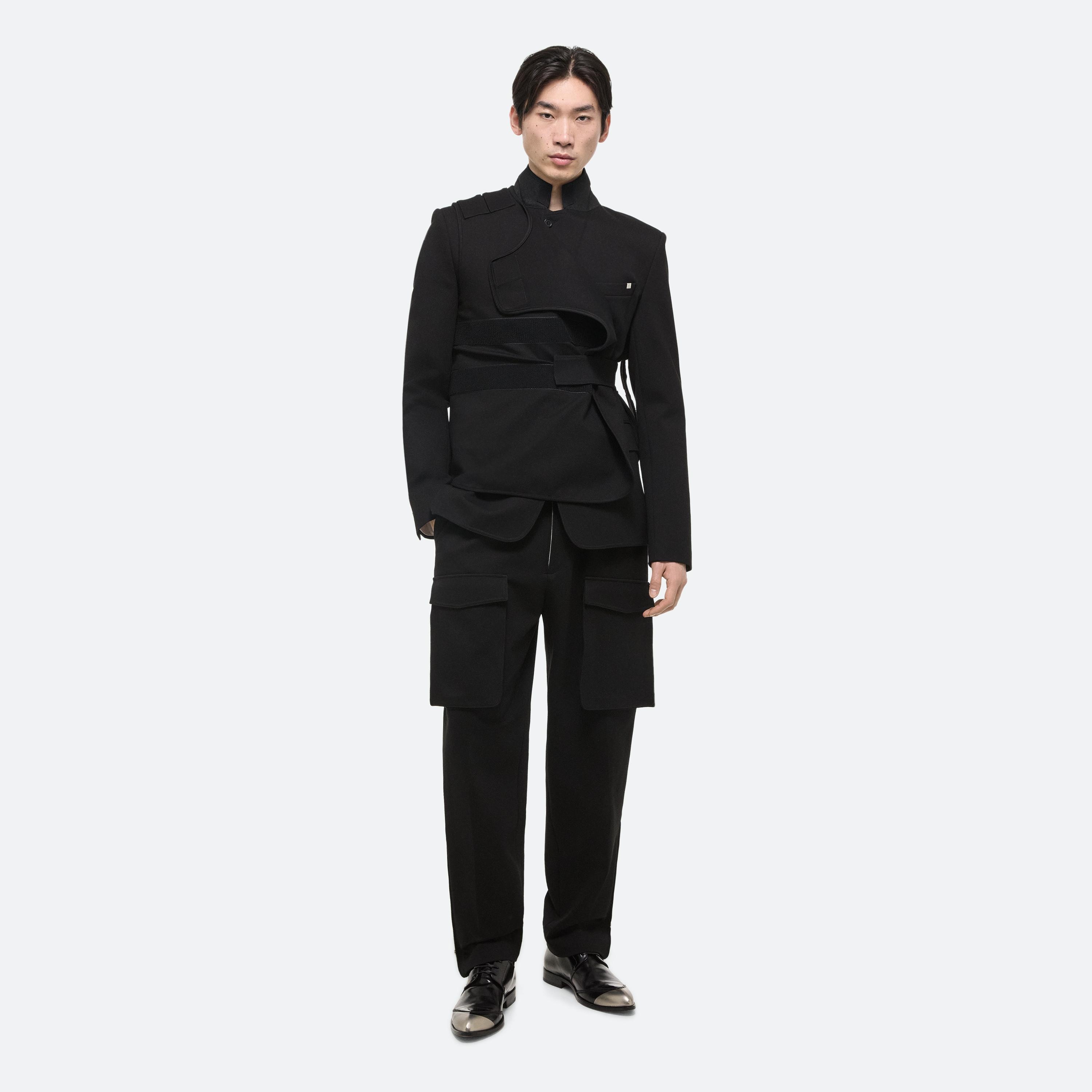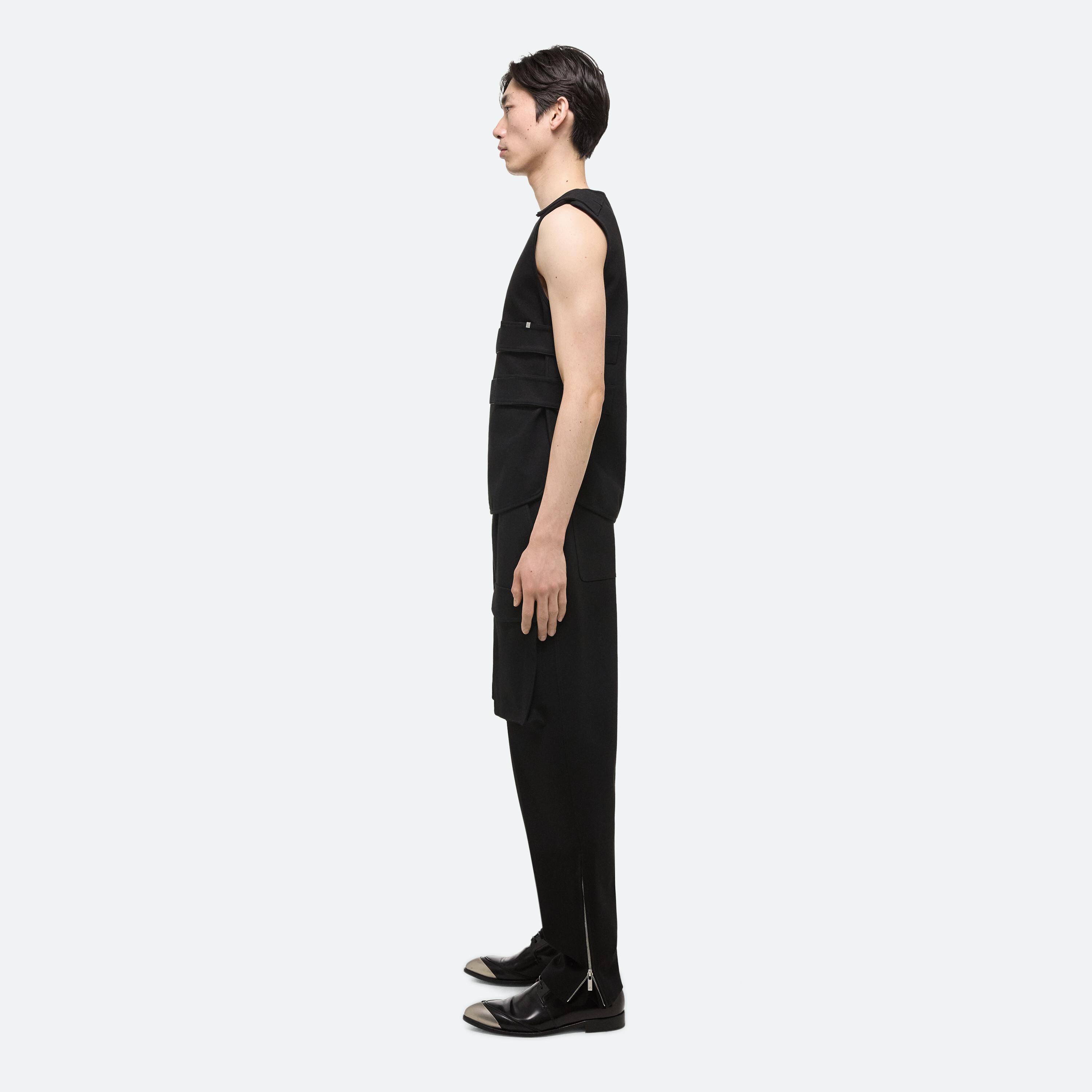 Sleeveless vest in structured ponte. This archival update incorporates functional details from tactical vests, with plush velcro tabs that can be cinched closed or left open for layered styling.