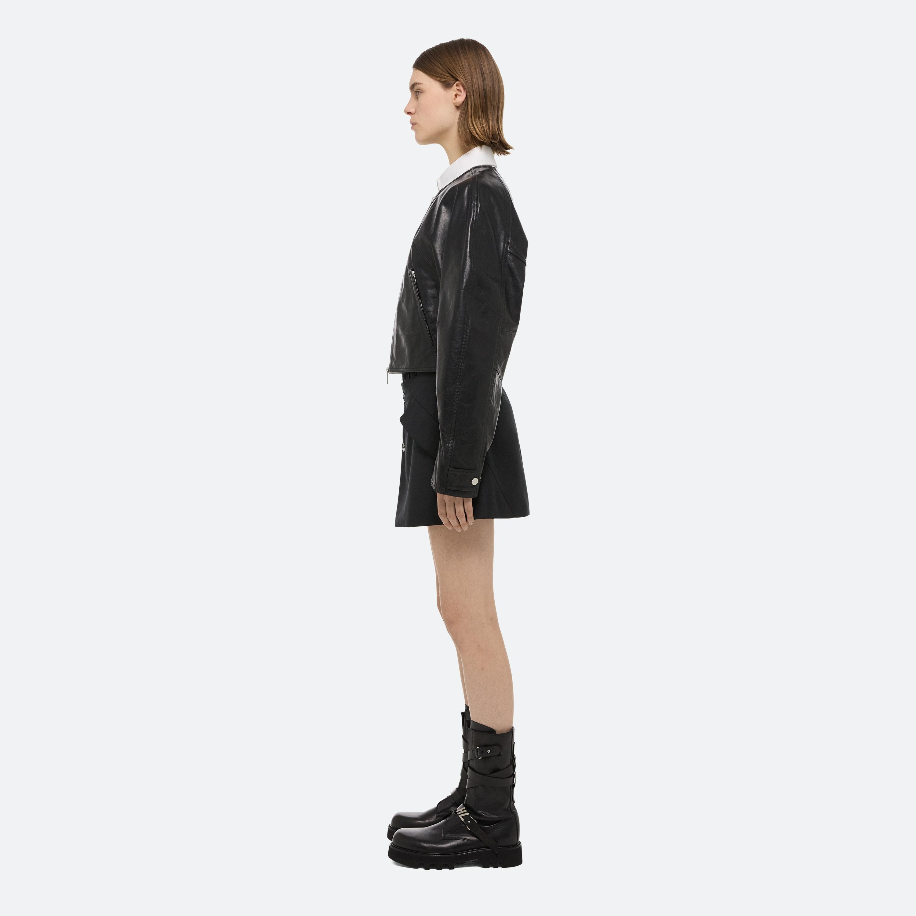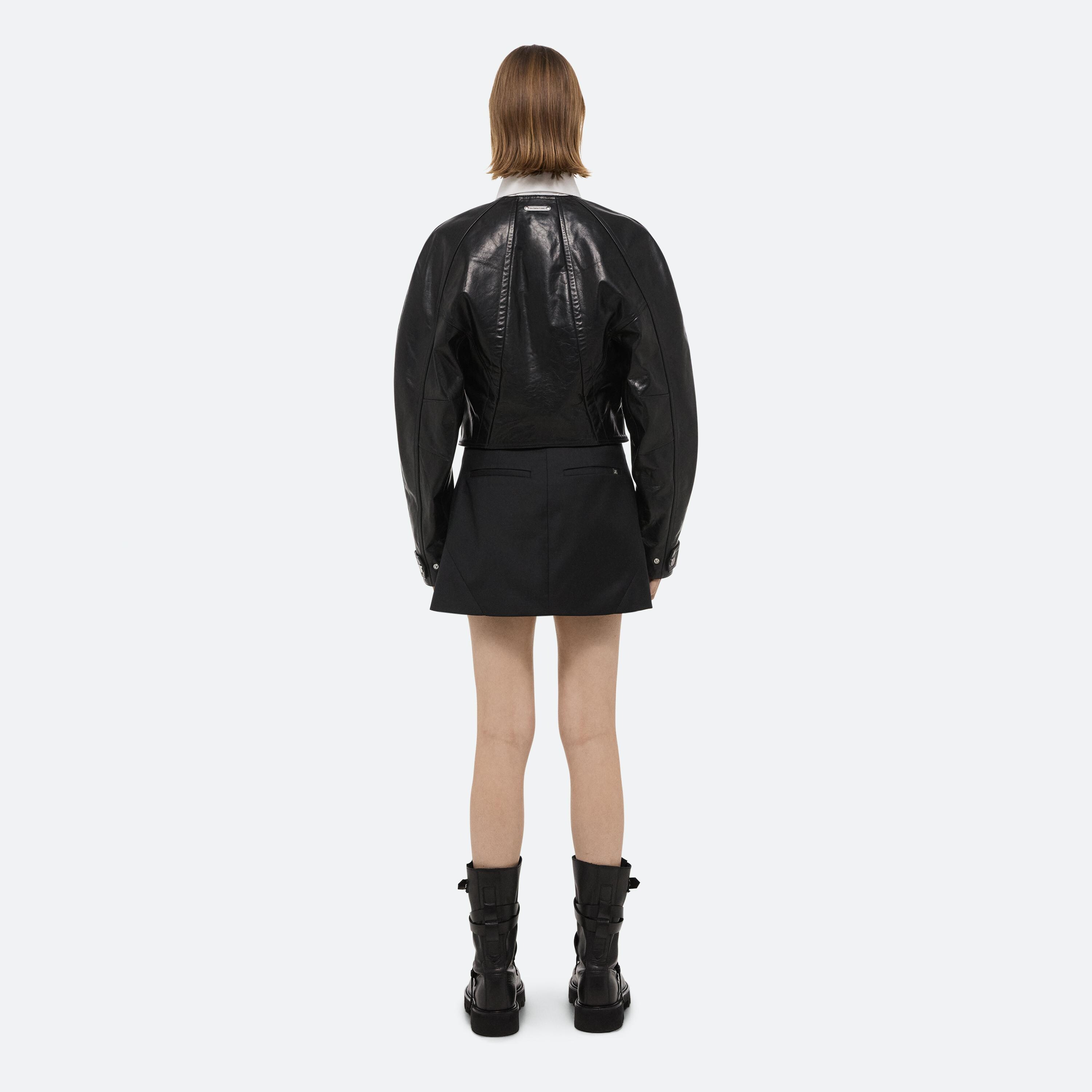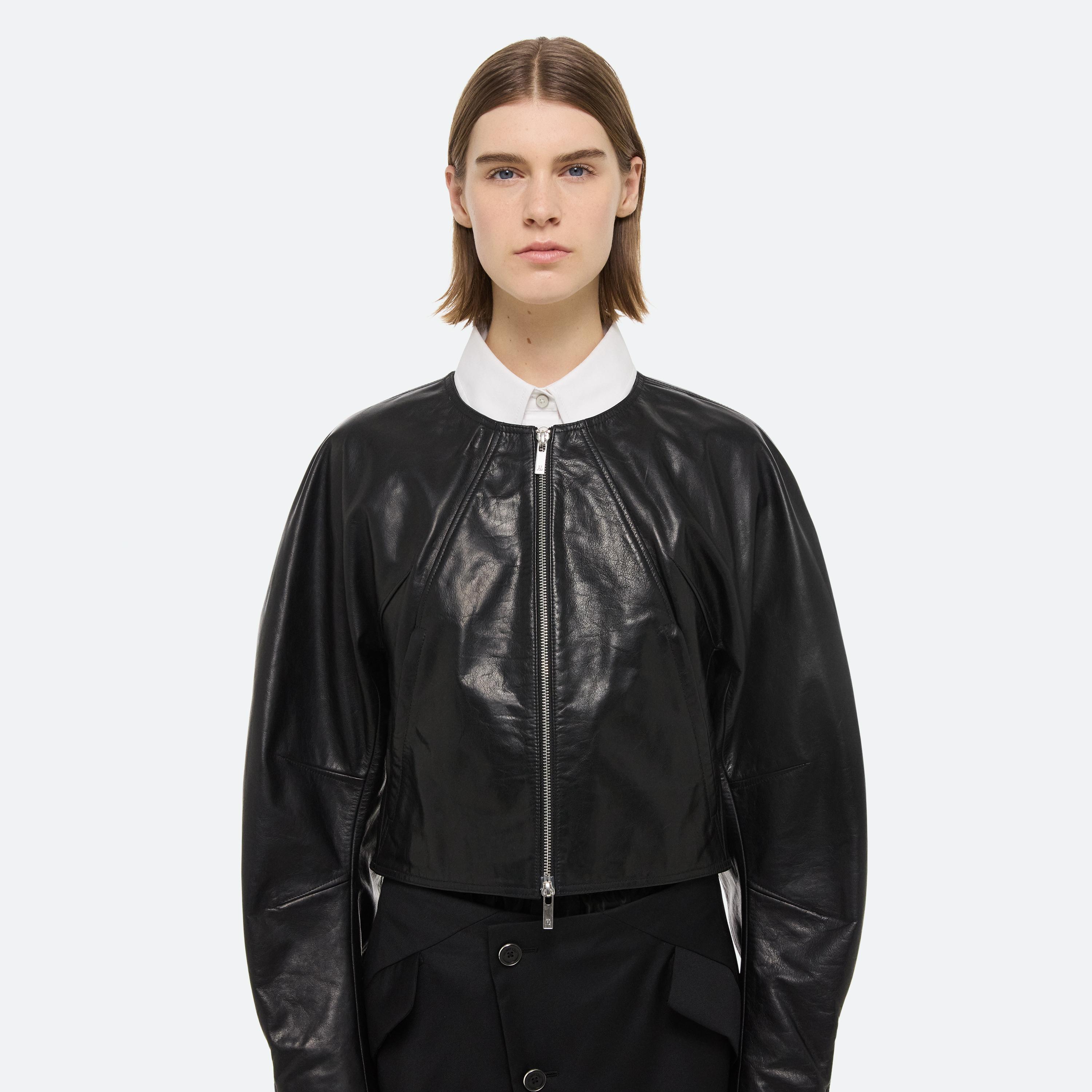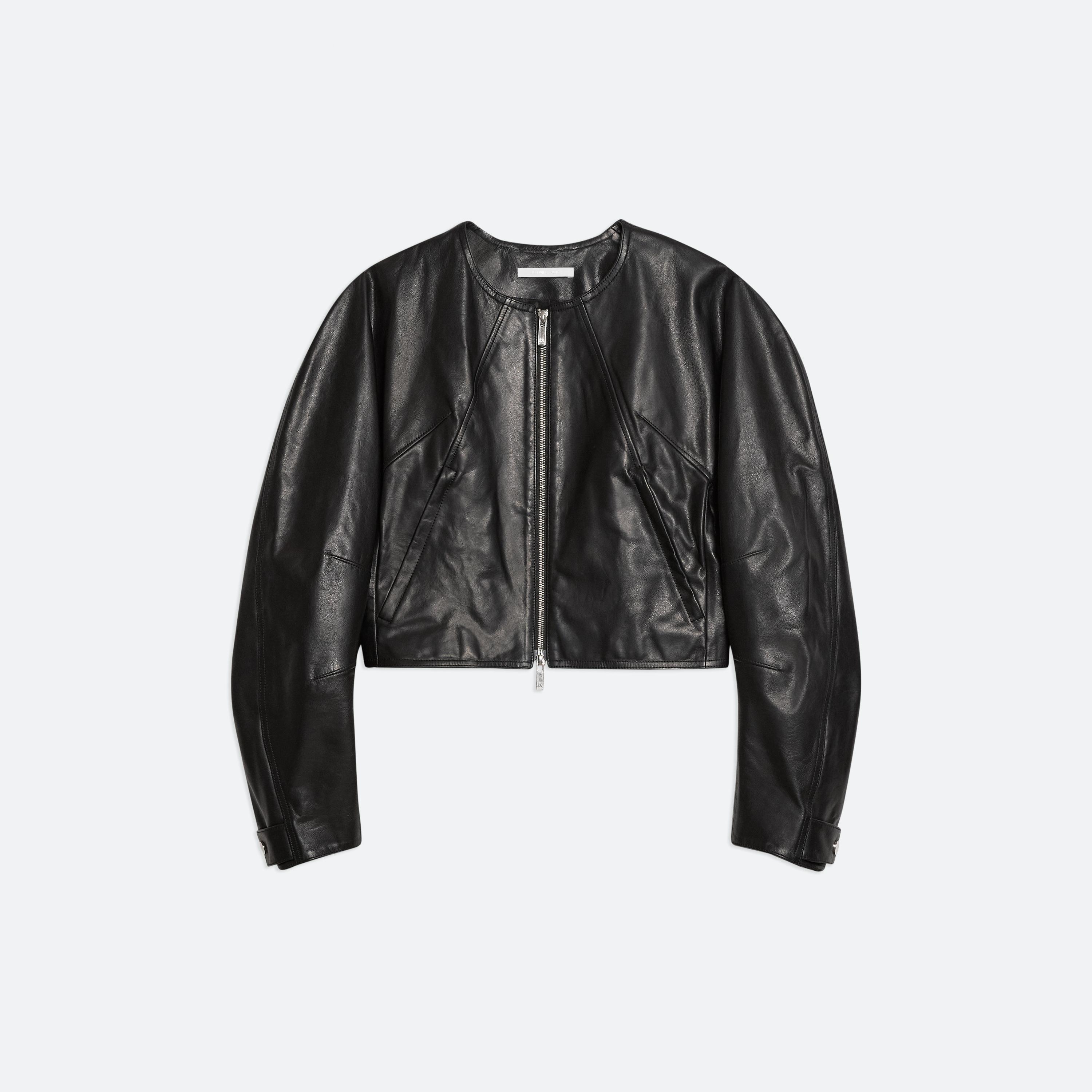 Collarless leather jacket with exaggerated sleeves. Inspired by vintage parachute designs, with articulated seams that create a rounded shoulder and a fitted waist.