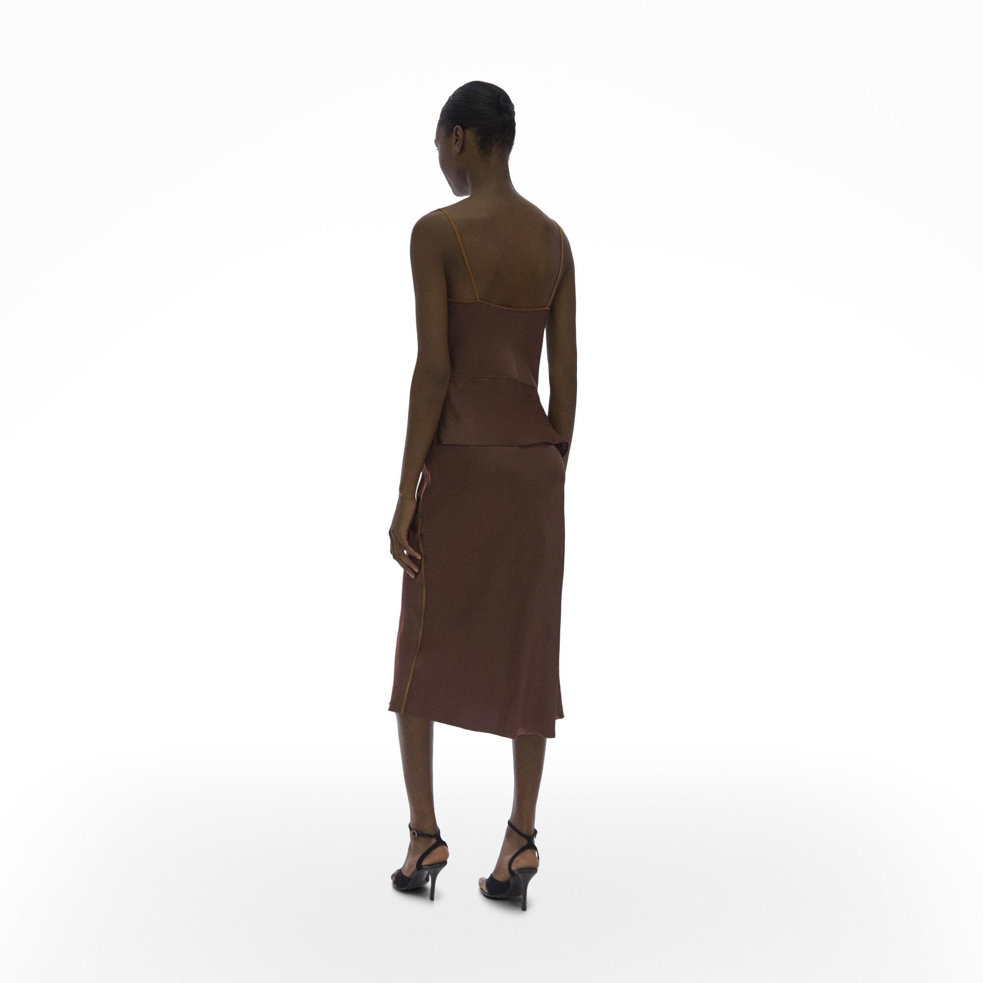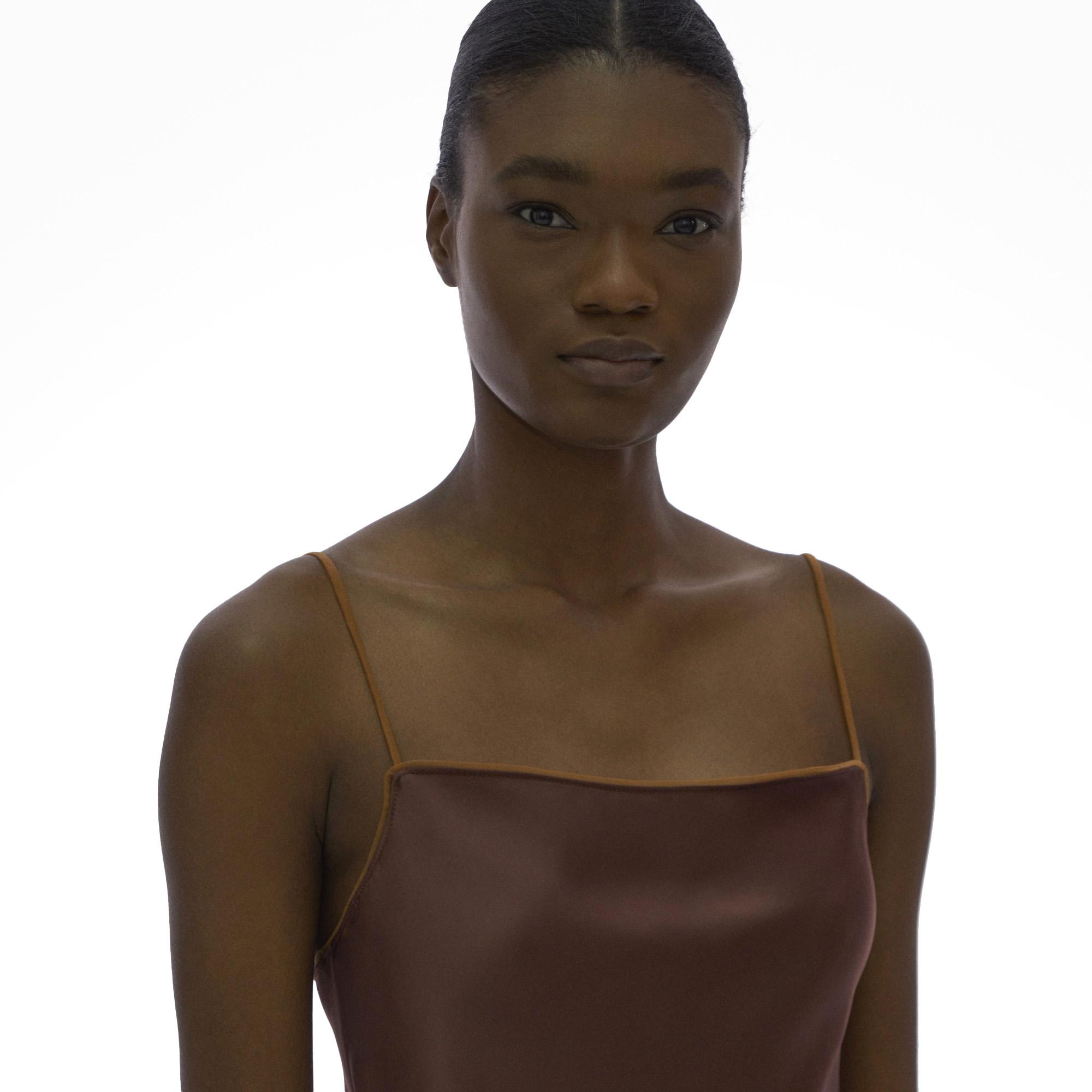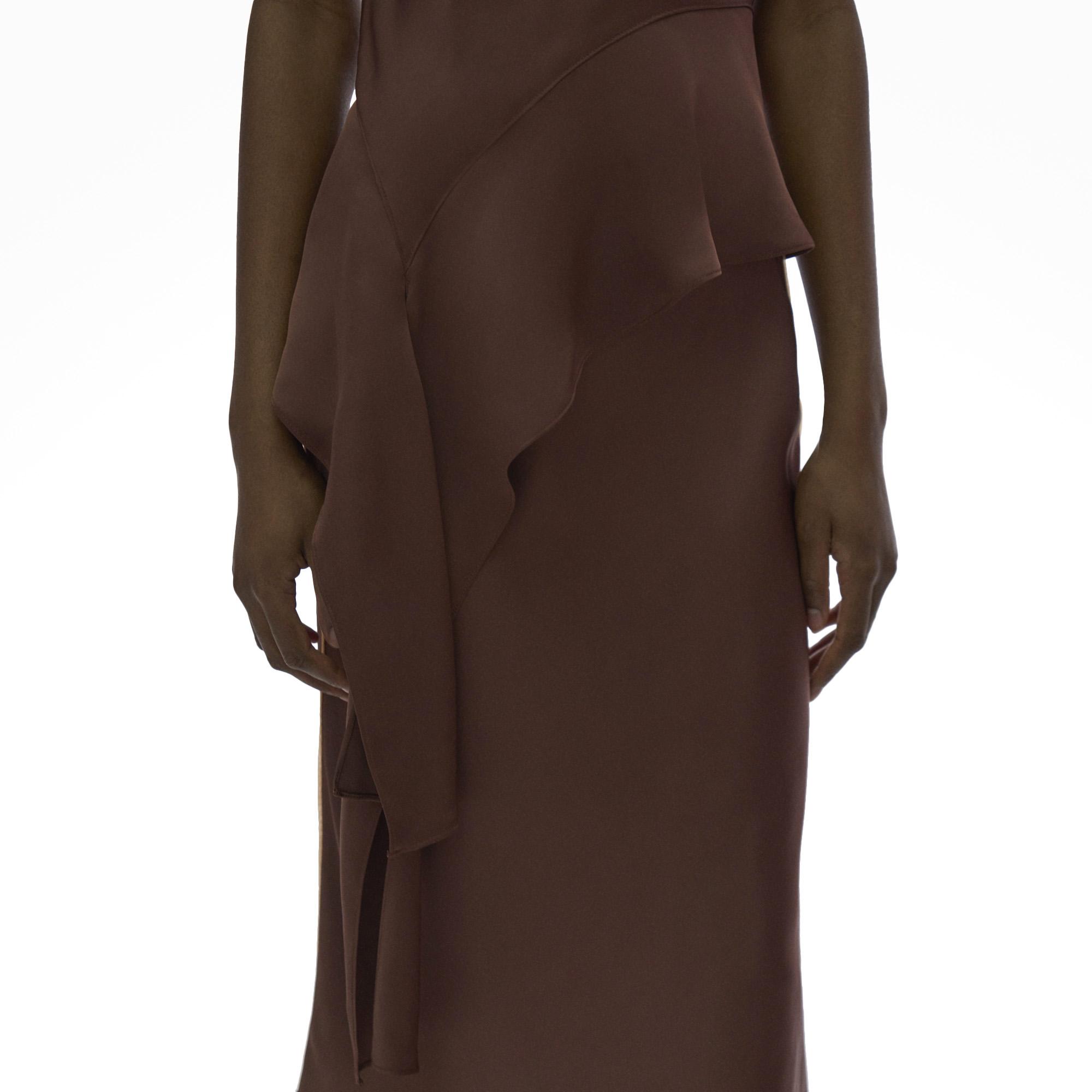 The Helmut Lang Assymetric Satin Top is a sleeveless double satin top with an asymmetric draped hem.