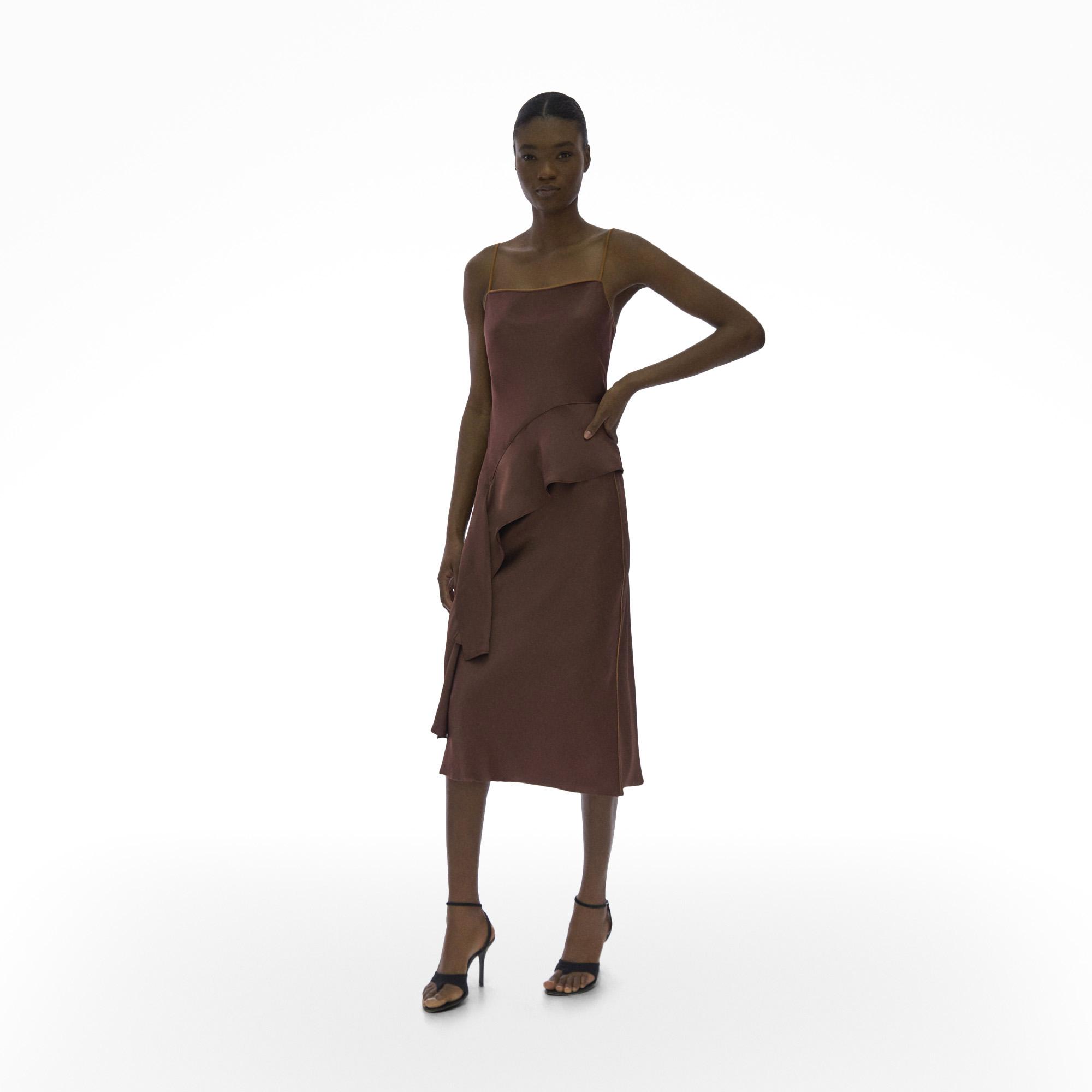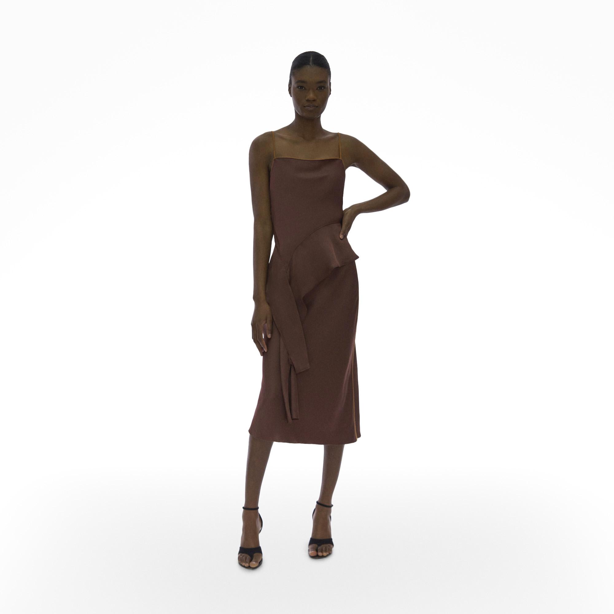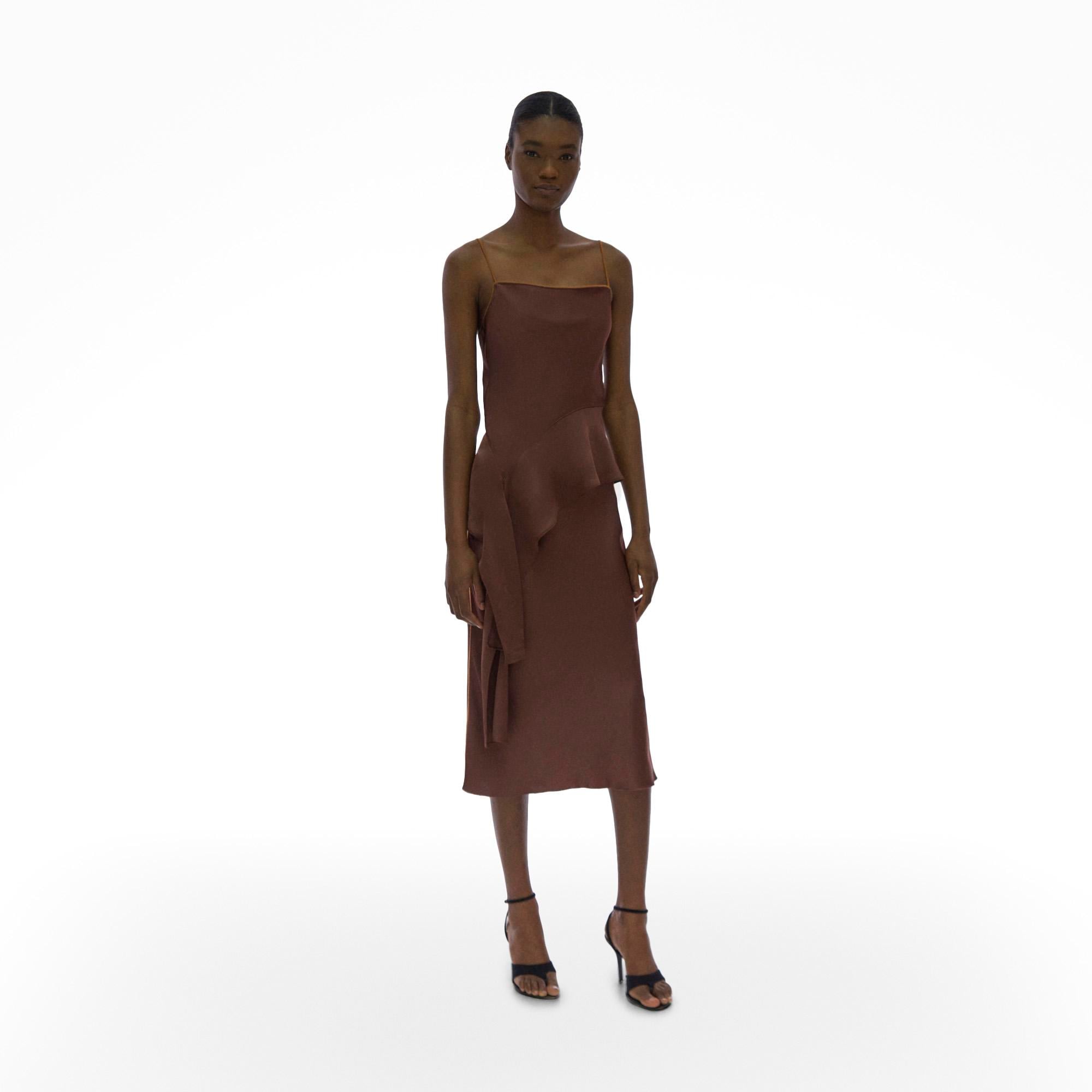 The Helmut Lang Assymetric Satin Top is a sleeveless double satin top with an asymmetric draped hem.
