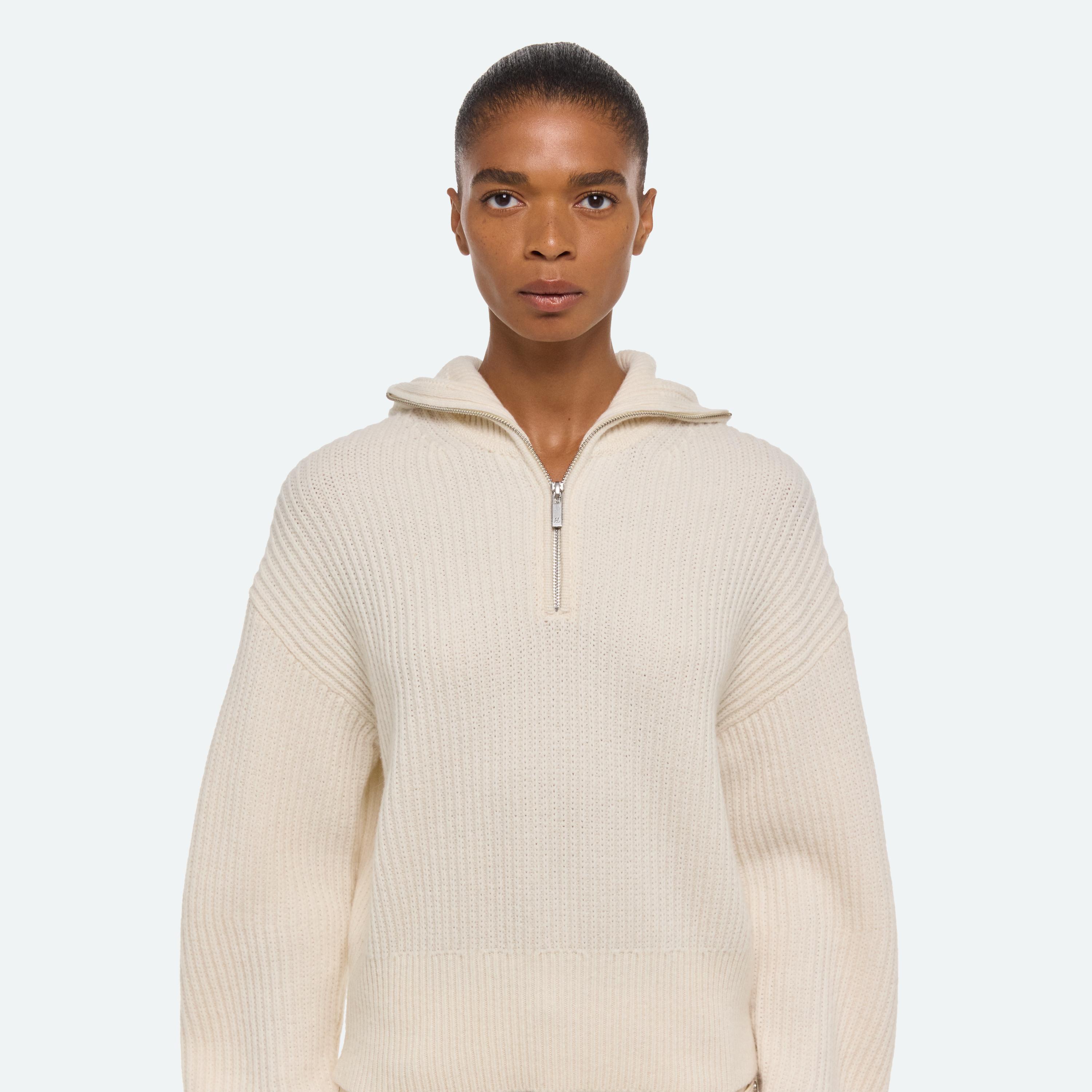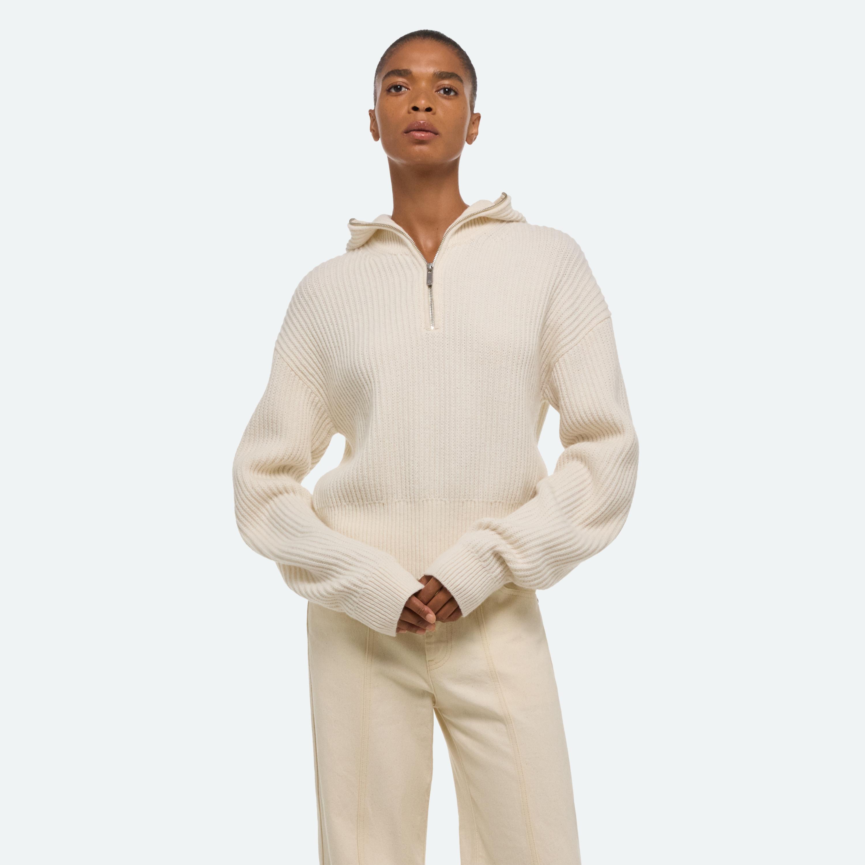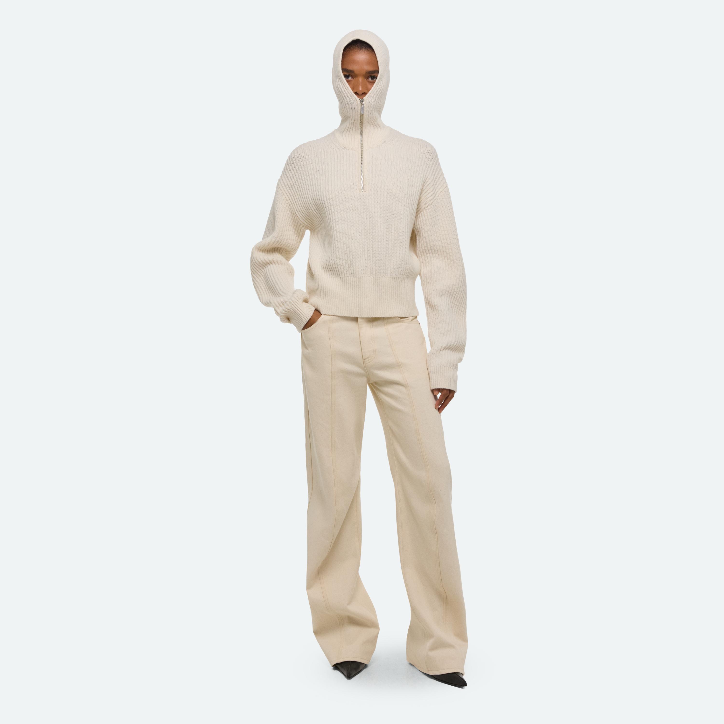 Quarter-zip sweater with fitted balaclava hood.