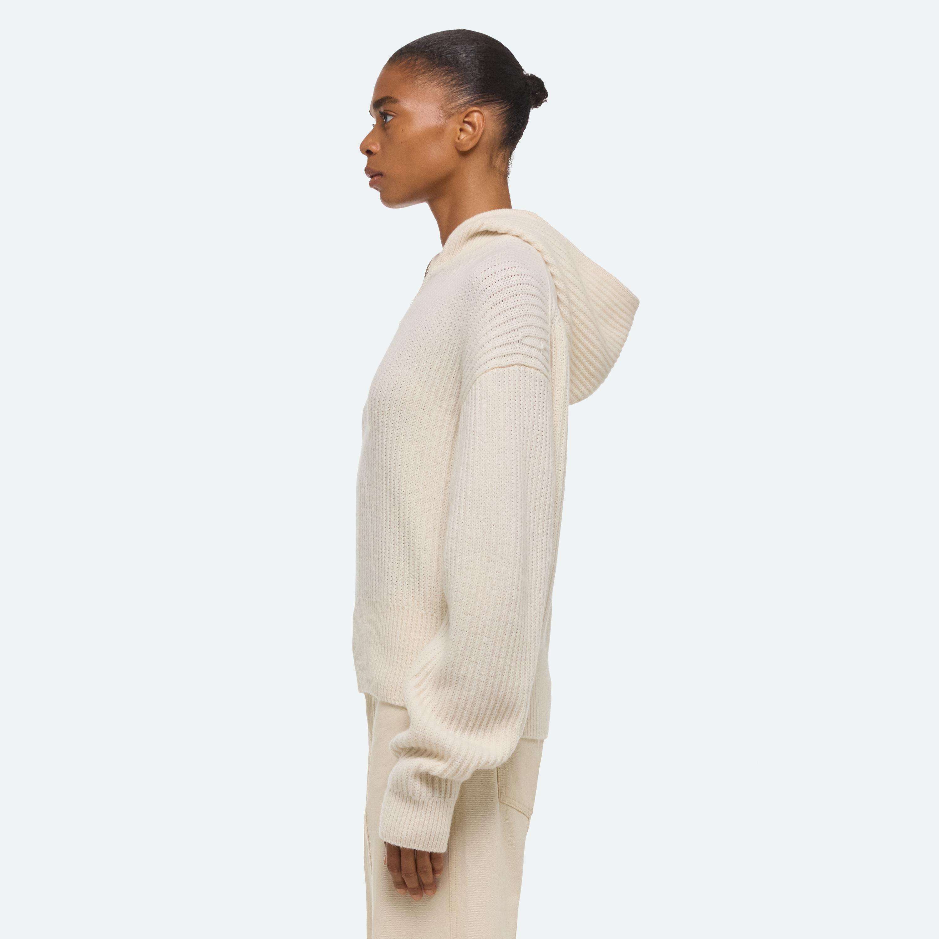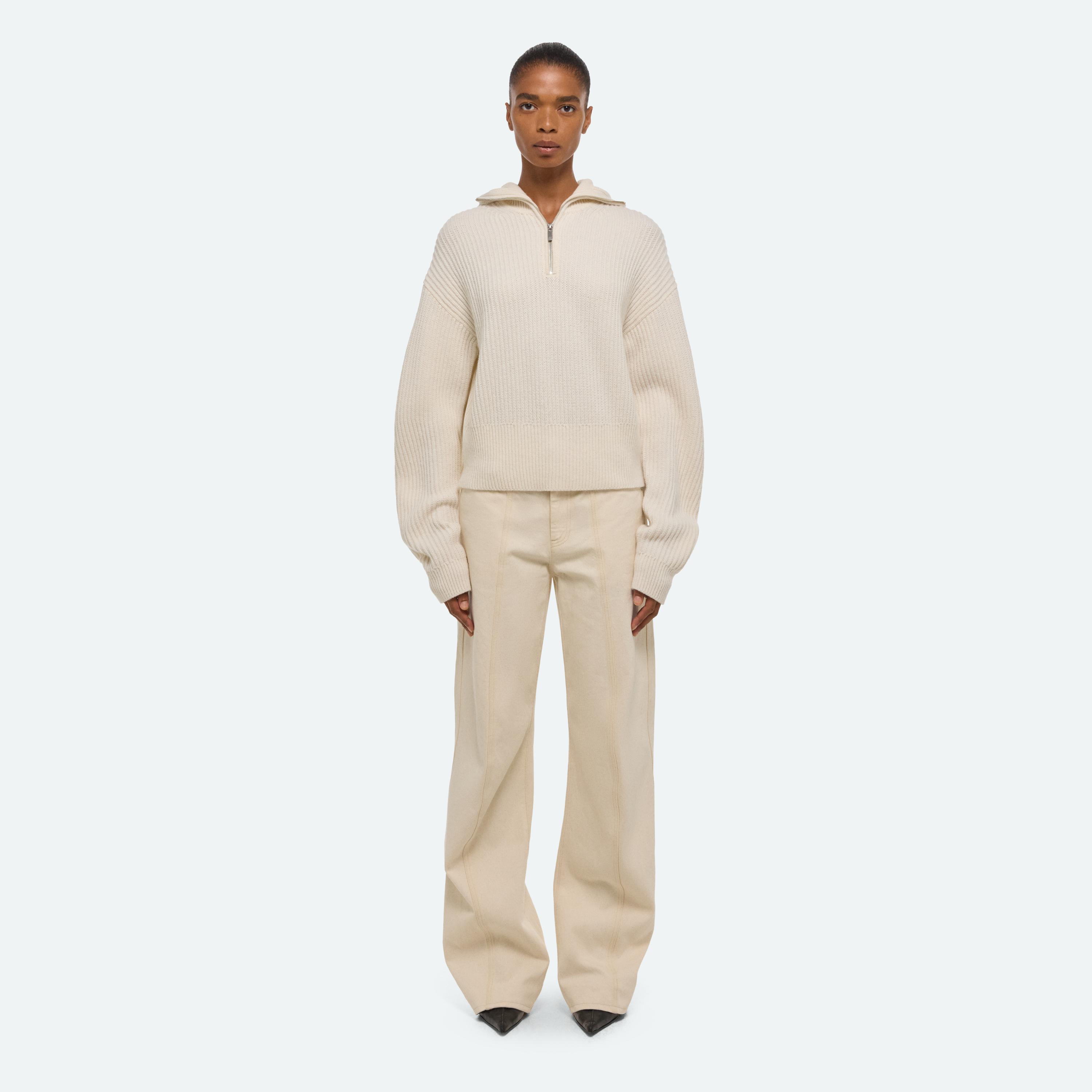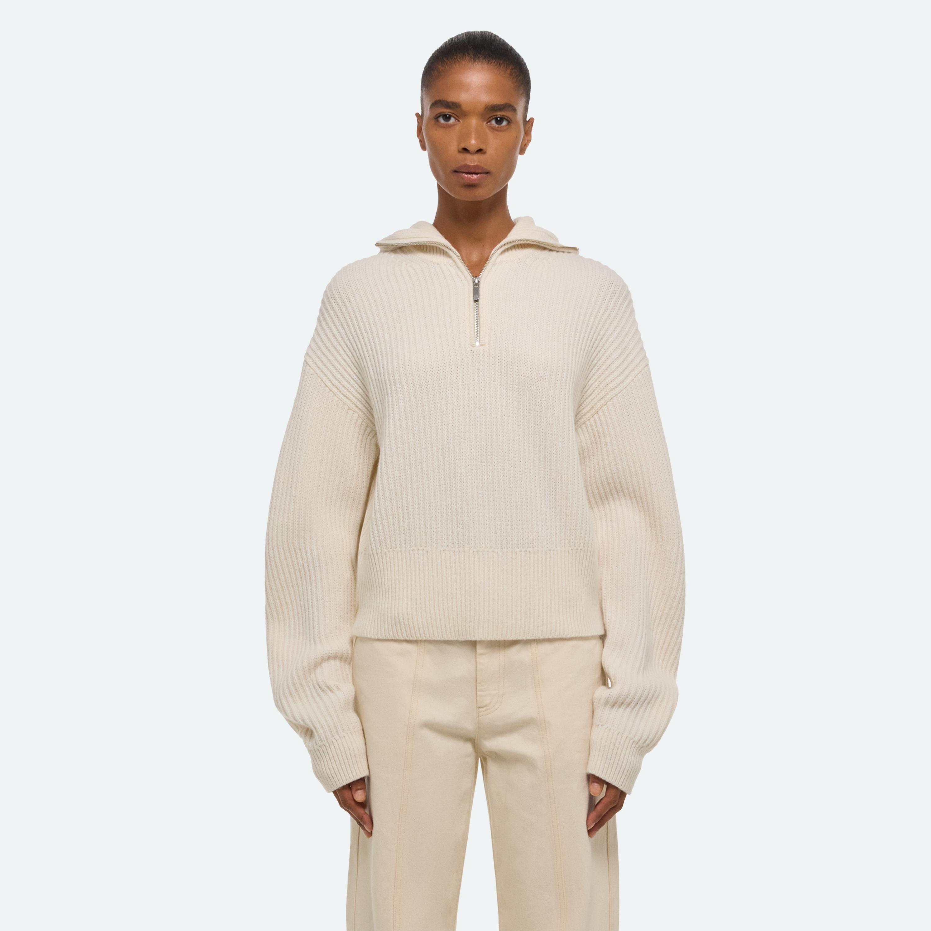 Quarter-zip sweater with fitted balaclava hood.