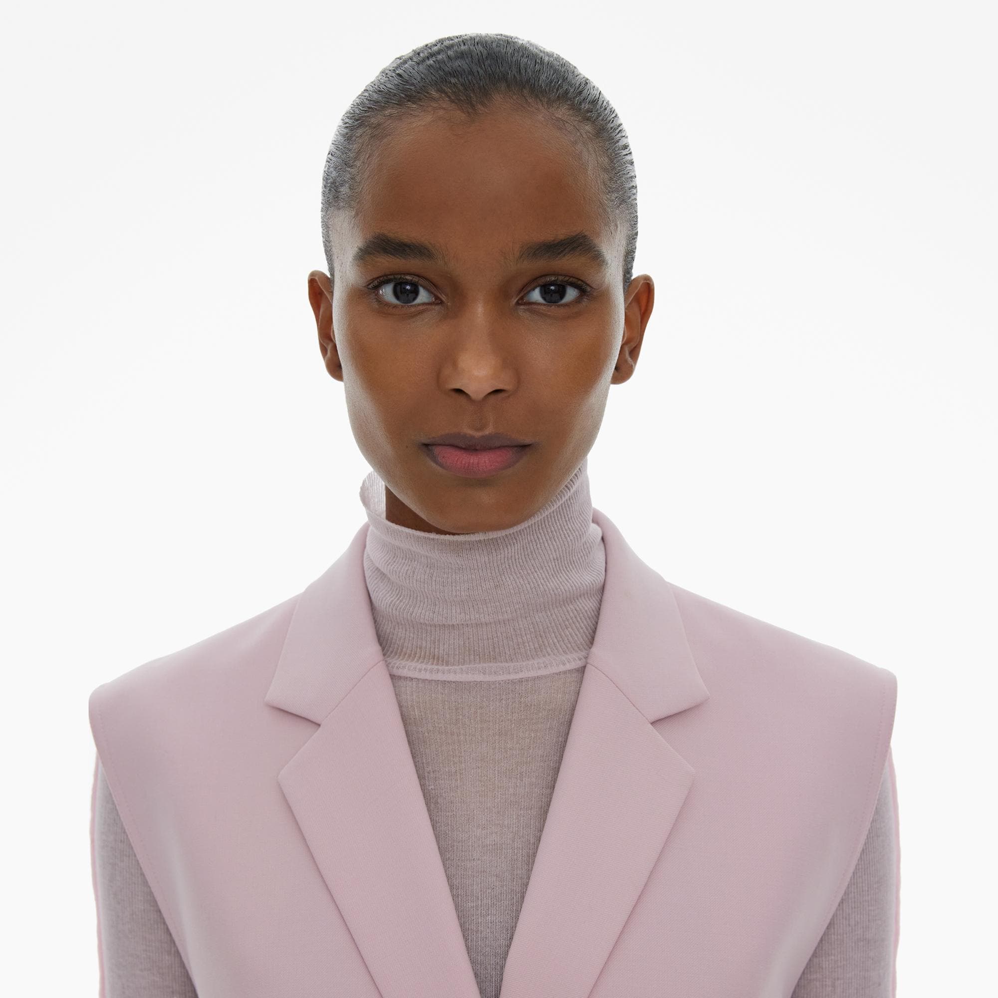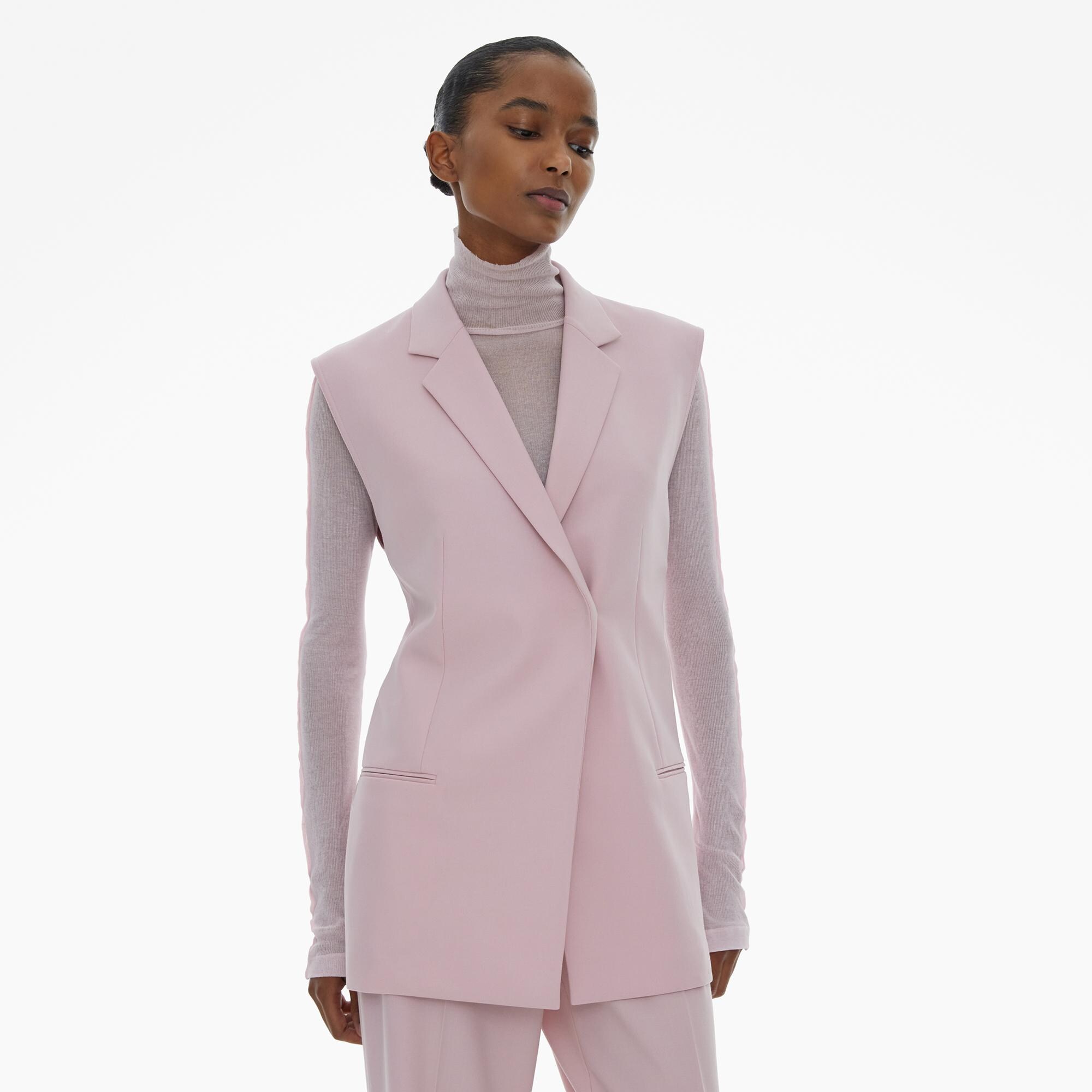 The Helmut Lang Belted Blazer Vest is a tailored sleeveless style in a stretch wool blend with notched lapels, welt pockets, and D-ring buckle belt at the back.