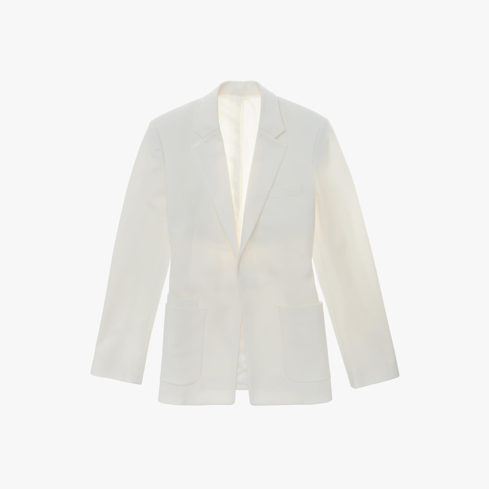 The Helmut Lang Belted Blazer is a tailored style in a stretch wool blend with notched lapels, layered patch pockets, and D-ring buckle belt at the back.