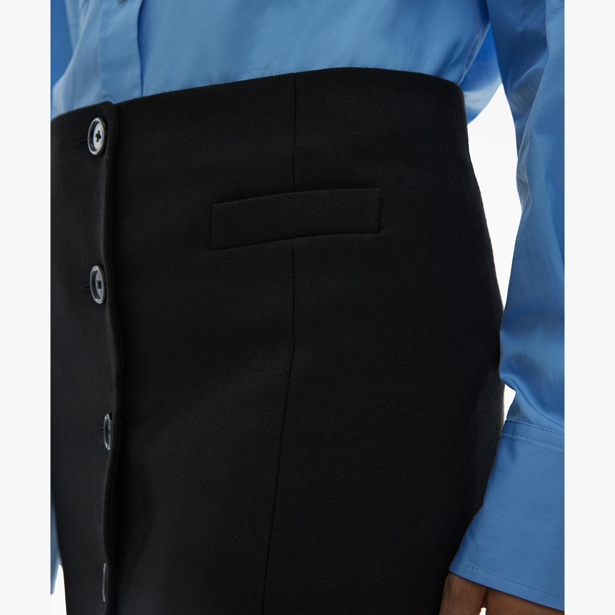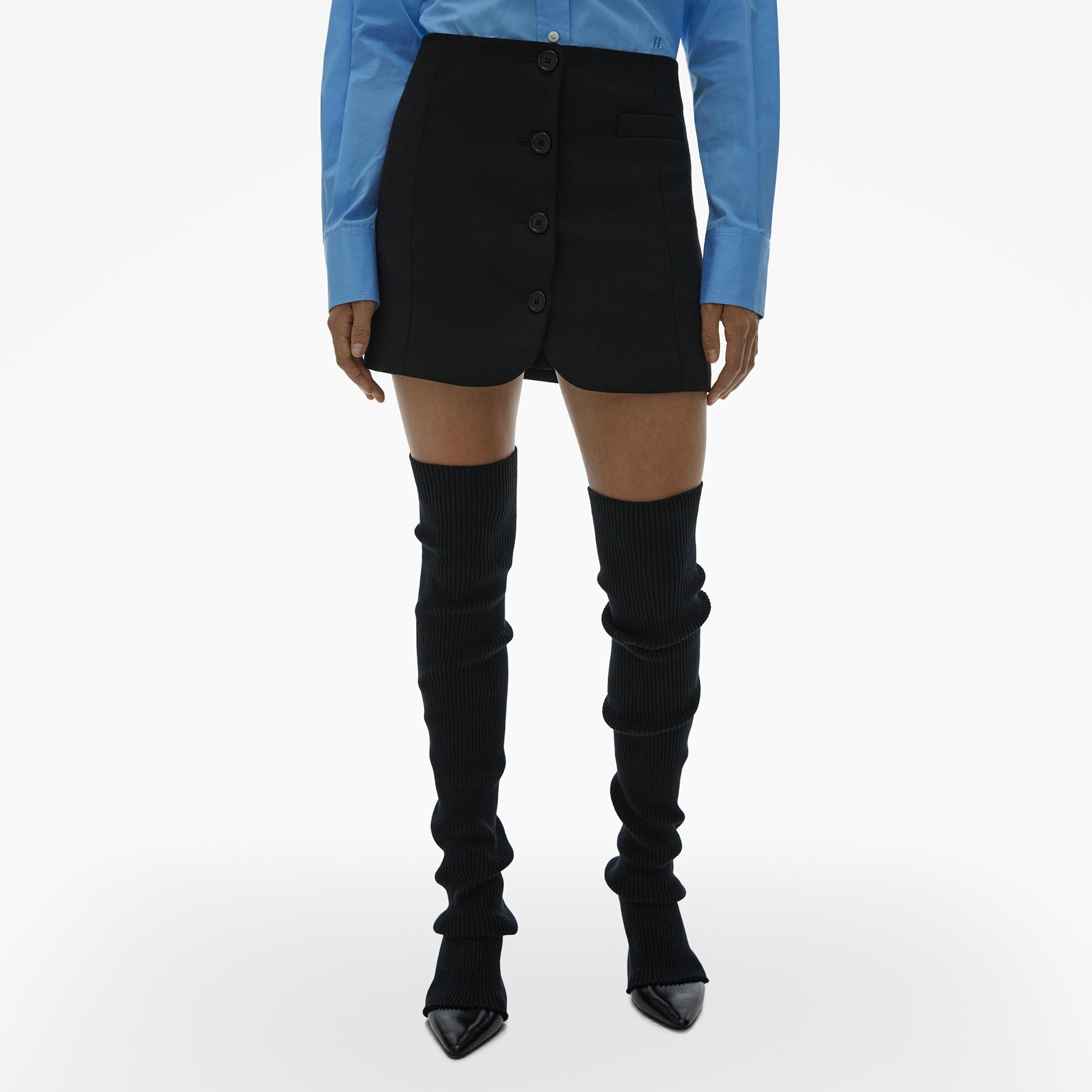 The Helmut Lang Blazer Mini Skirt in stretch wool twill with button front closures.