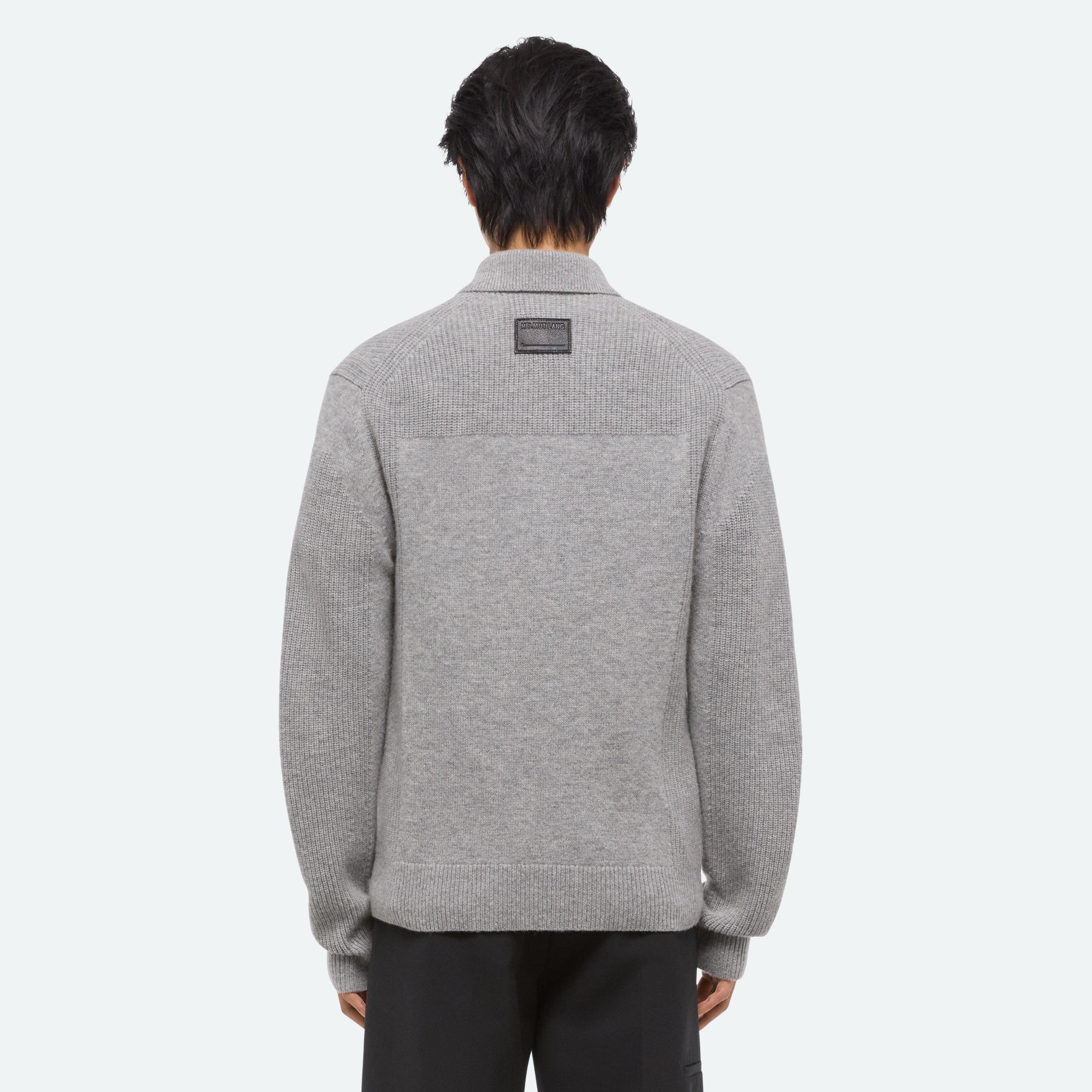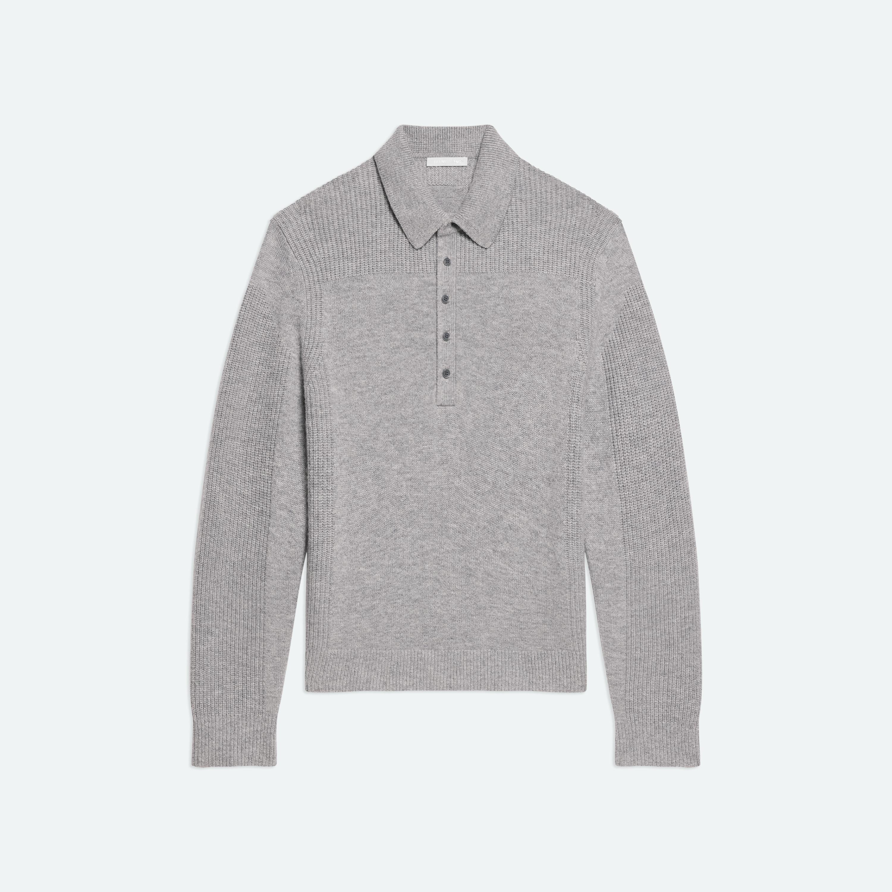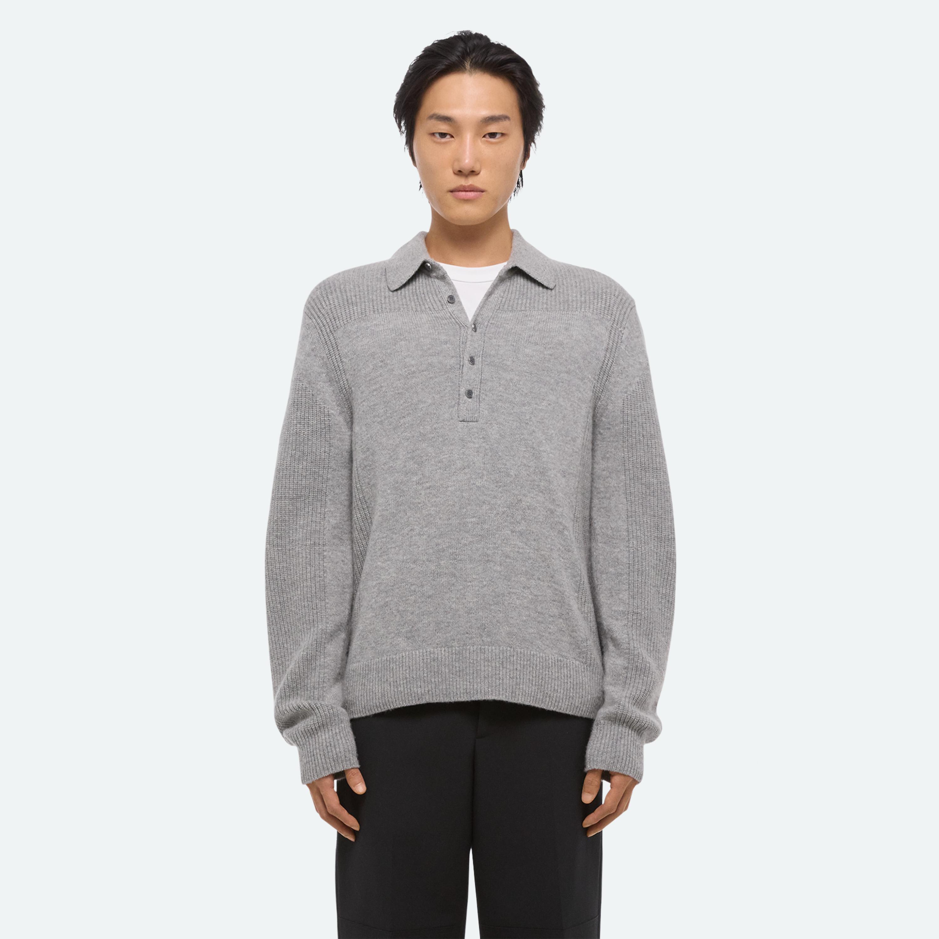Midweight polo sweater with contrasting shoulder detail. Finished with an elongated placket and metal-wrapped buttons.