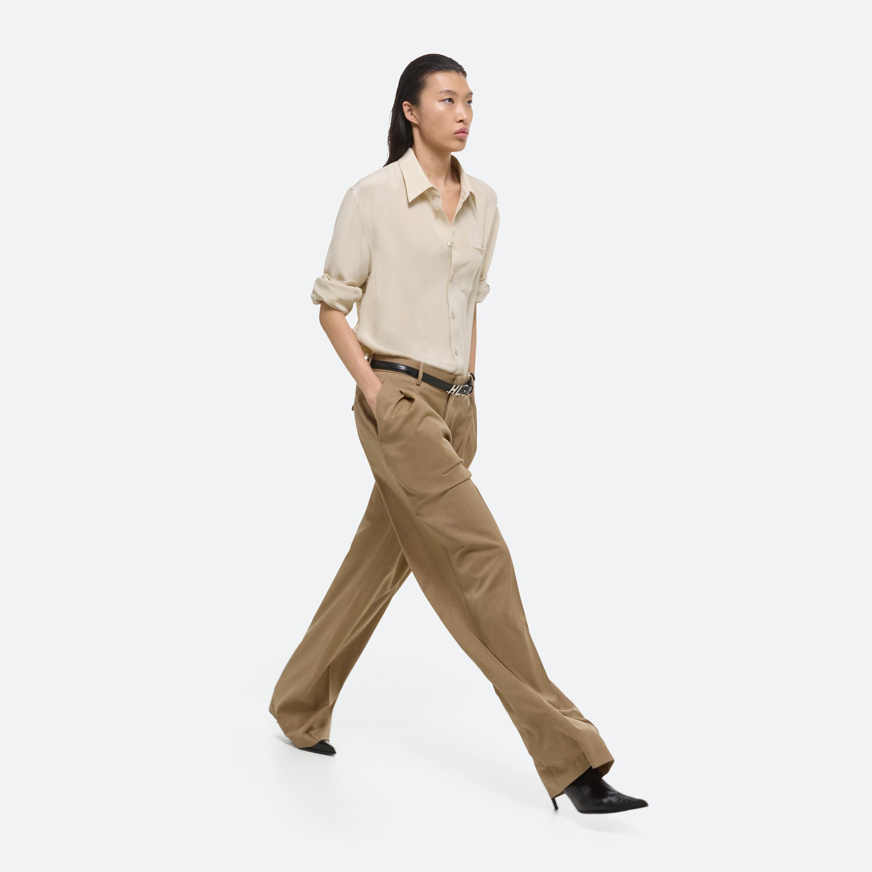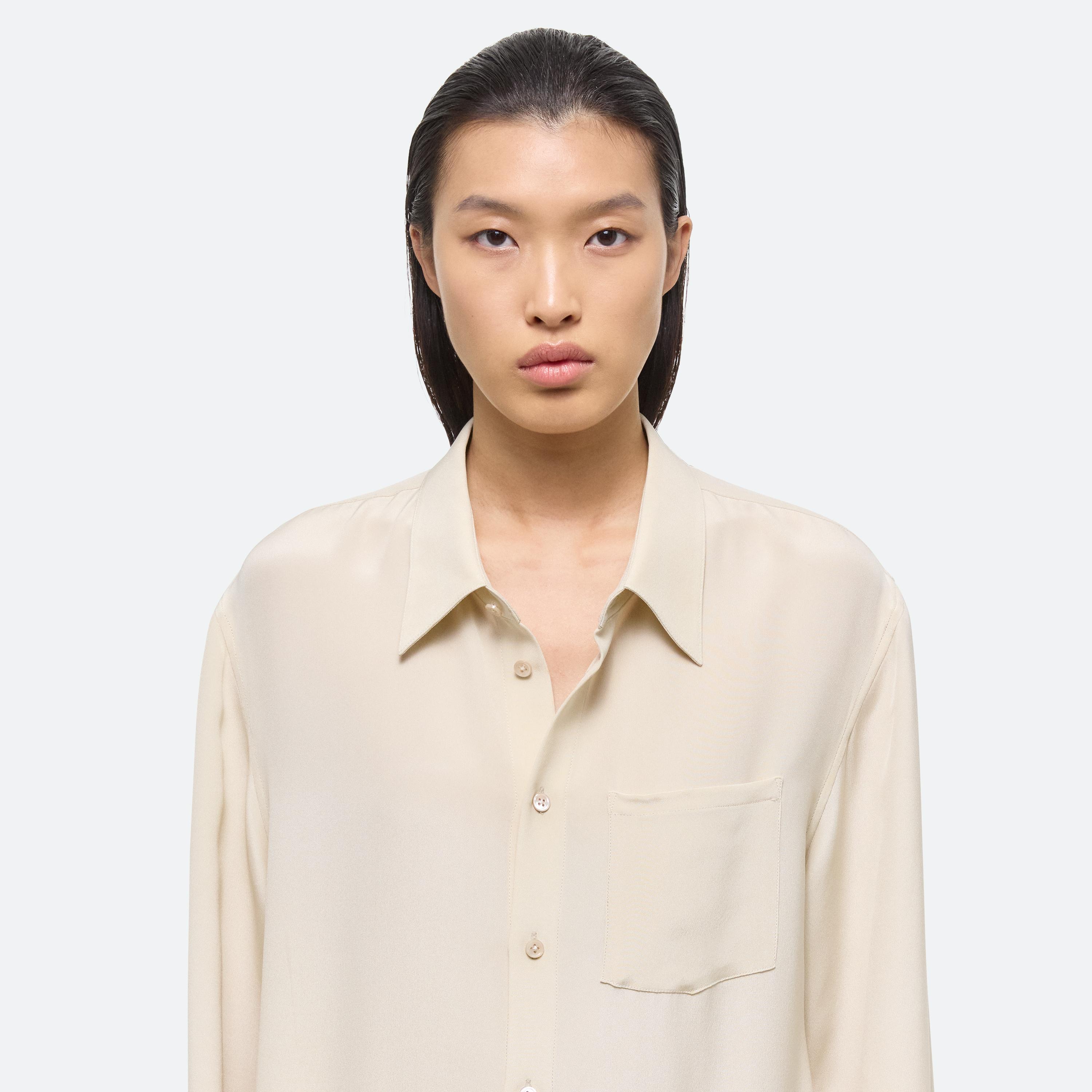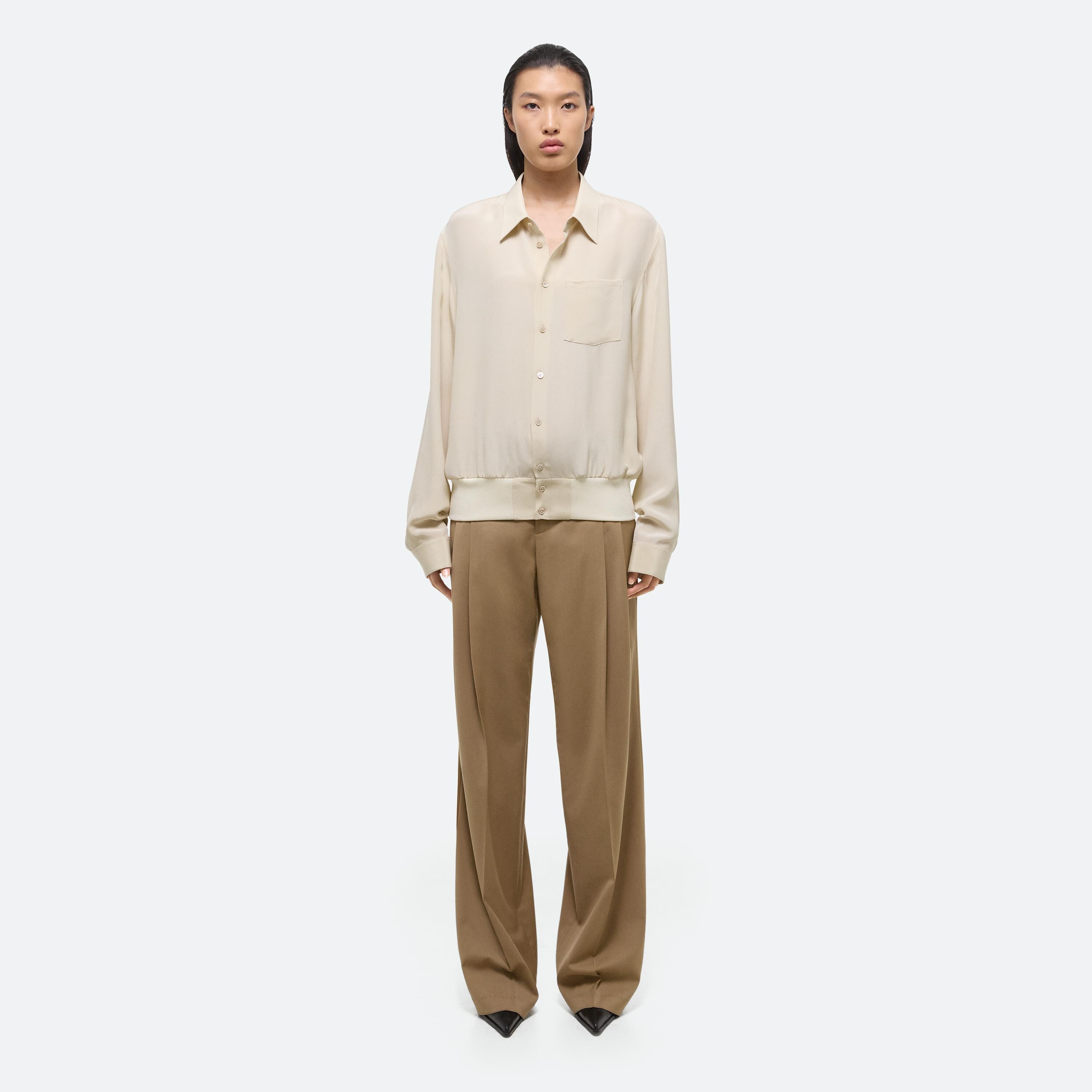 Silk button down shirt with bomber jacket-inspired ribbed hem.