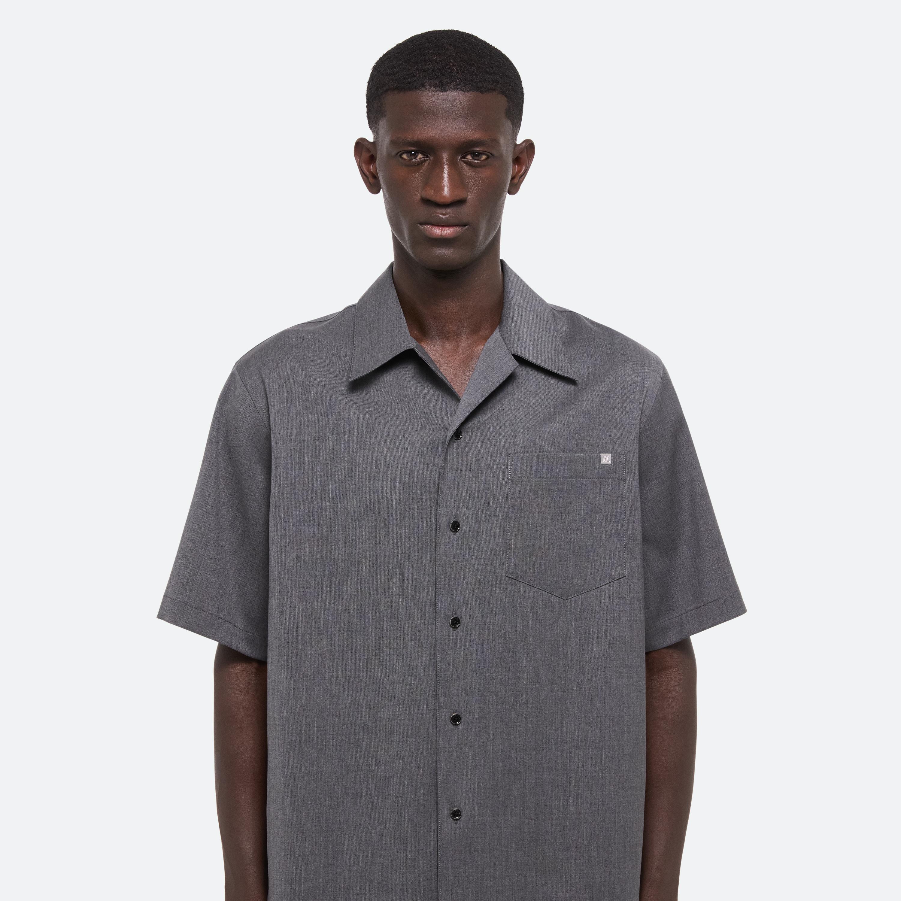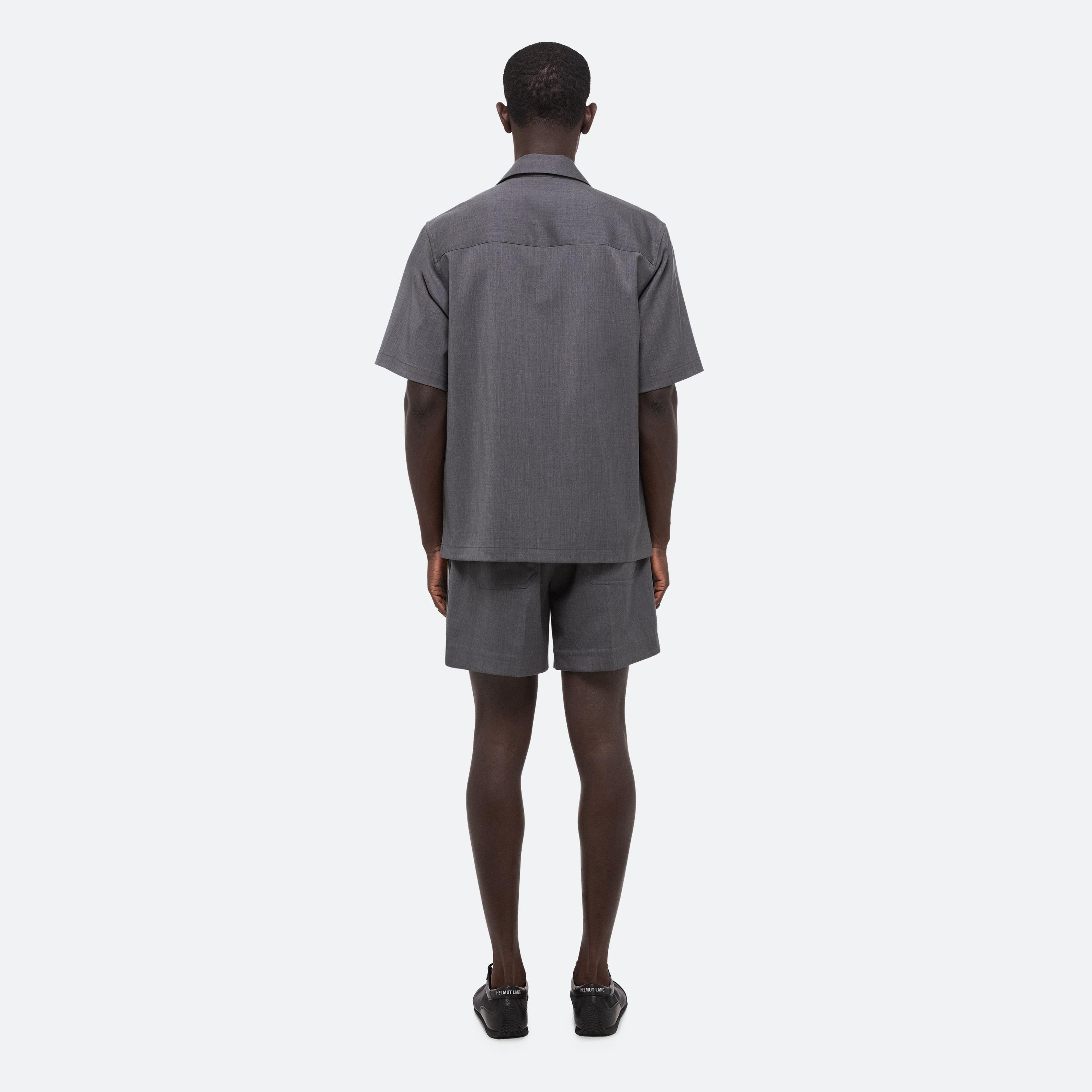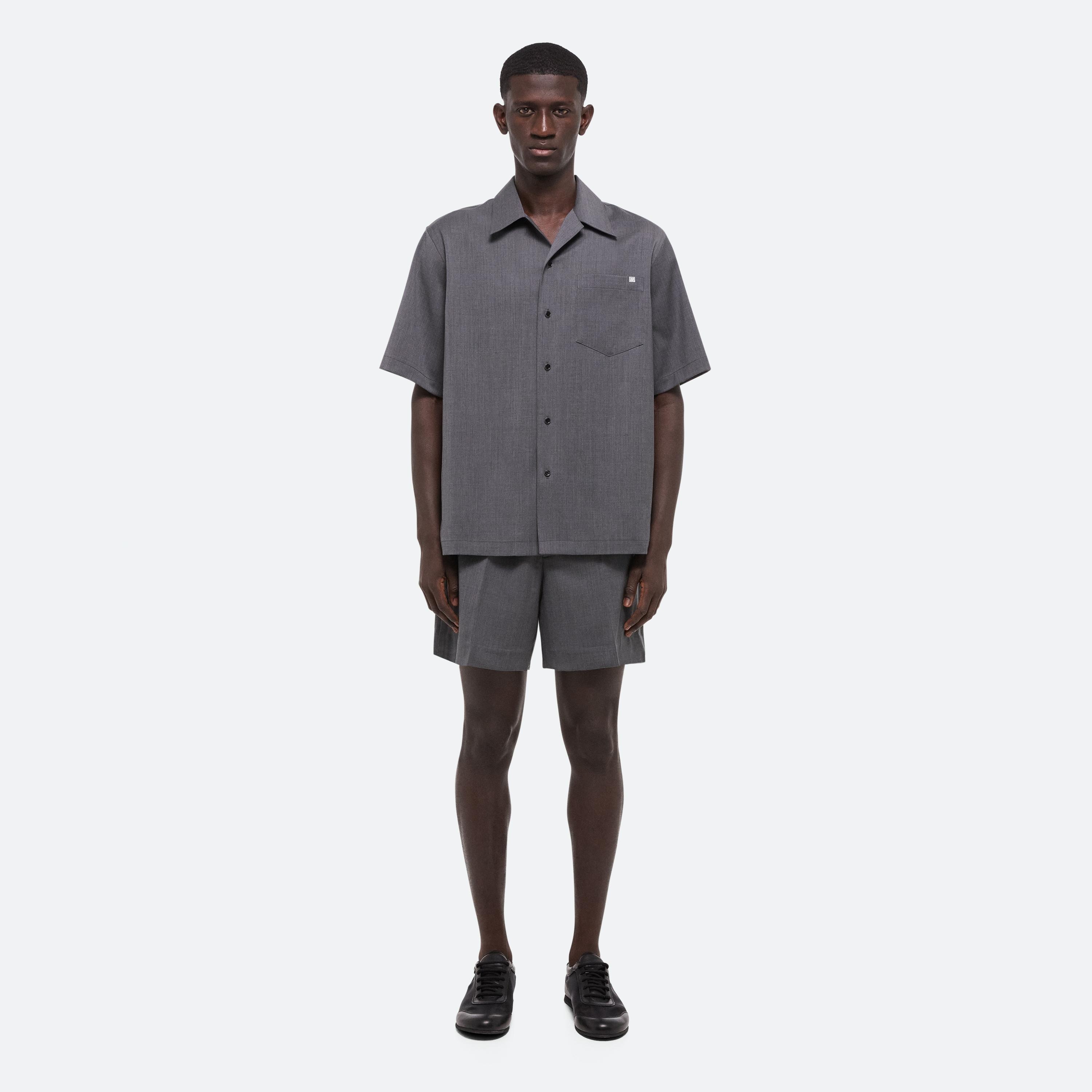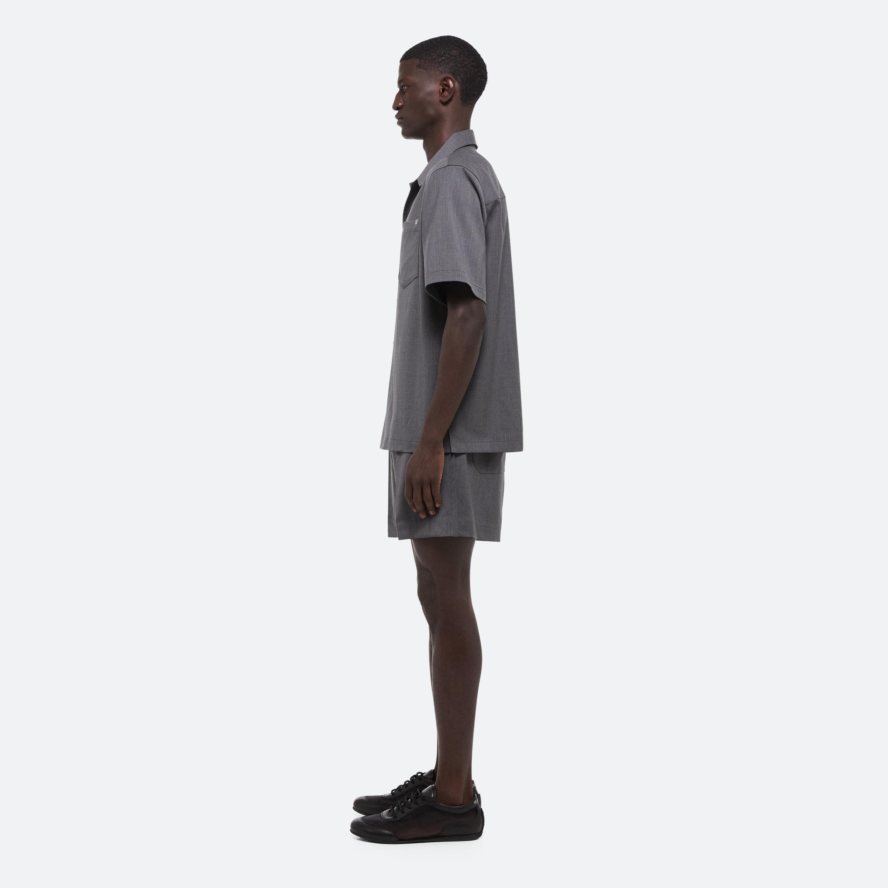Short-sleeved utility shirt in virgin Italian wool suiting, inspired by military uniforms. Matches the Pull-On Car Shorts.