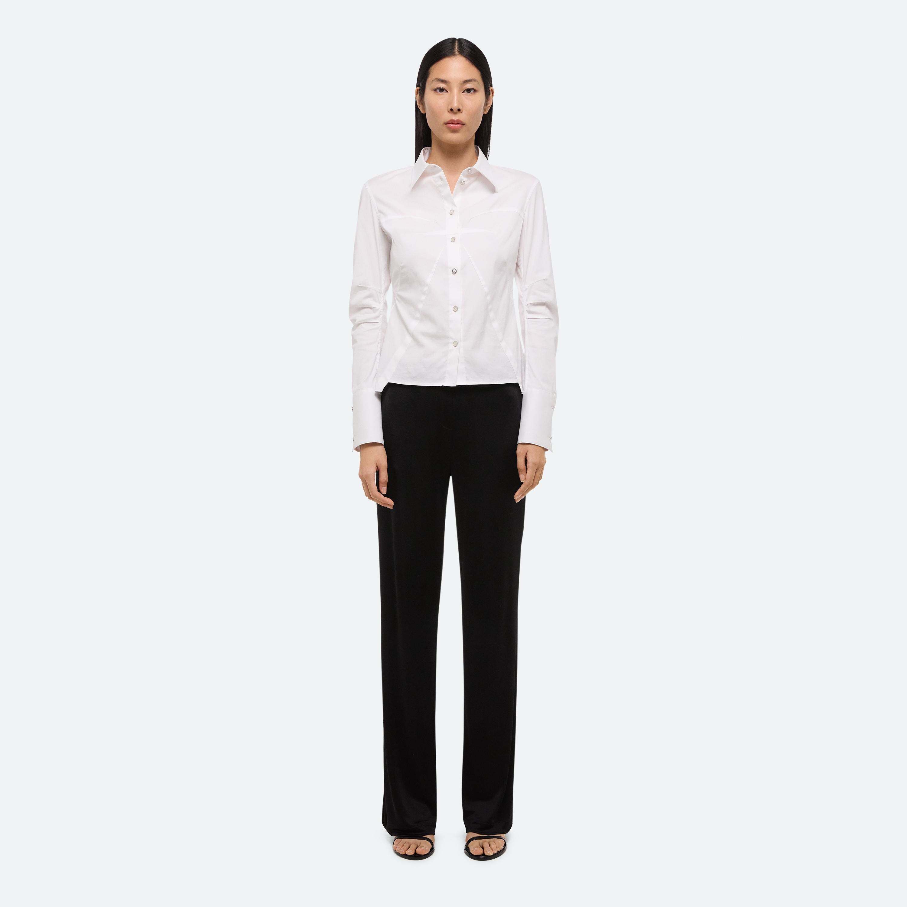 Stretch poplin shirt shaped by darts and articulated seams to create a slim fit.