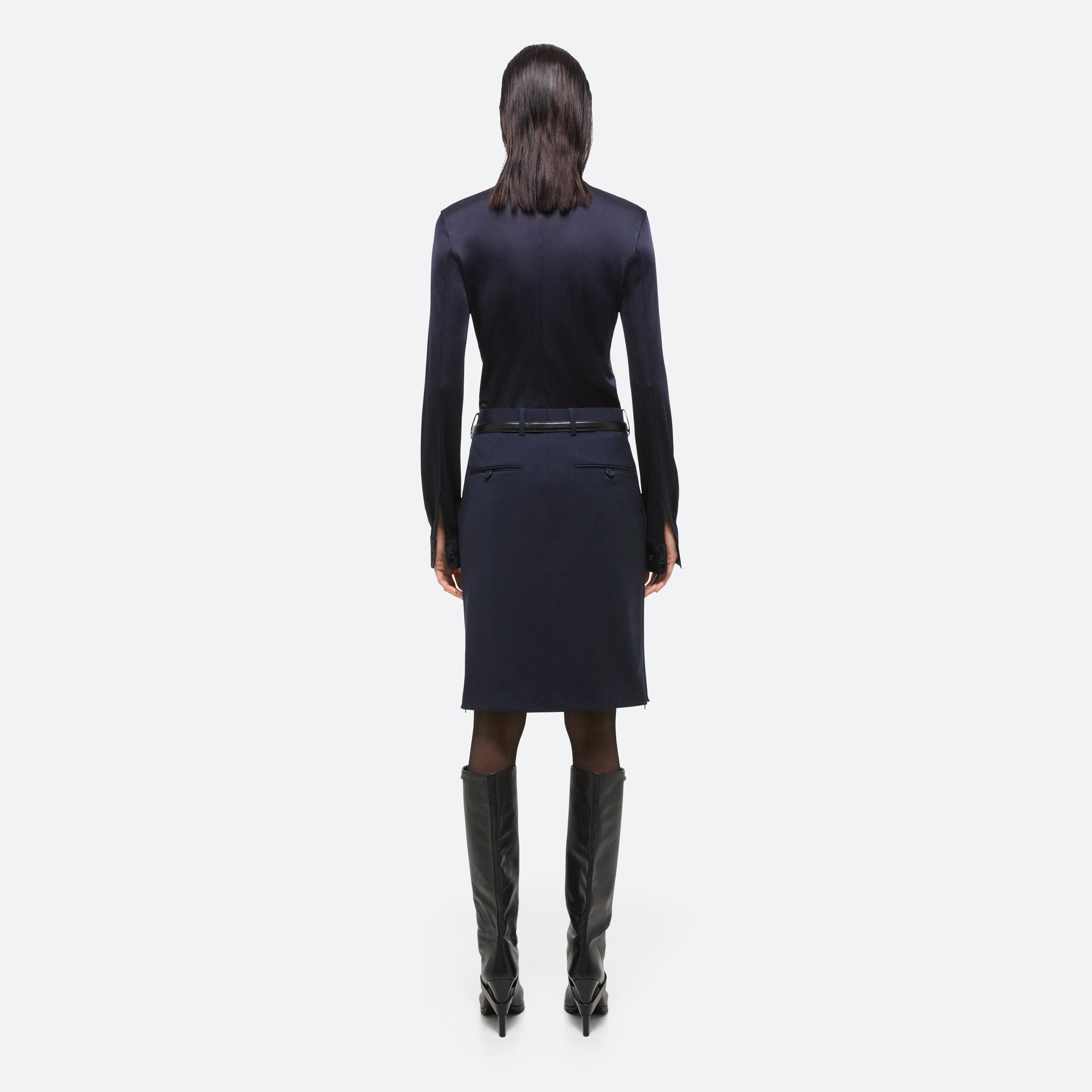 Tailored pencil skirt in virgin Italian wool. Invisible zippers at side seams allow for a customized shape.
