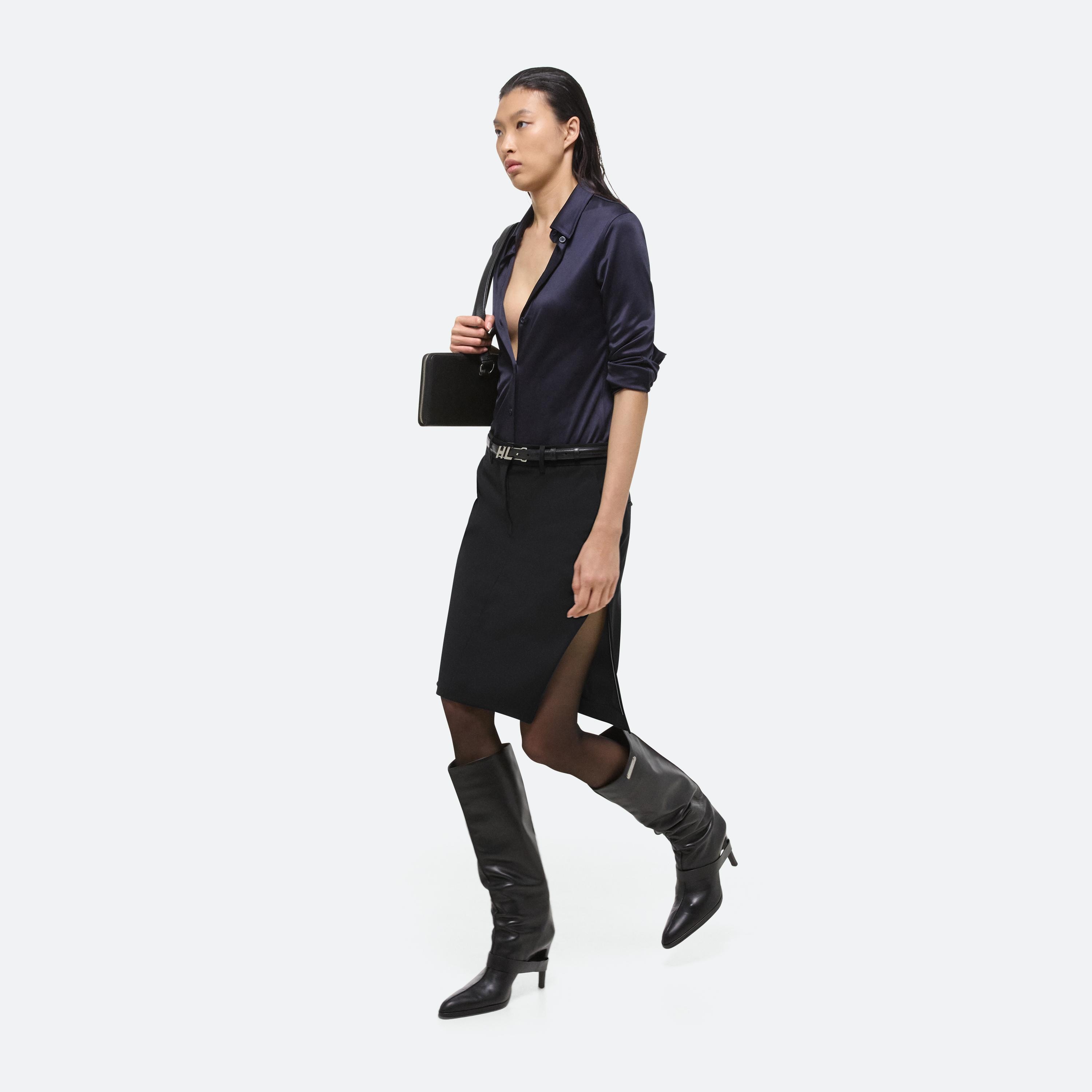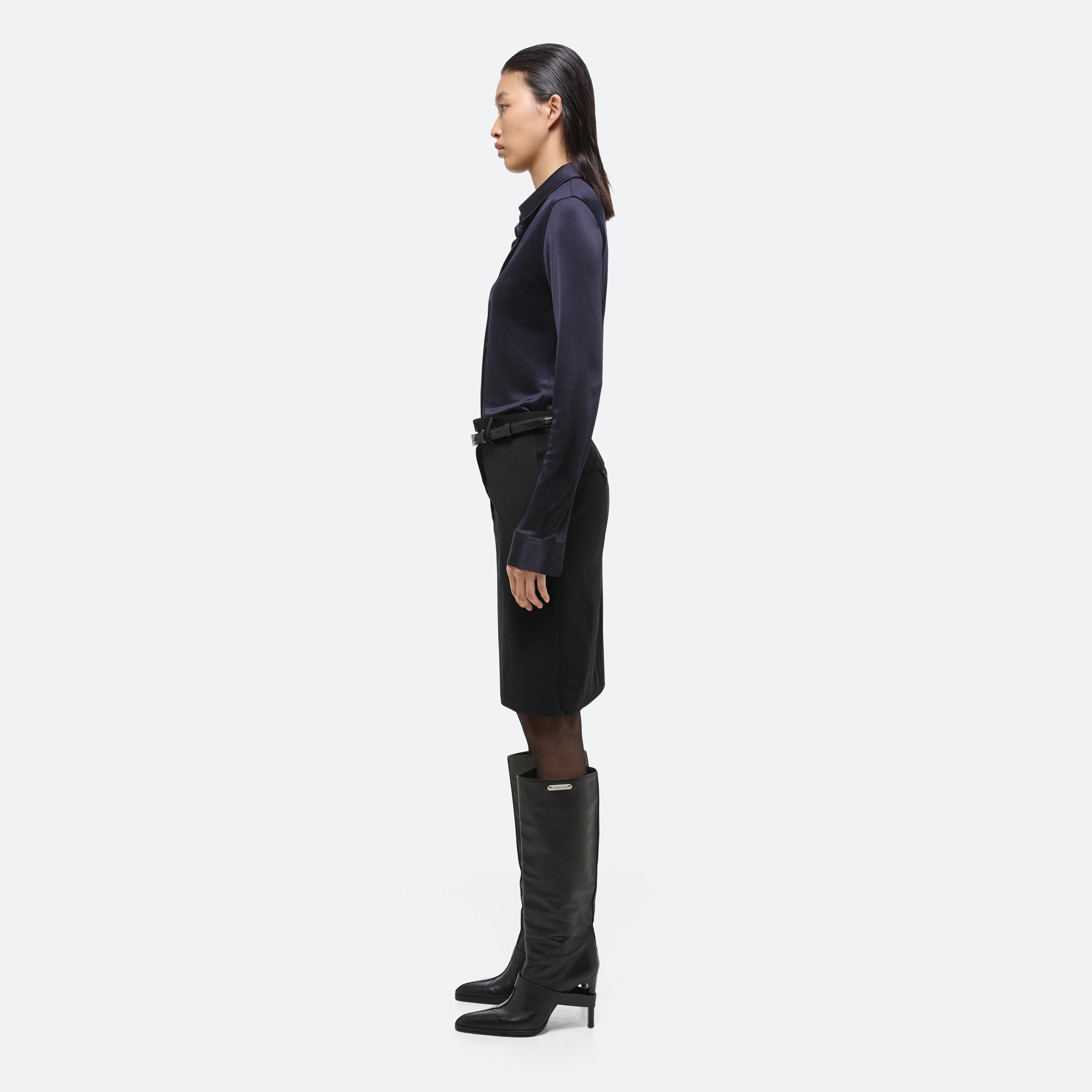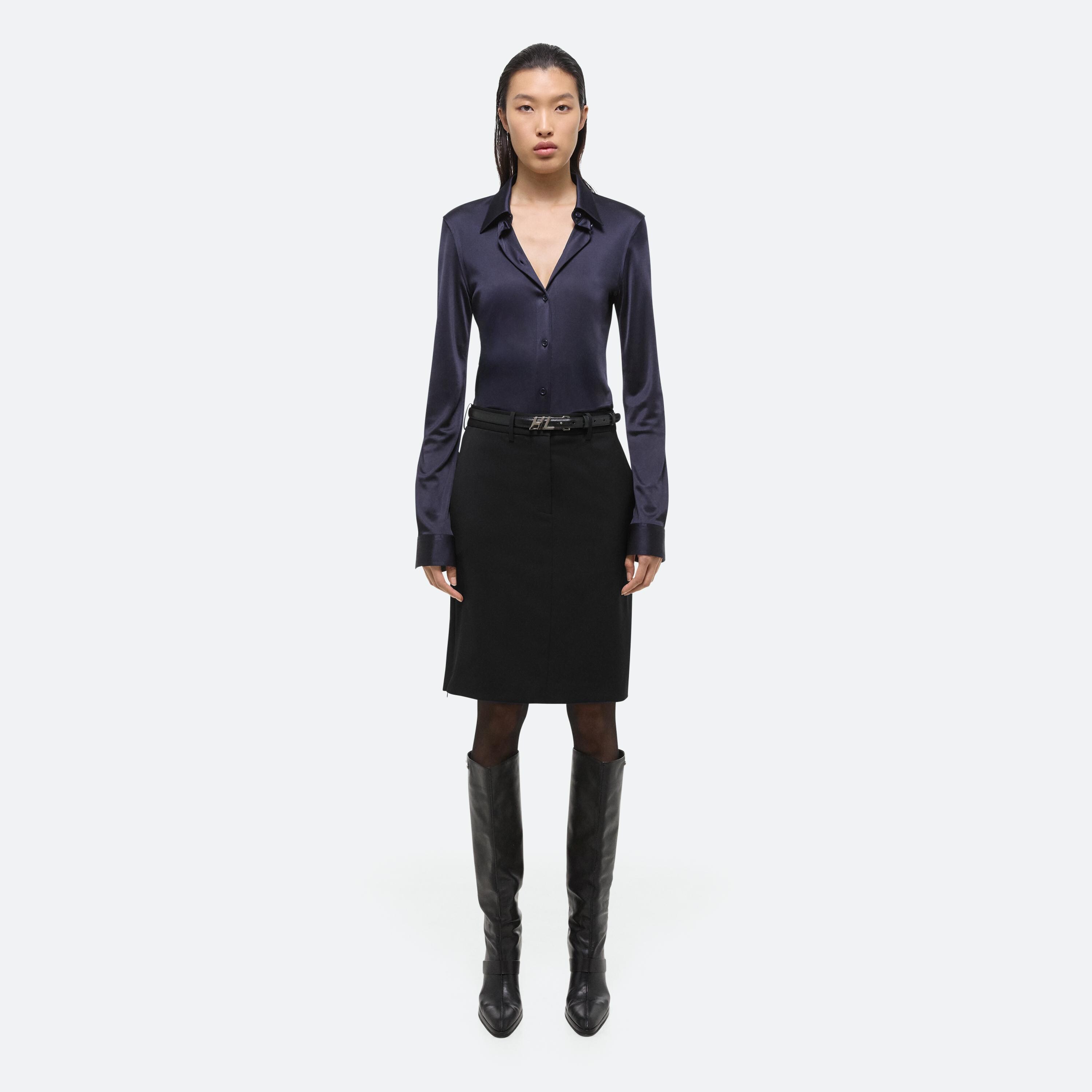 Tailored pencil skirt in virgin Italian wool. Invisible zippers at side seams allow for a customized shape.