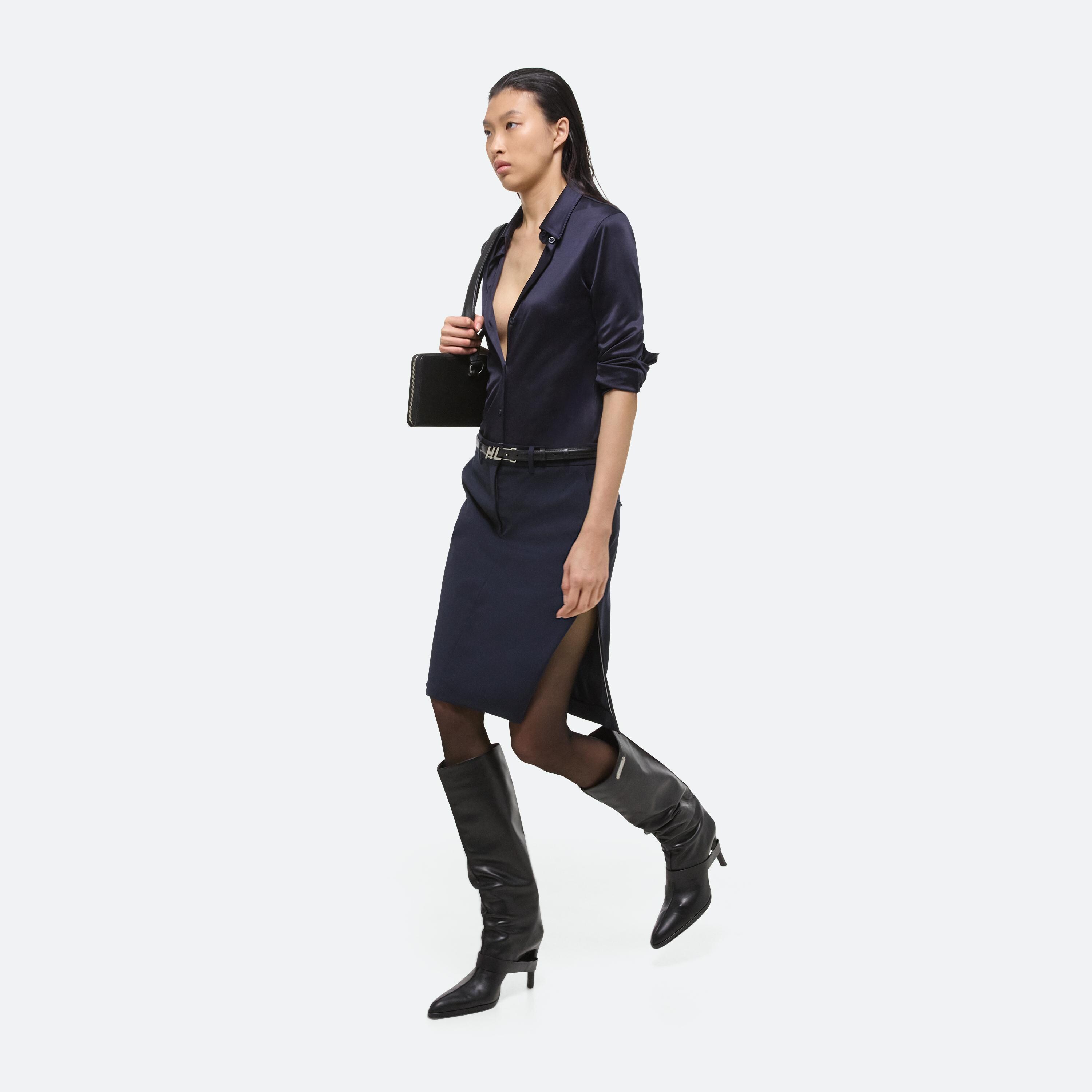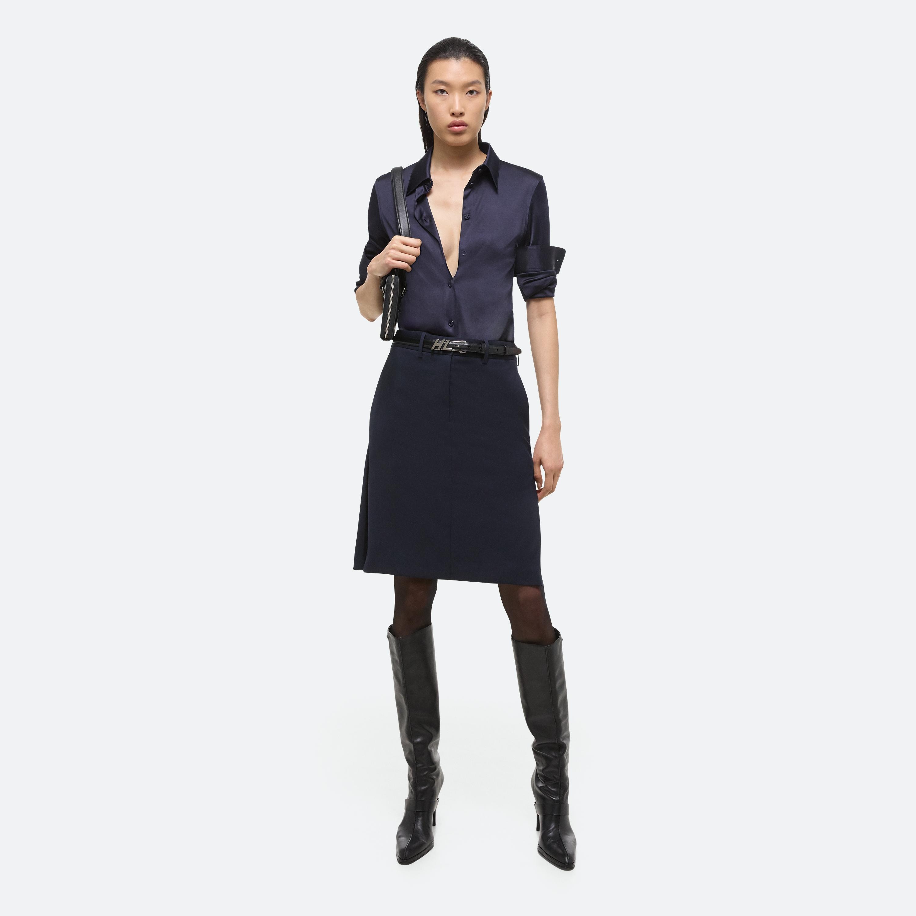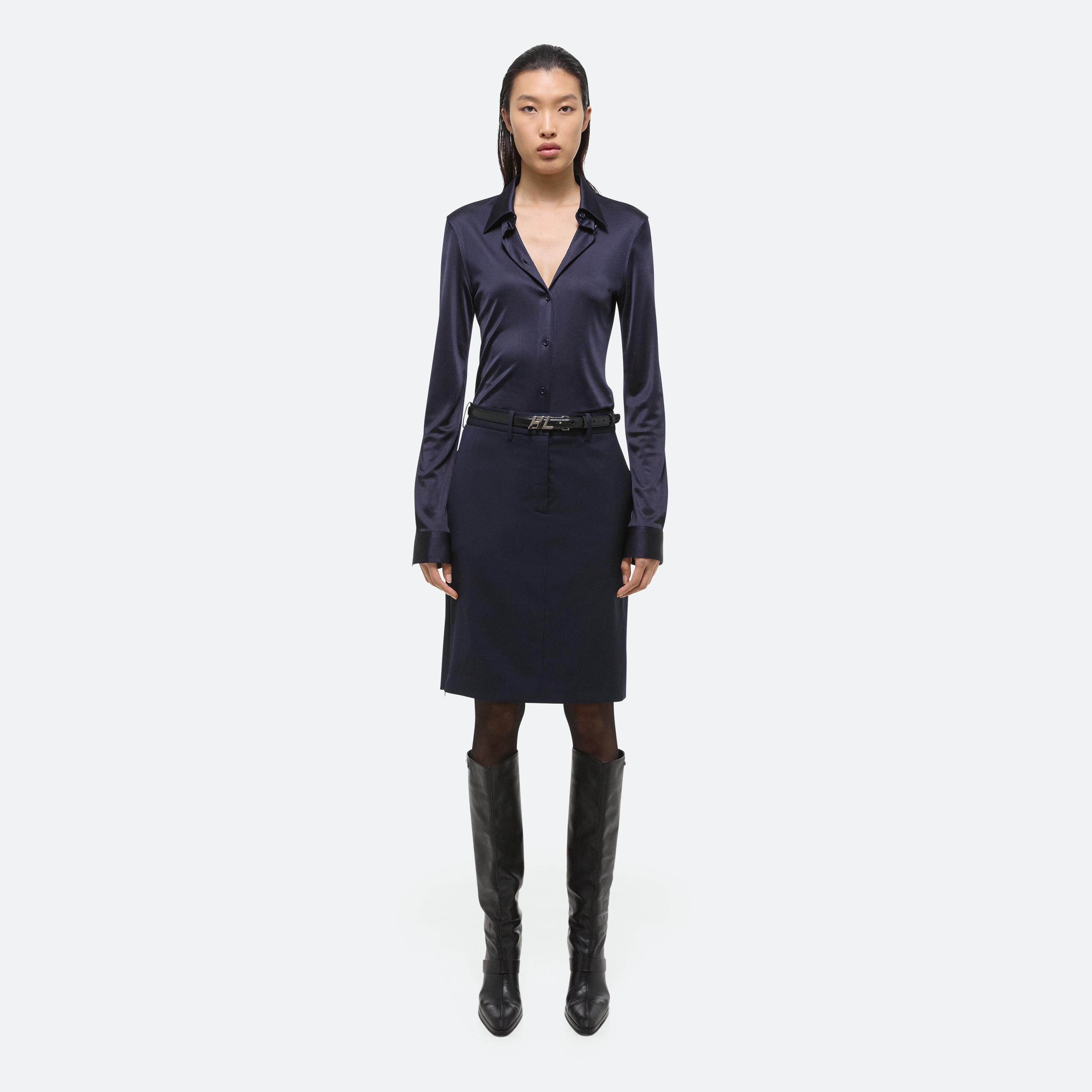 Tailored pencil skirt in virgin Italian wool. Invisible zippers at side seams allow for a customized shape.