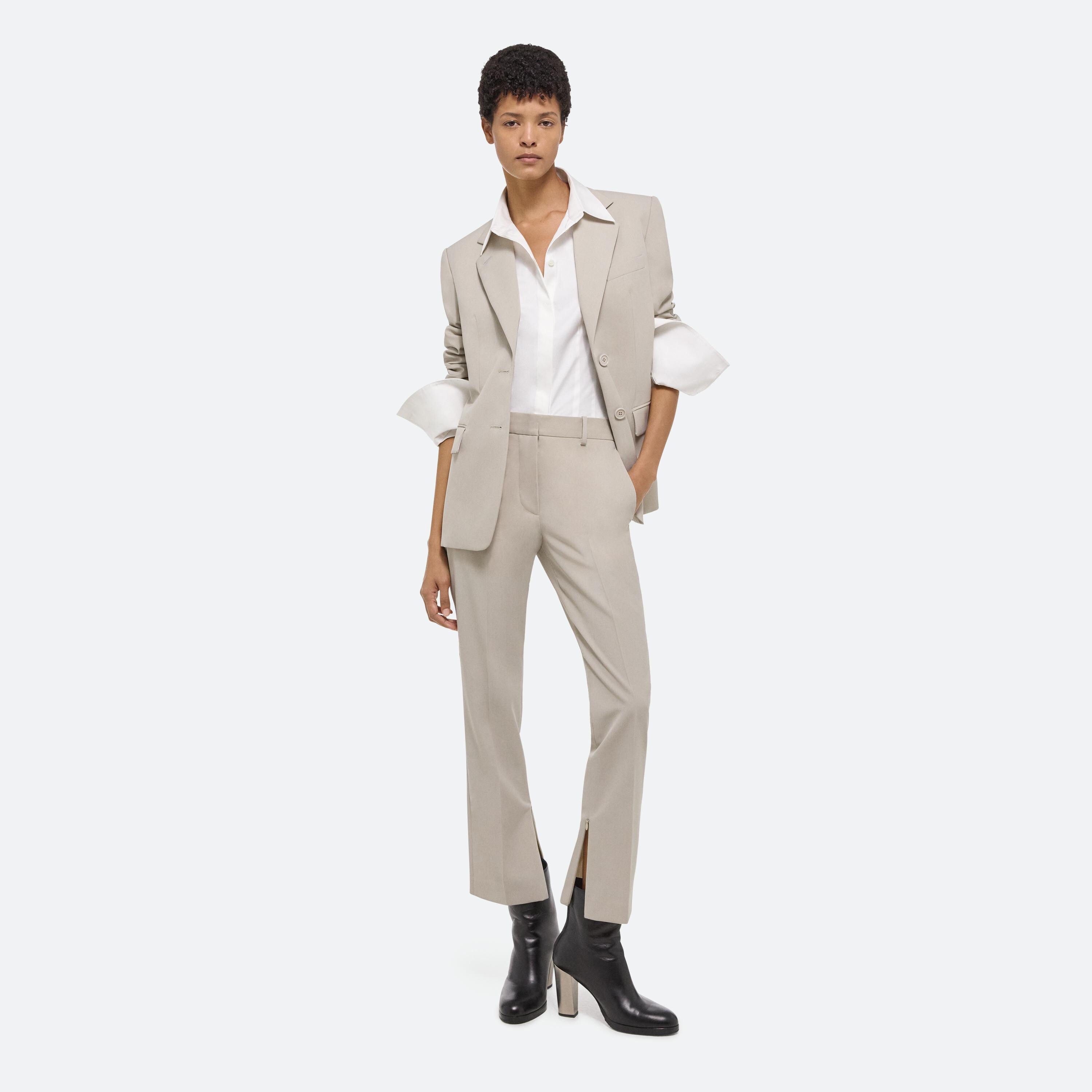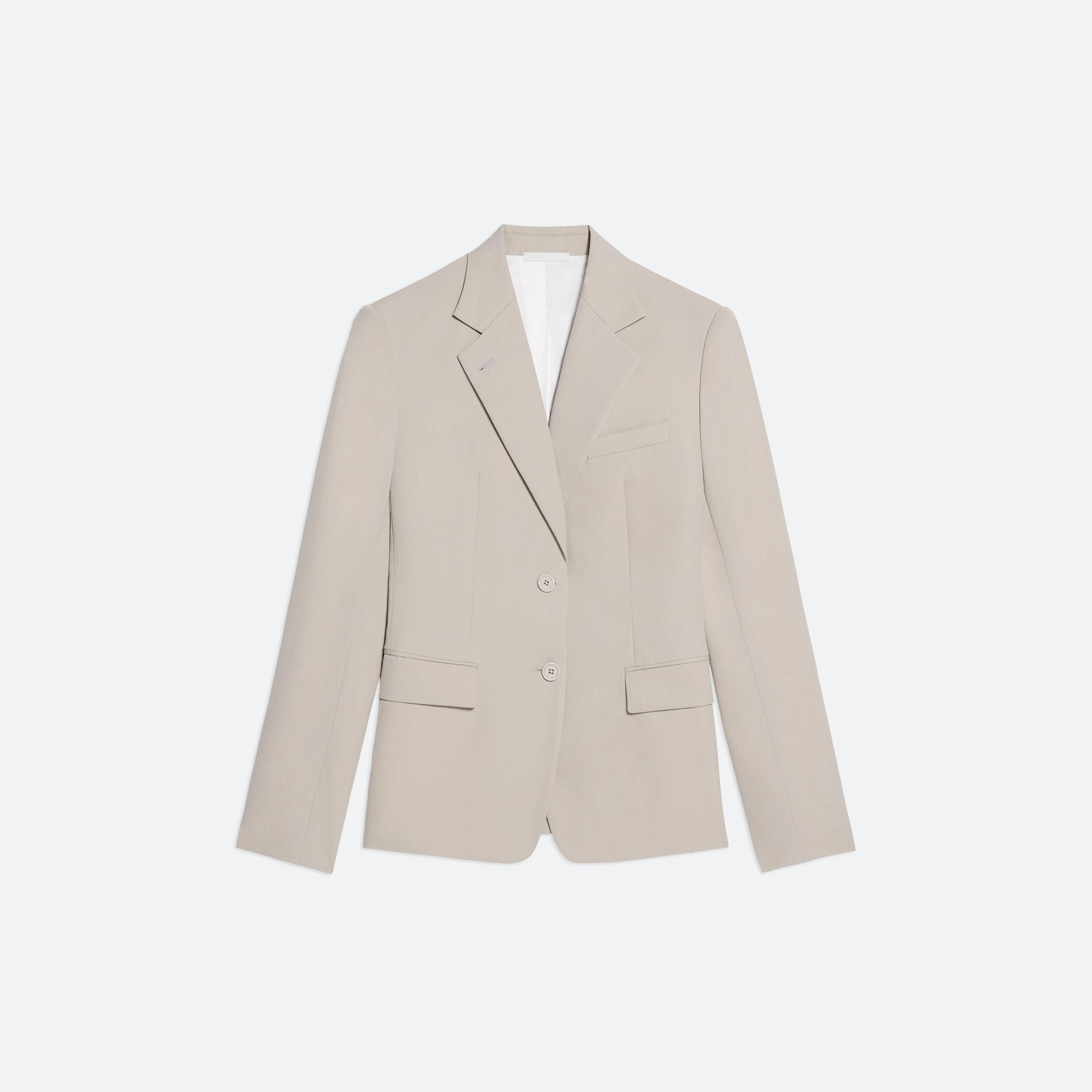 Classic tailored blazer in virgin Italian wool with notched lapels and waist flap pockets.