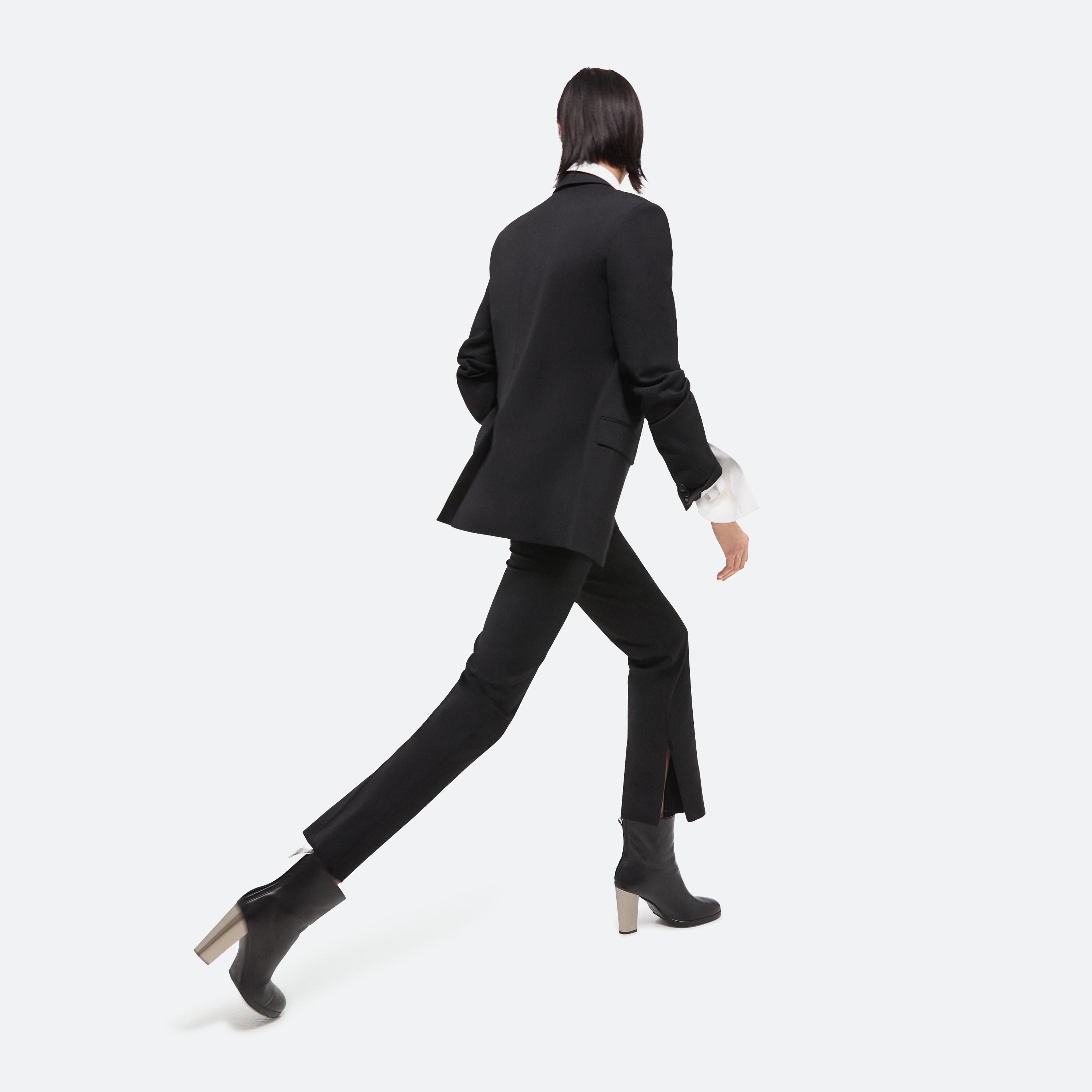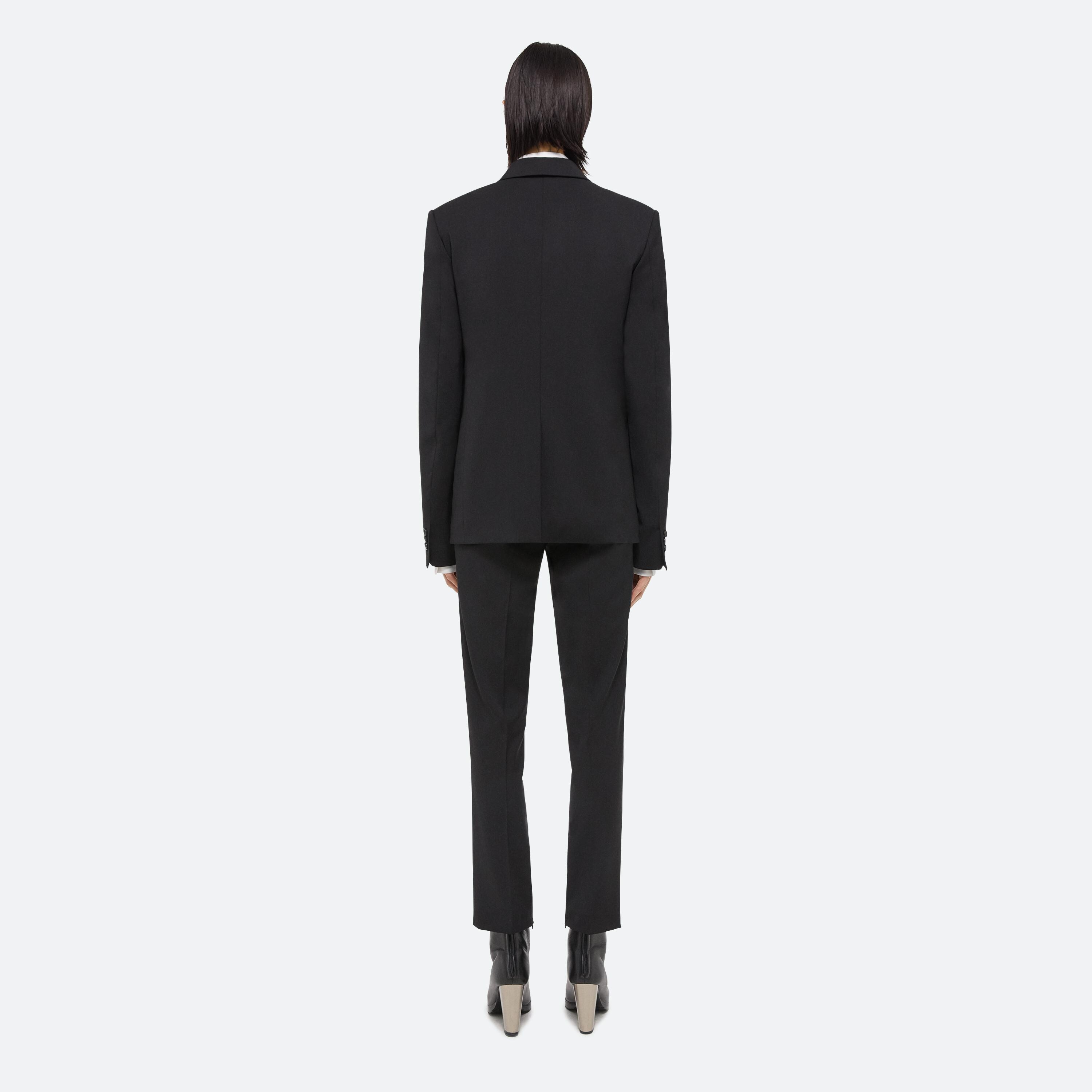 Classic tailored blazer in virgin Italian wool with notched lapels and waist flap pockets.