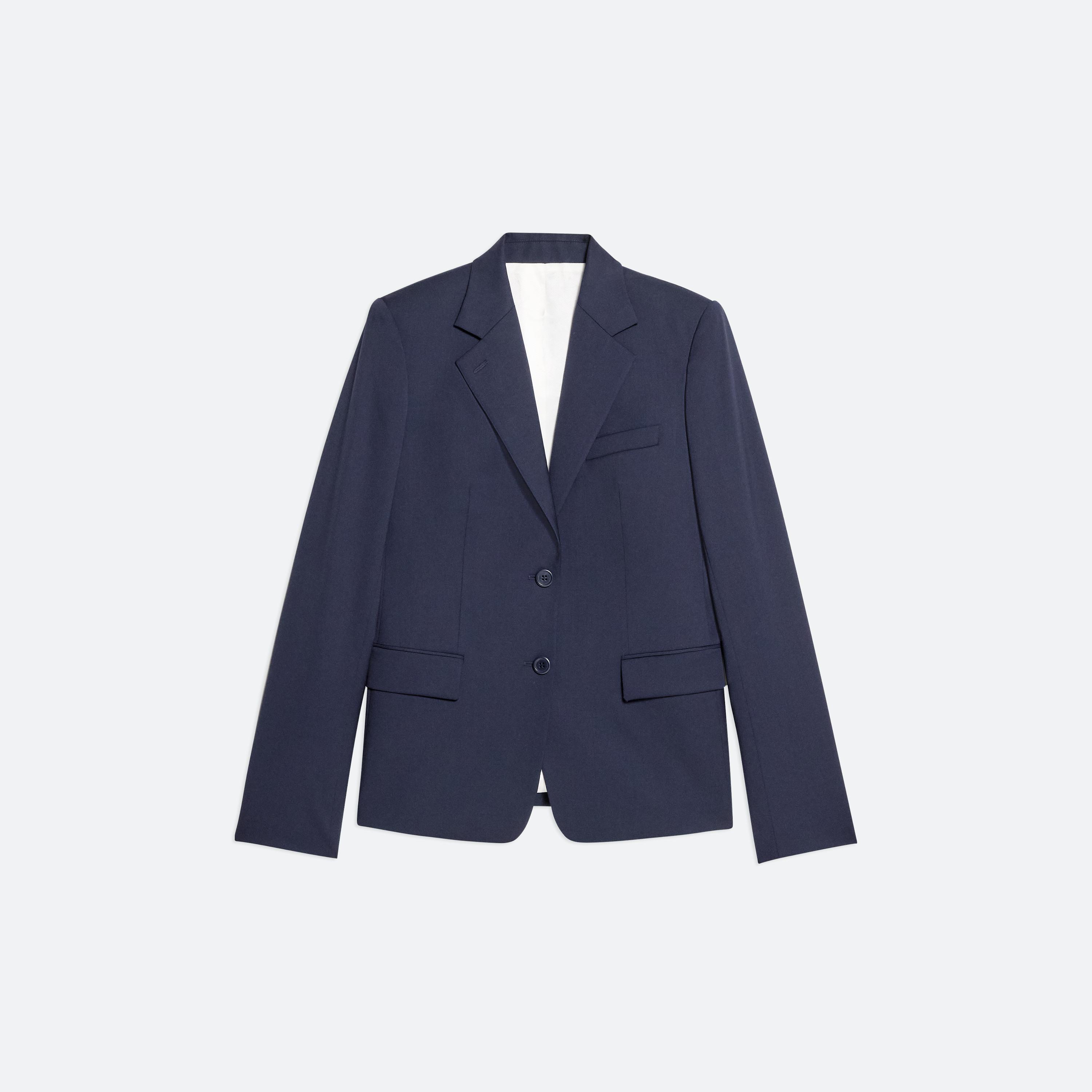 Classic tailored blazer in virgin Italian wool with notched lapels and waist flap pockets.