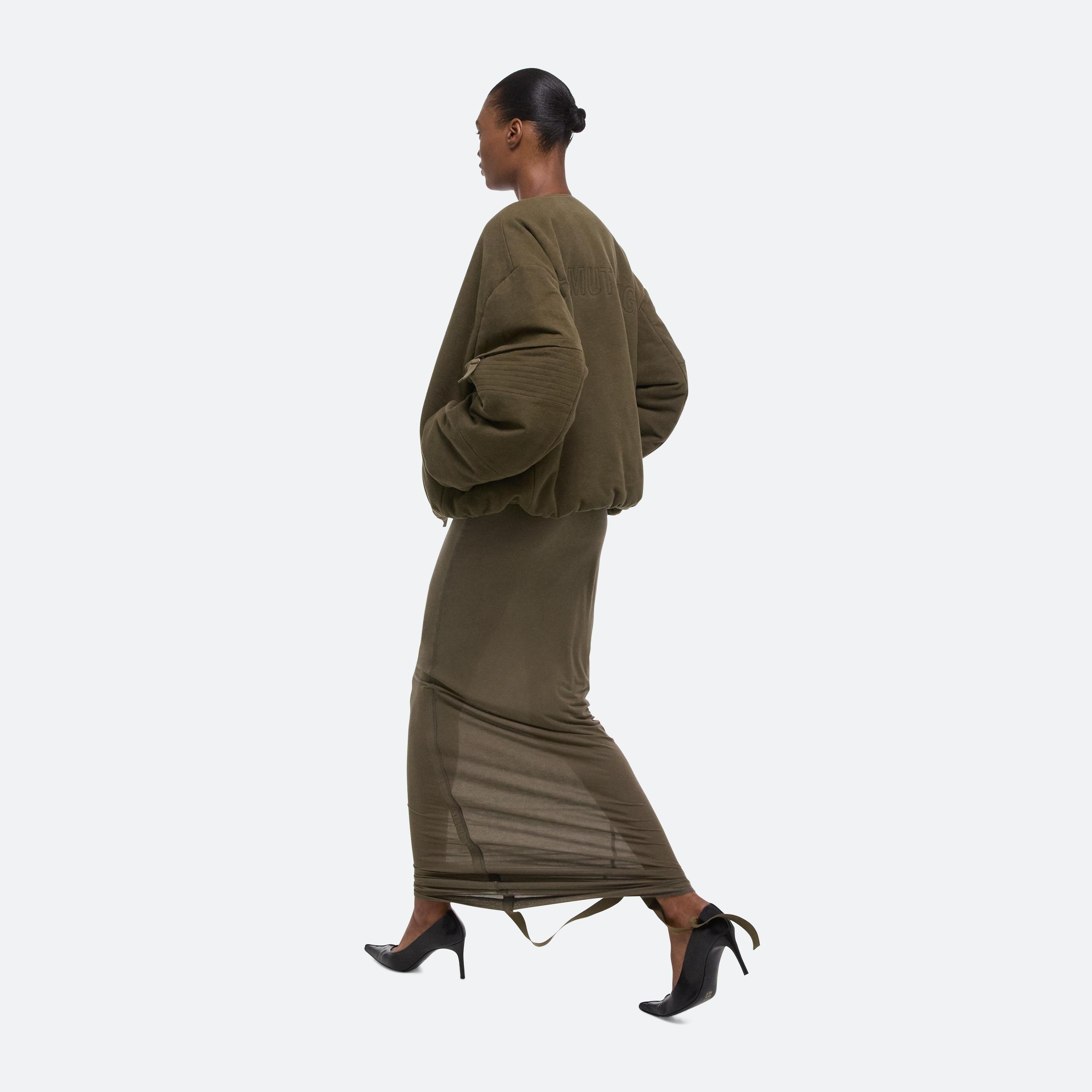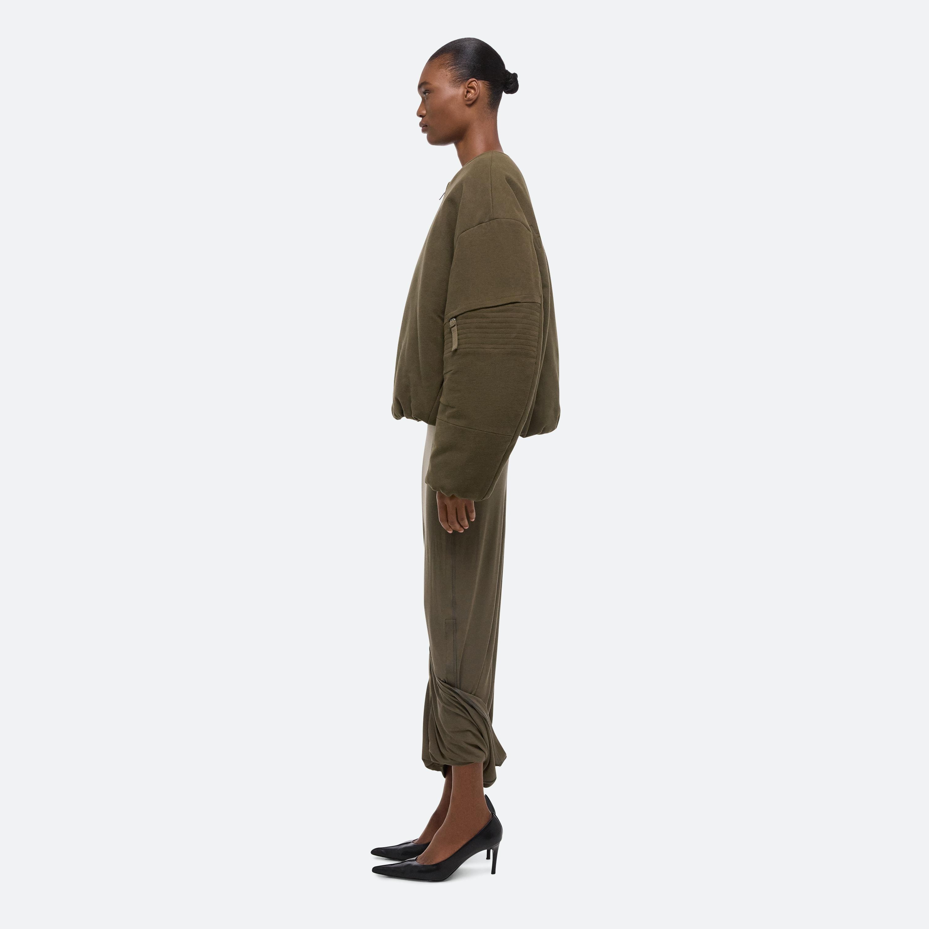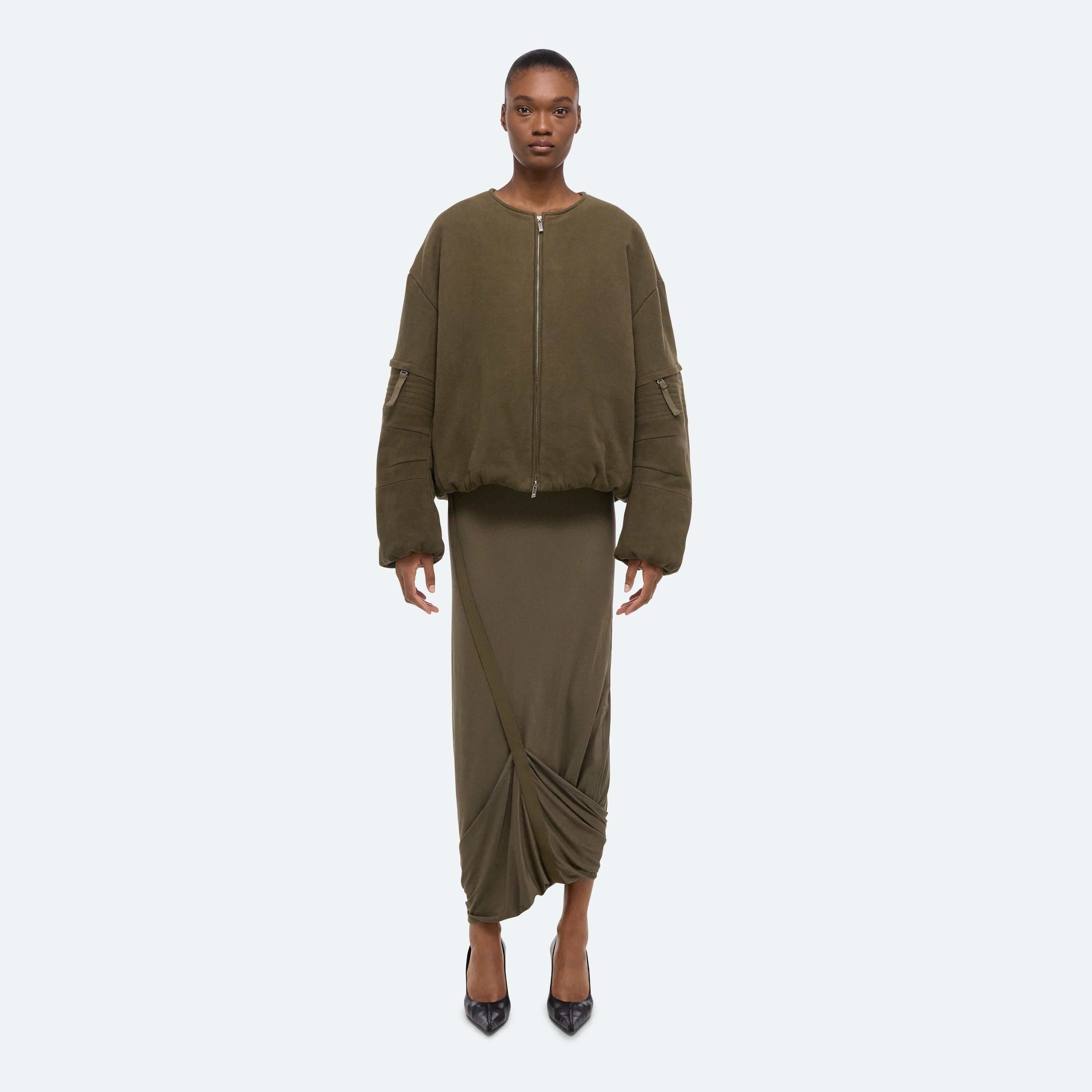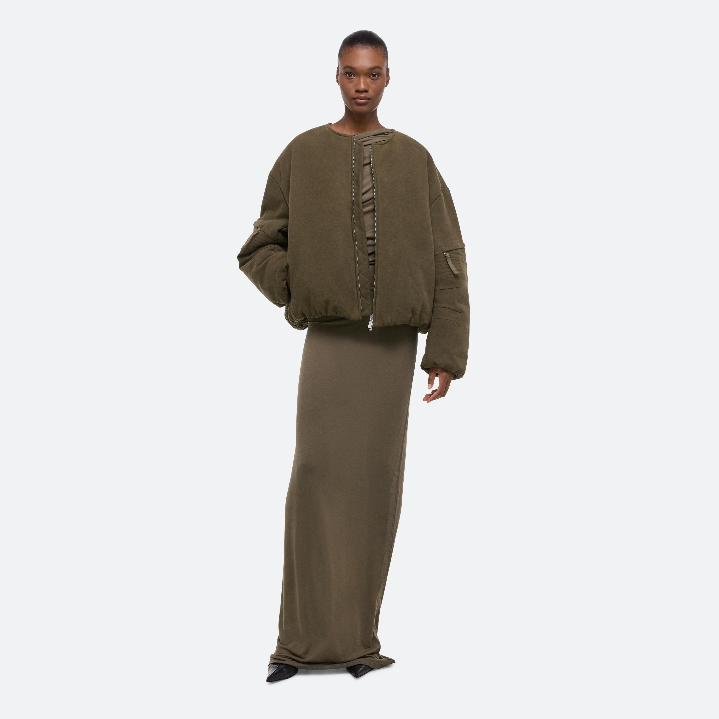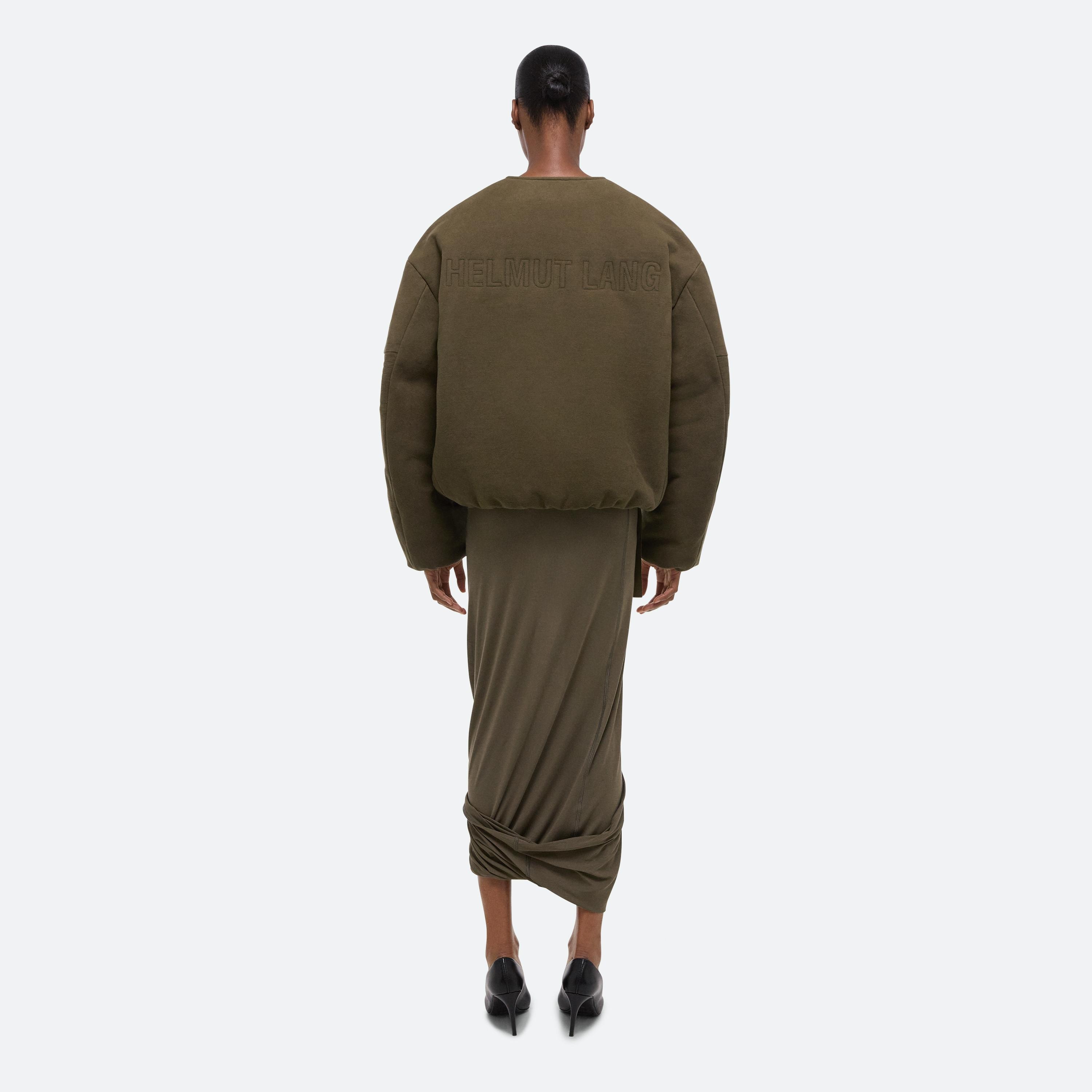 Padded bomber jacket in a brushed cotton chamois. A collarless design and hidden elastic cuffs emphasize the round cocoon shape. Finished with a minimal outlined logo across the shoulders.
