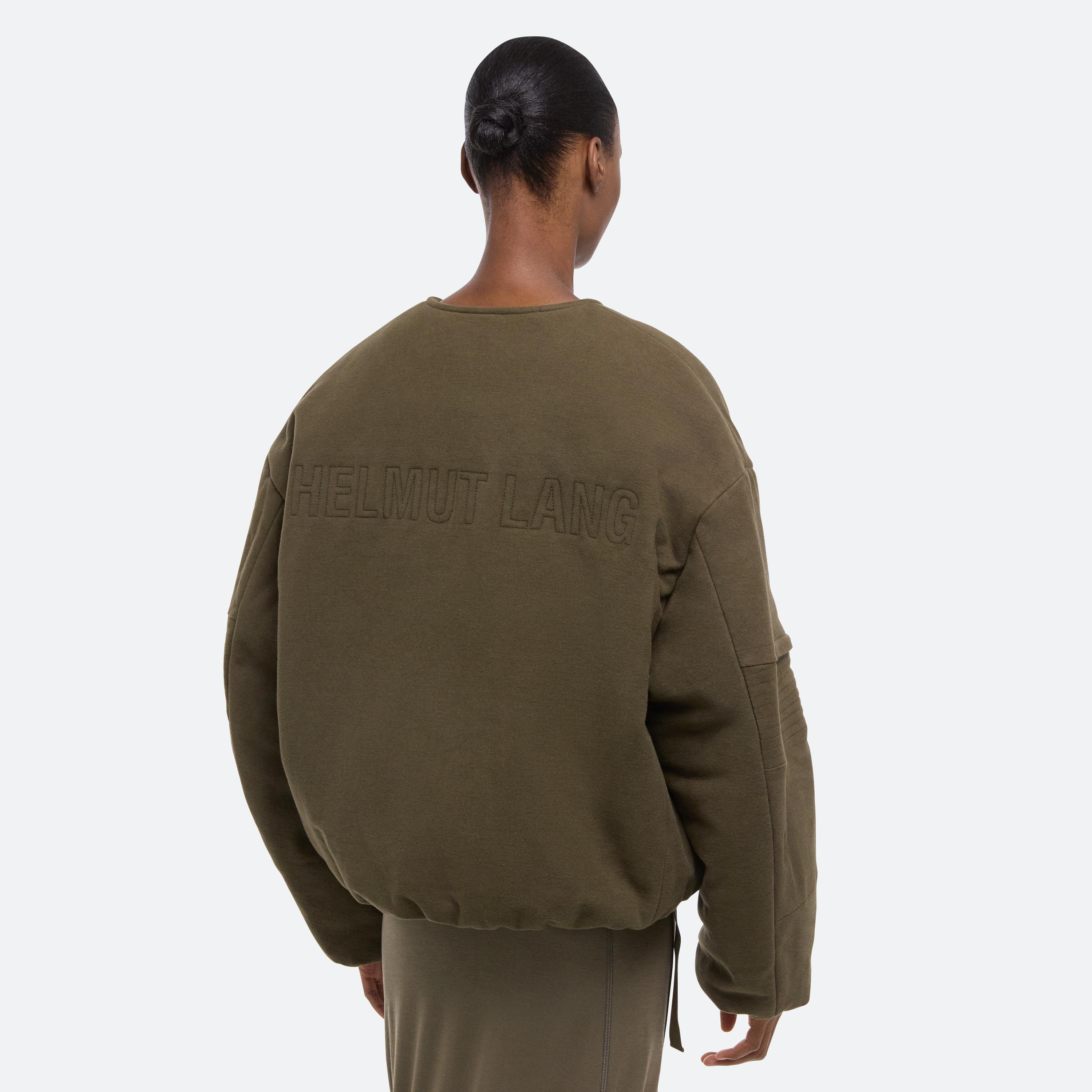 Padded bomber jacket in a brushed cotton chamois. A collarless design and hidden elastic cuffs emphasize the round cocoon shape. Finished with a minimal outlined logo across the shoulders.