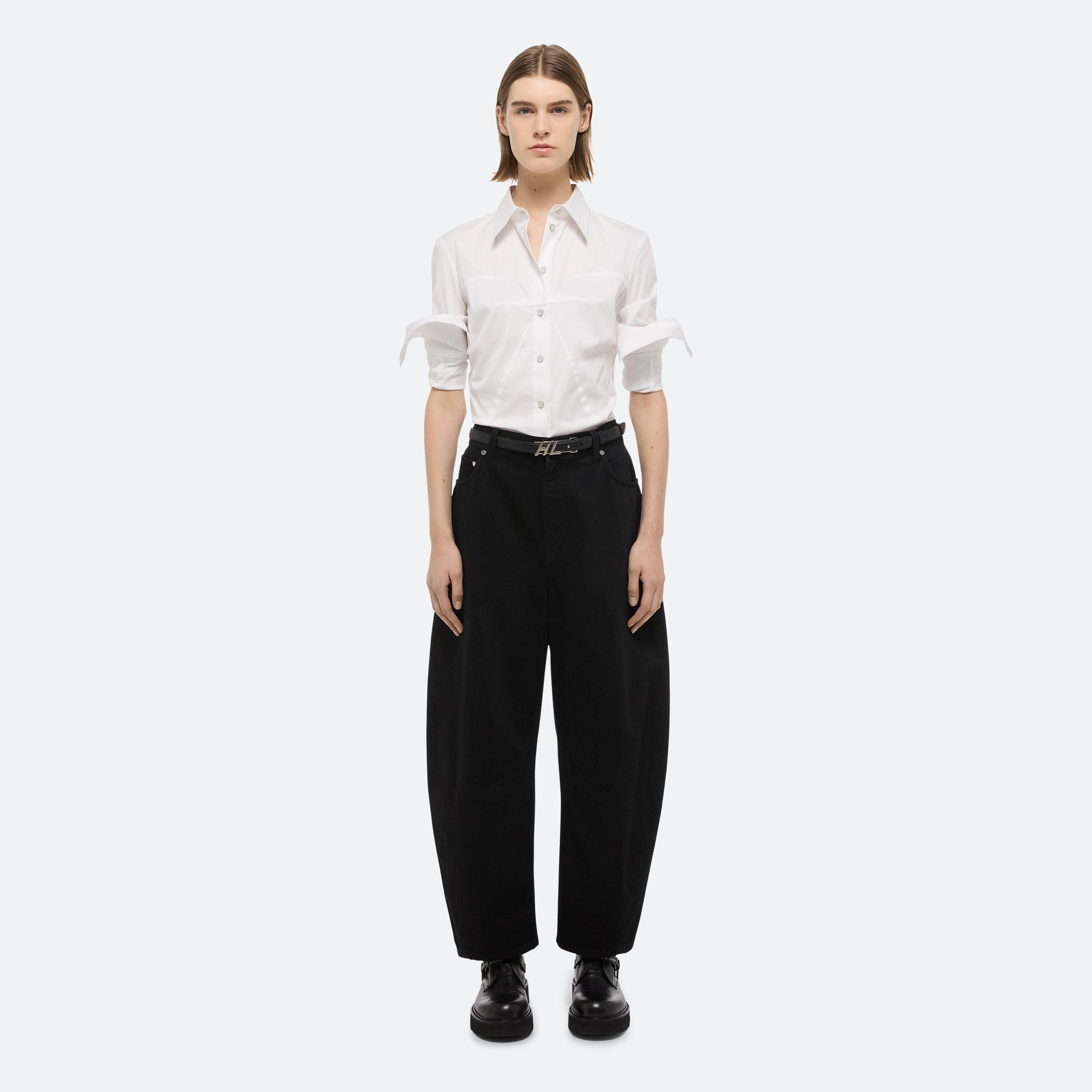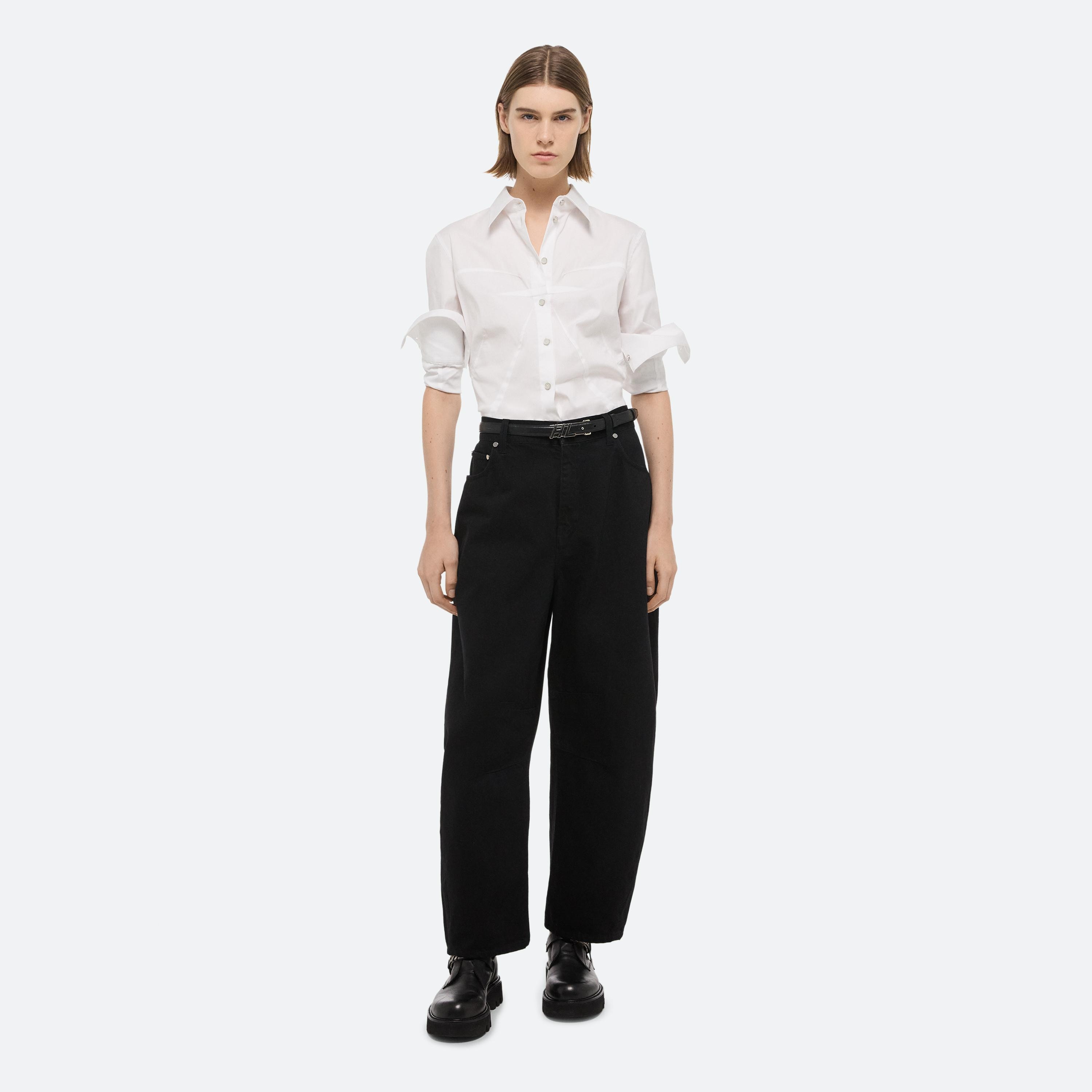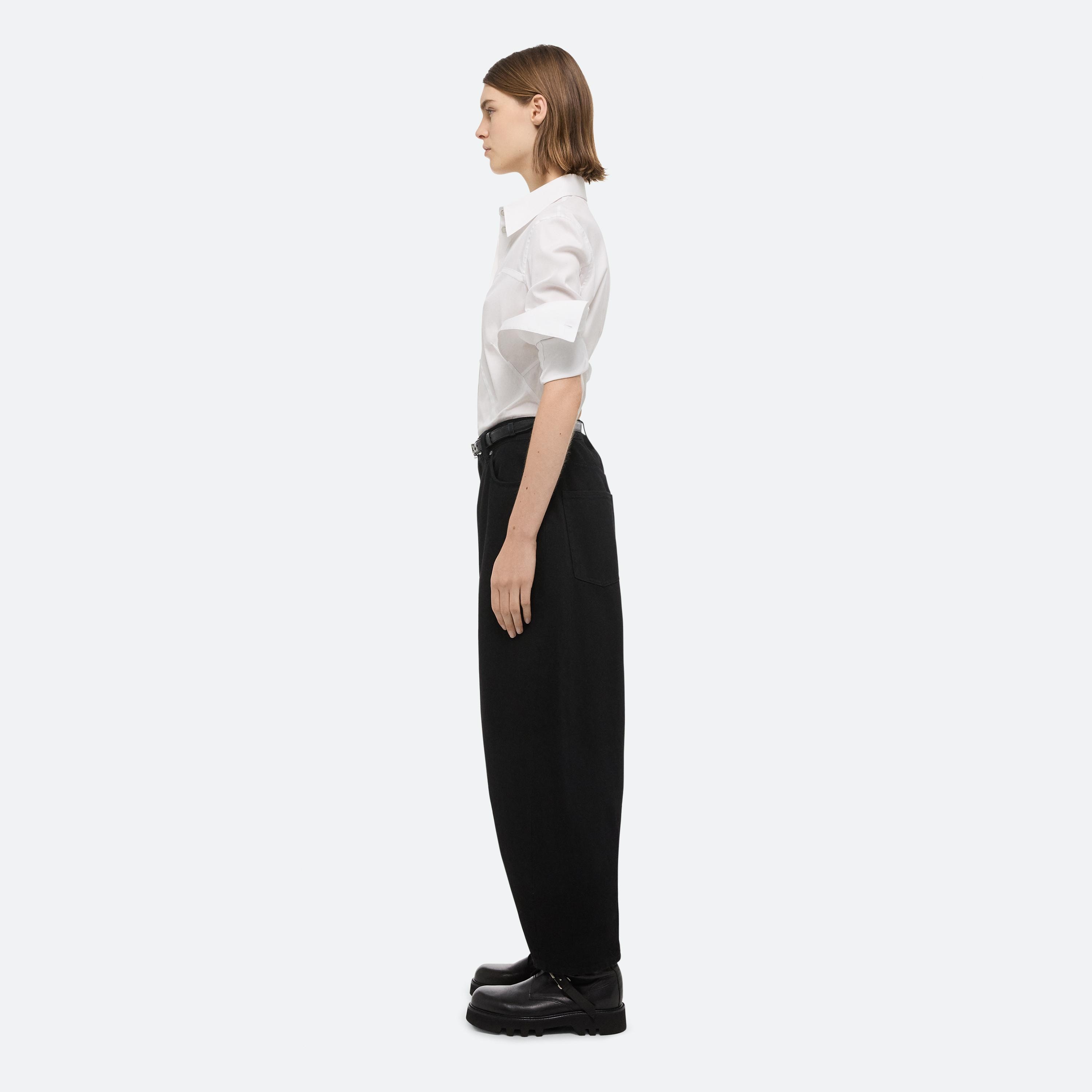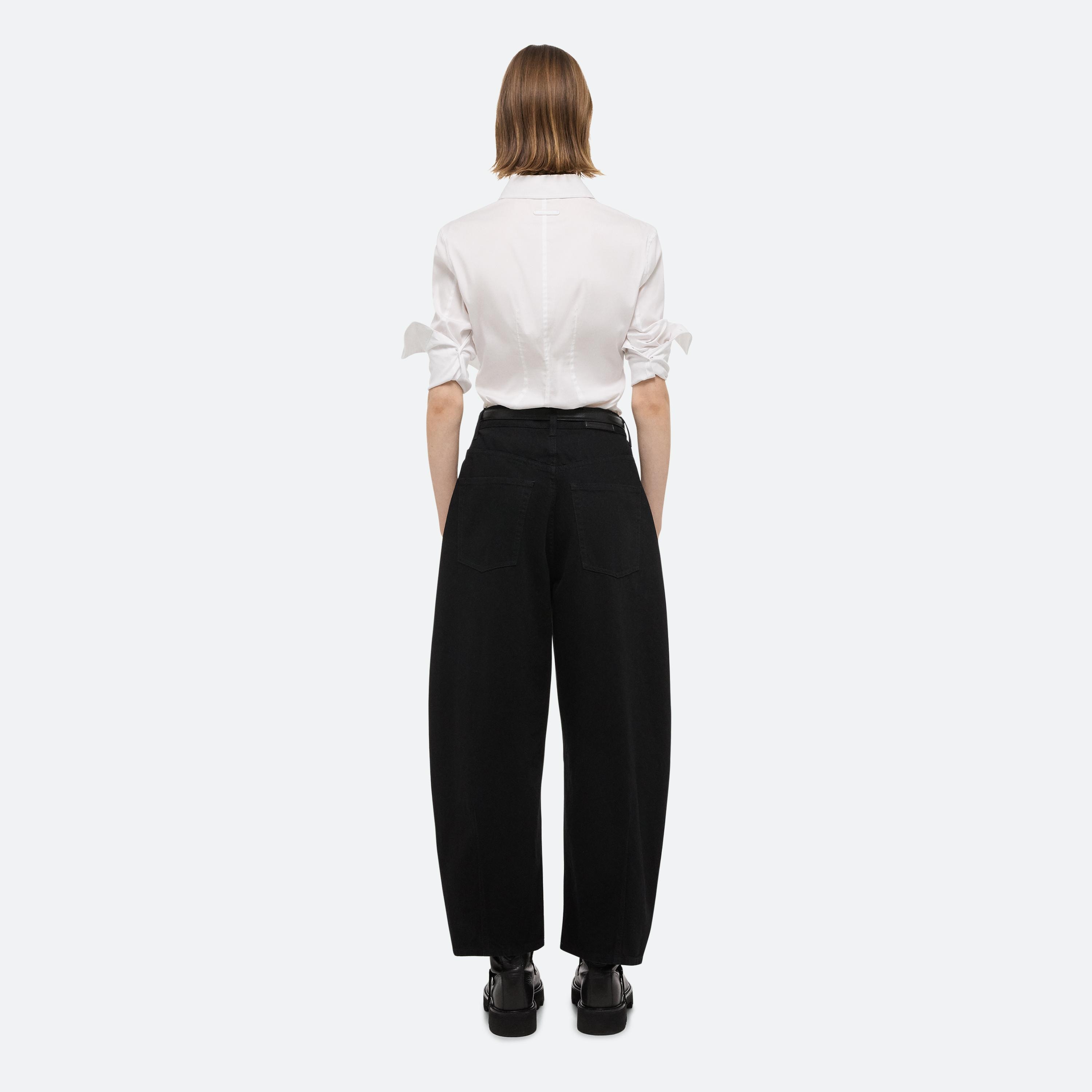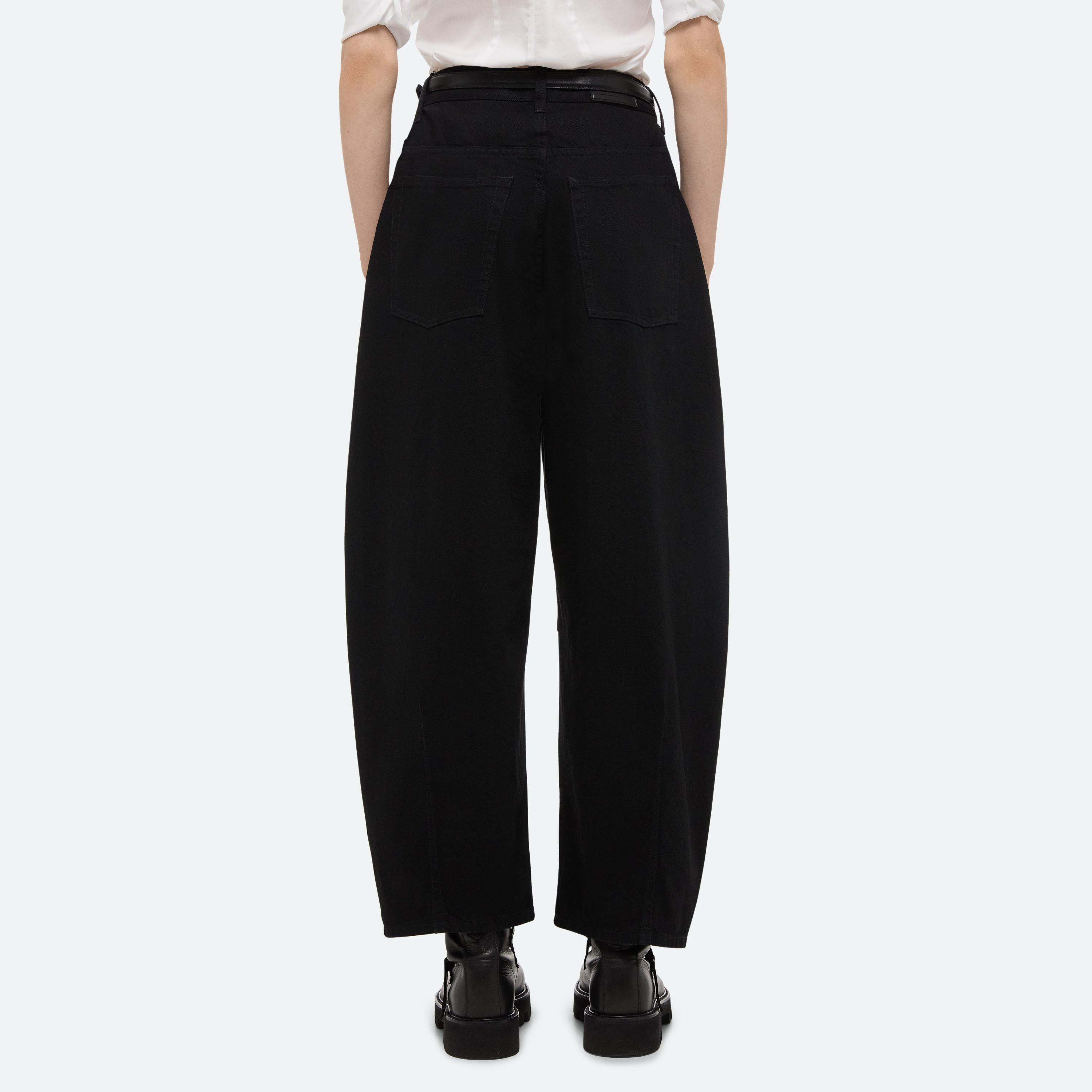 Barrel-leg jeans in black denim. Darts at the knee and ankle sculpt a round, curved leg shape.