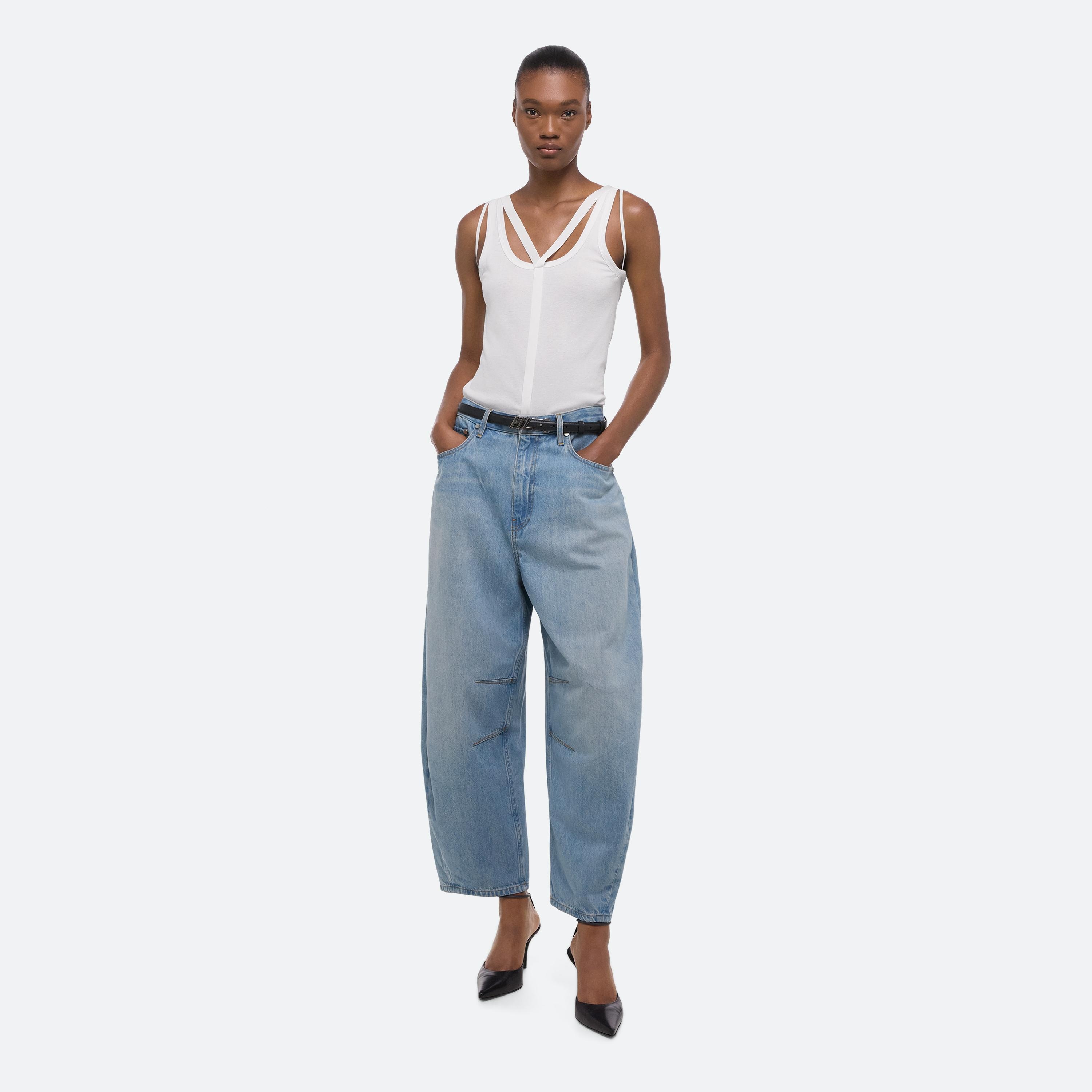 Barrel-leg jeans in light indigo wash. Darts at the knee and ankle sculpt a round, curved leg shape.
