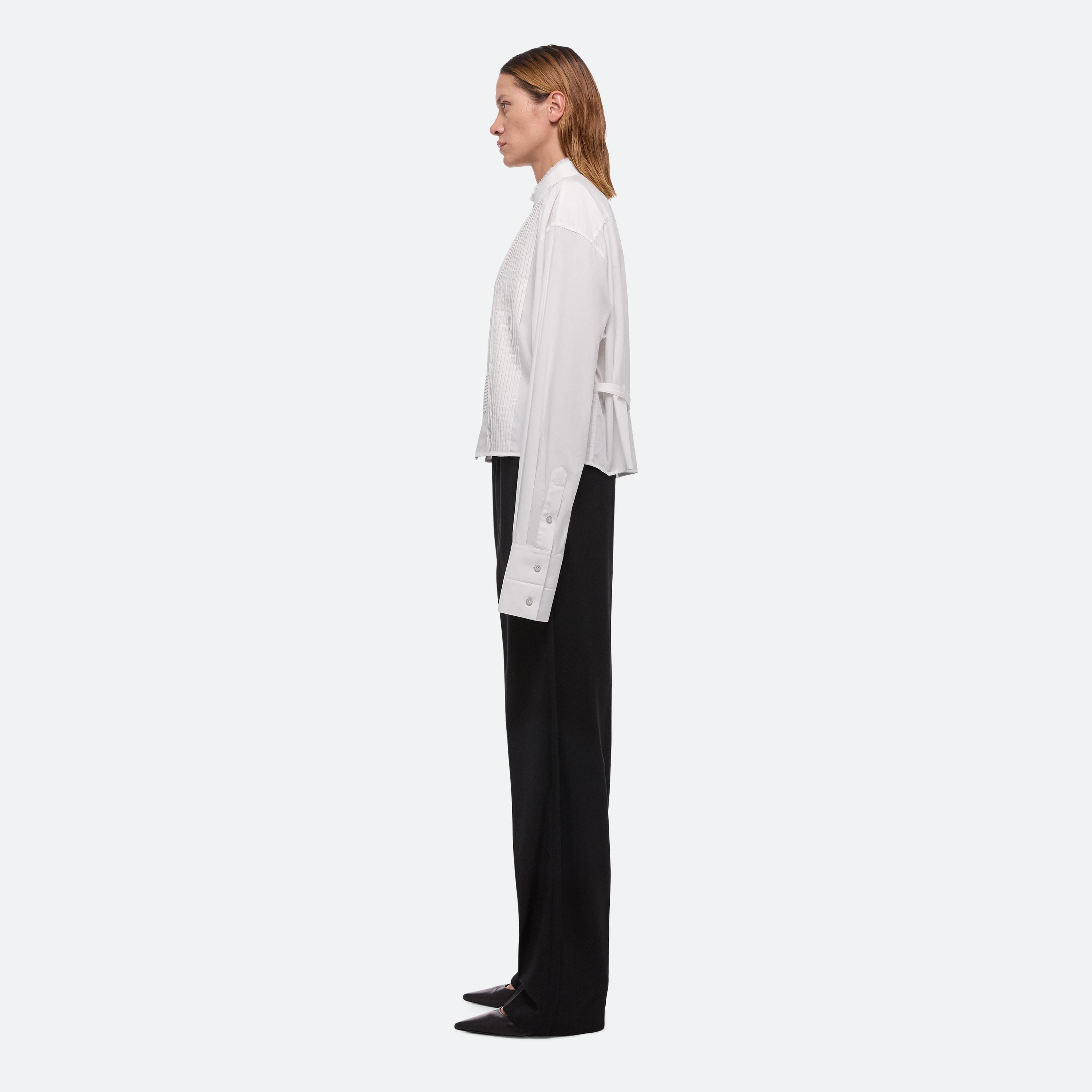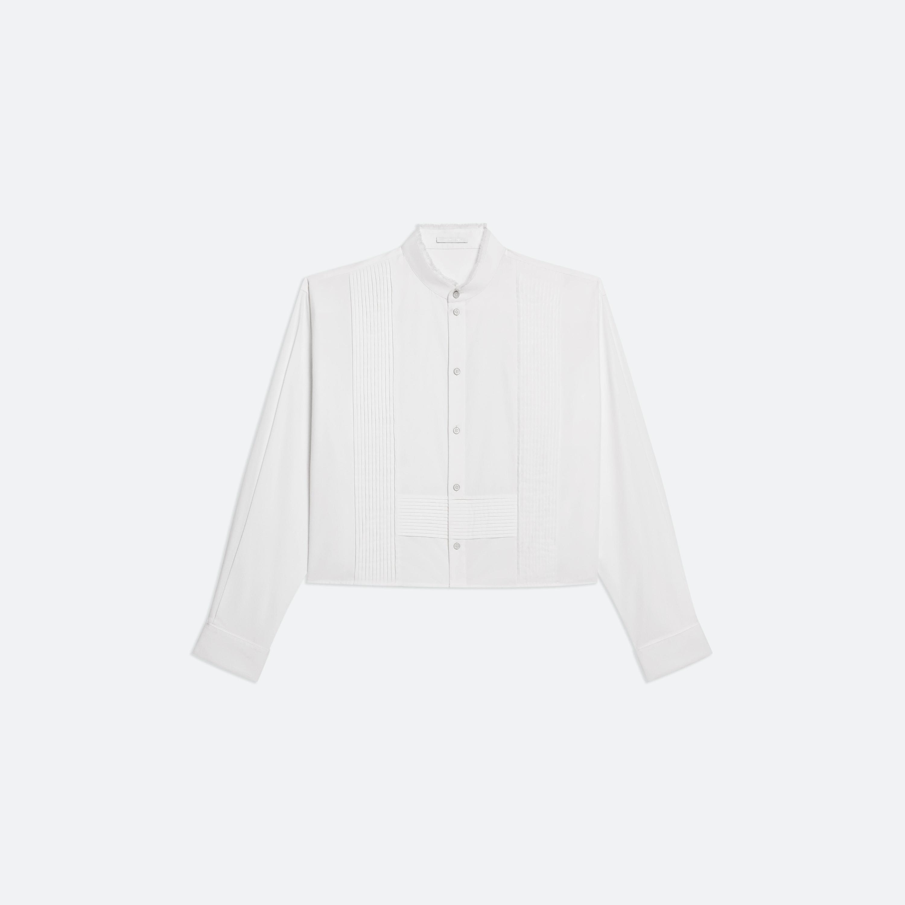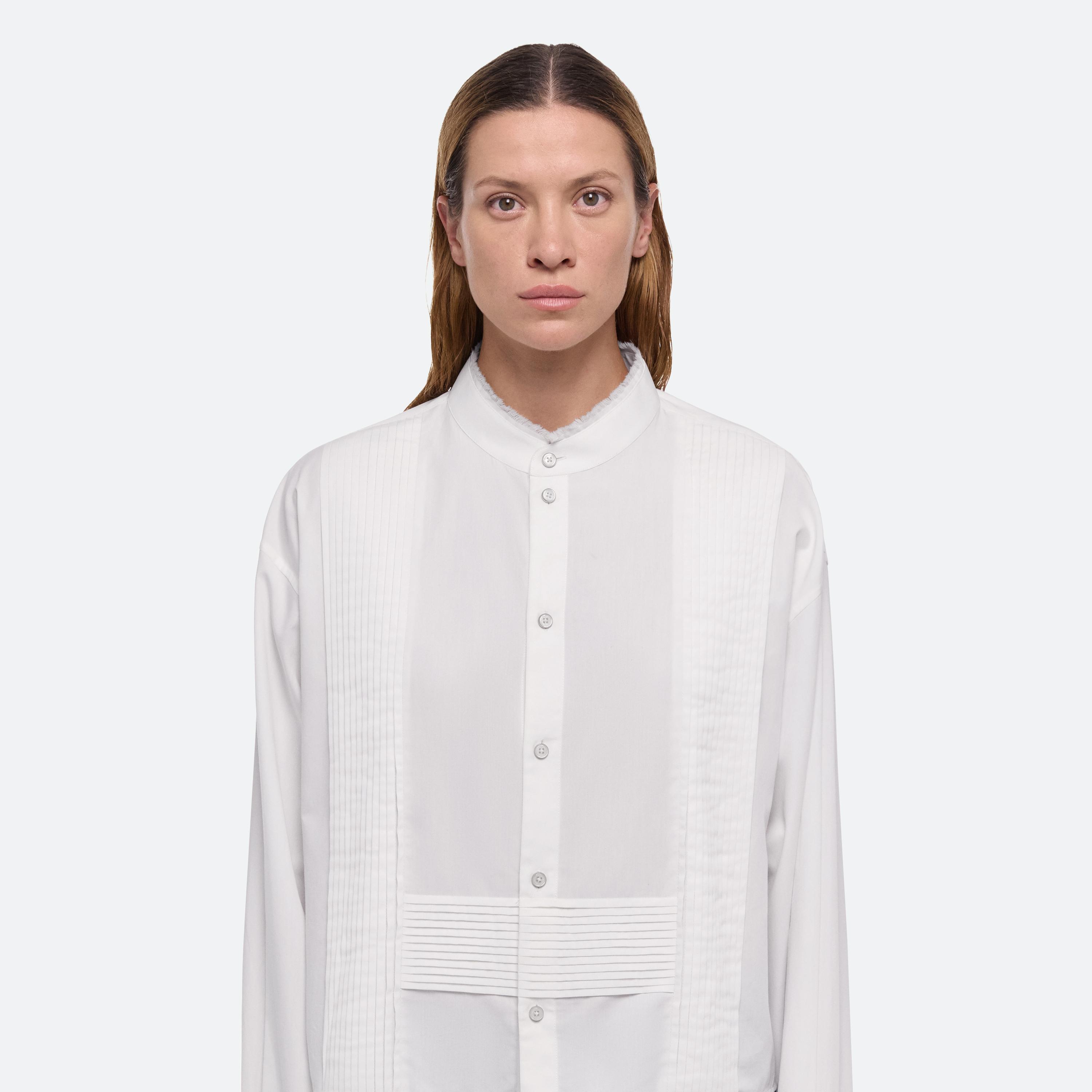 Oversized tuxedo shirt in cotton poplin with geometric pin-tucked details and a cut-off collar.