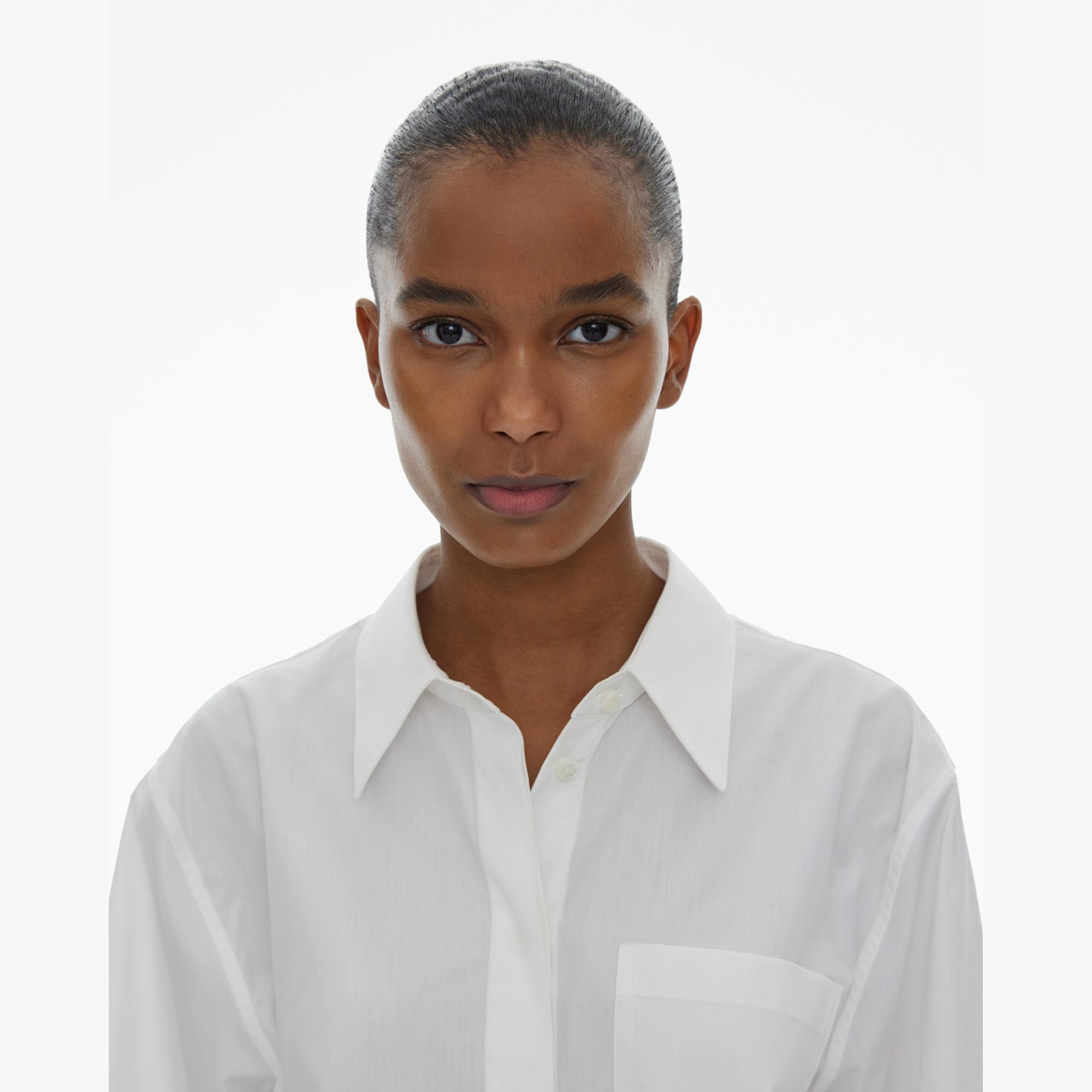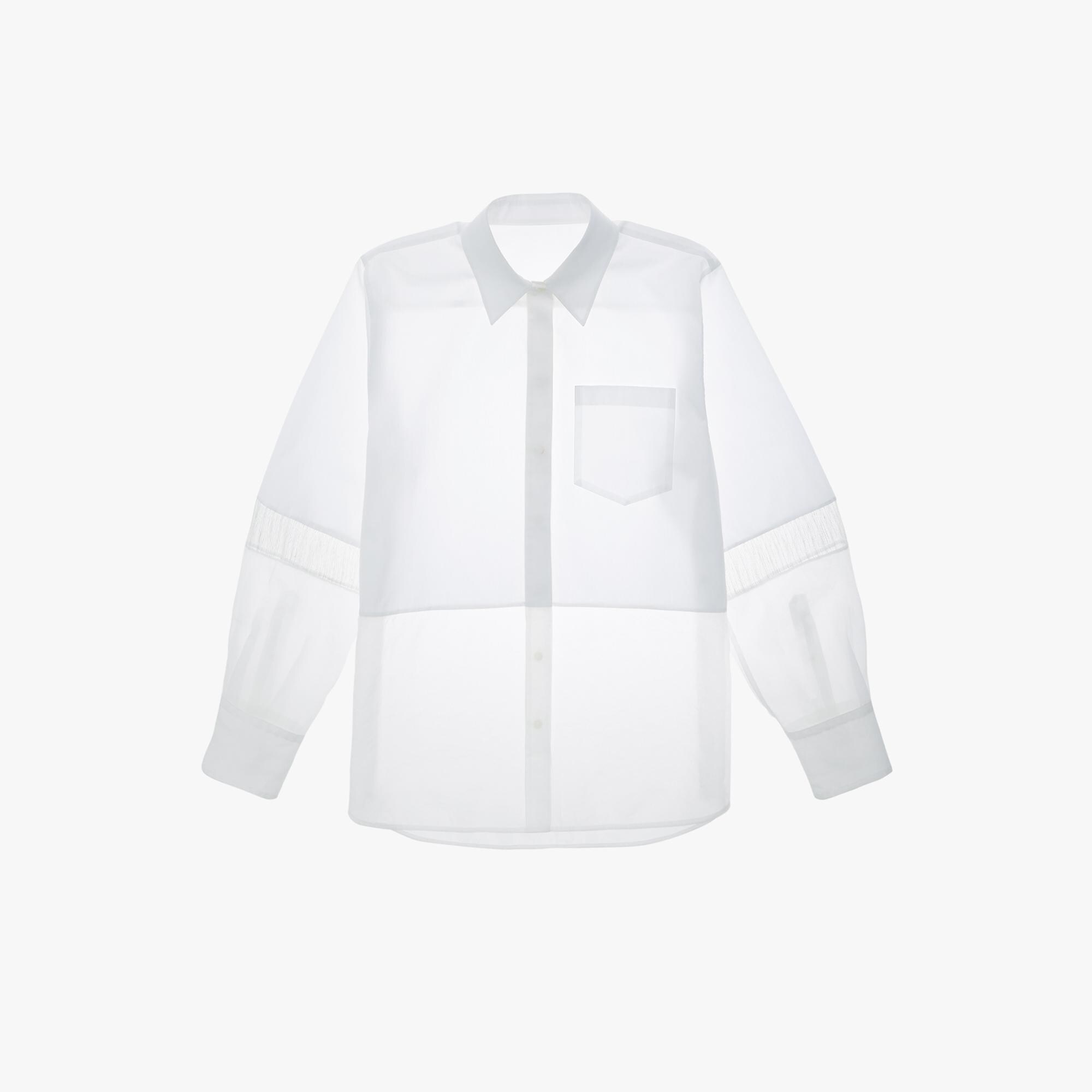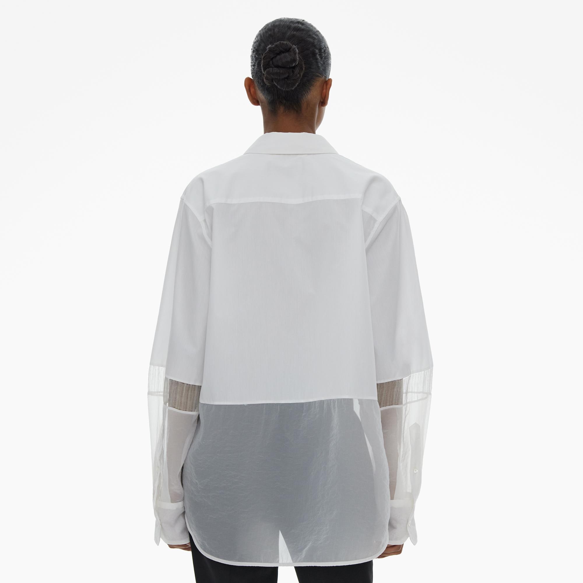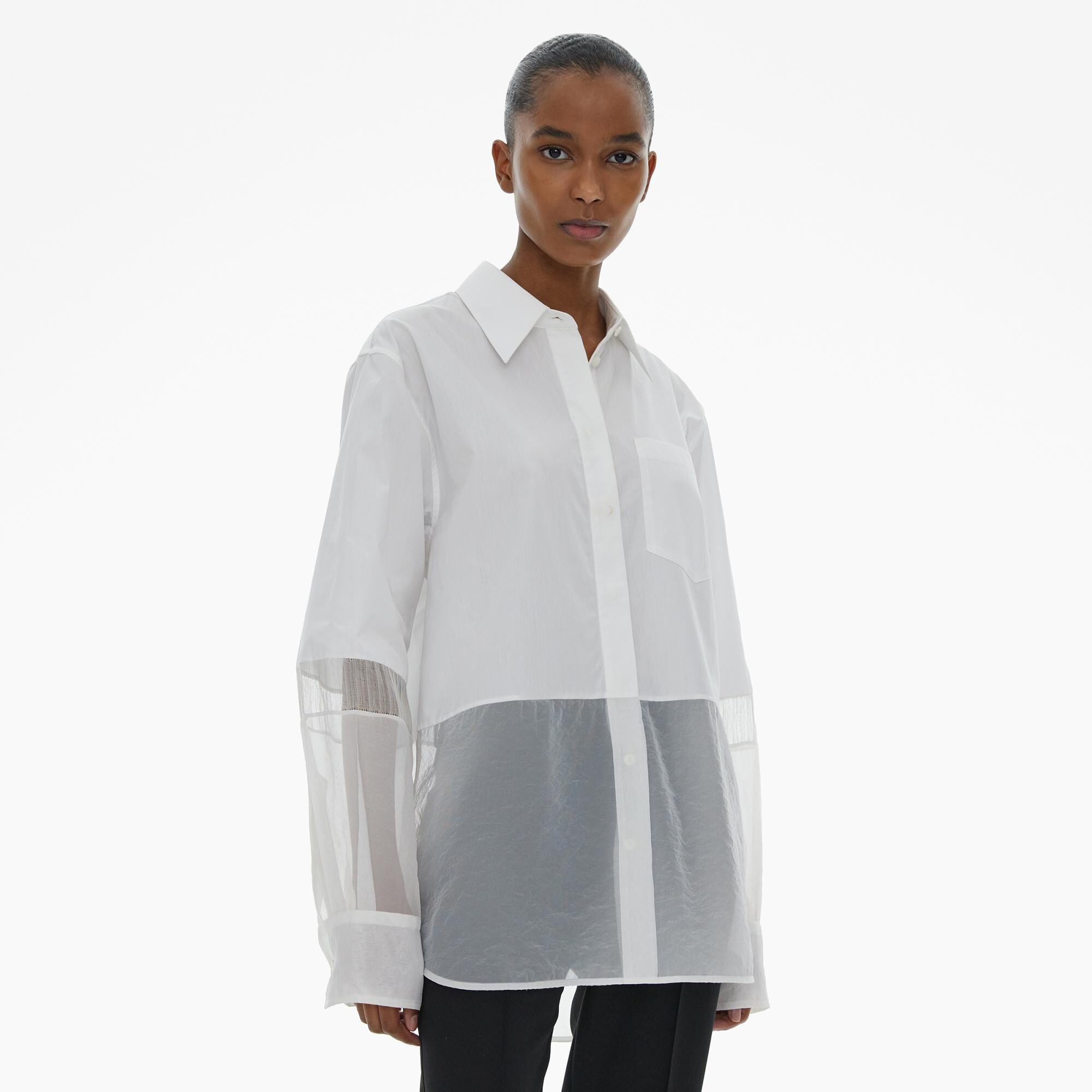 The Helmut Lang Shirt is a relaxed style in an Italian poplin with a pointed collar, front patch pocket, button closures and cuffs, and organza and silk-linen trimmed sleeves and hem.
