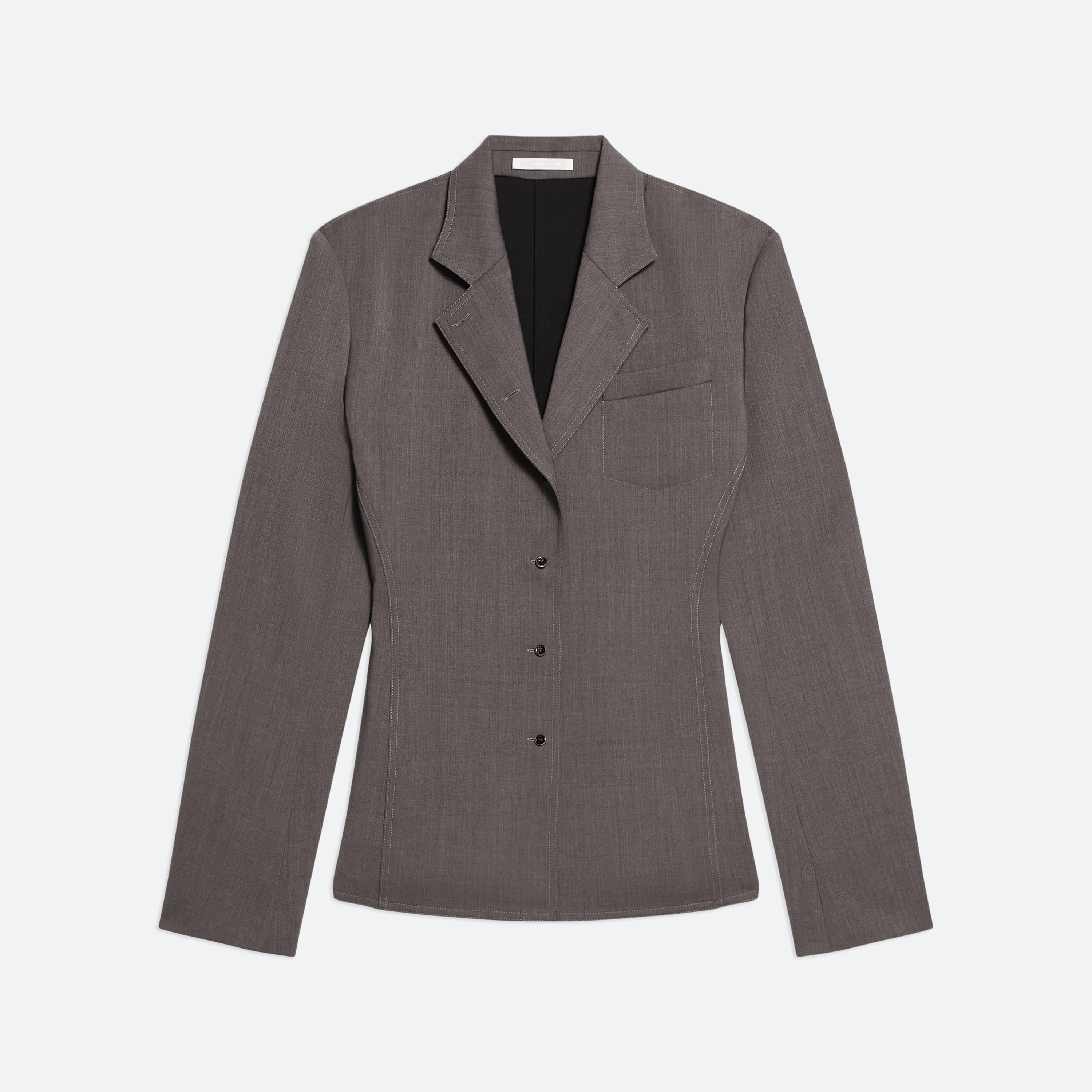 Tailored shirt in virgin Italian wool suiting, with a notched collar and classic suit jacket details. Back panel cut from a dense, structured ponte knit for an easy fit.