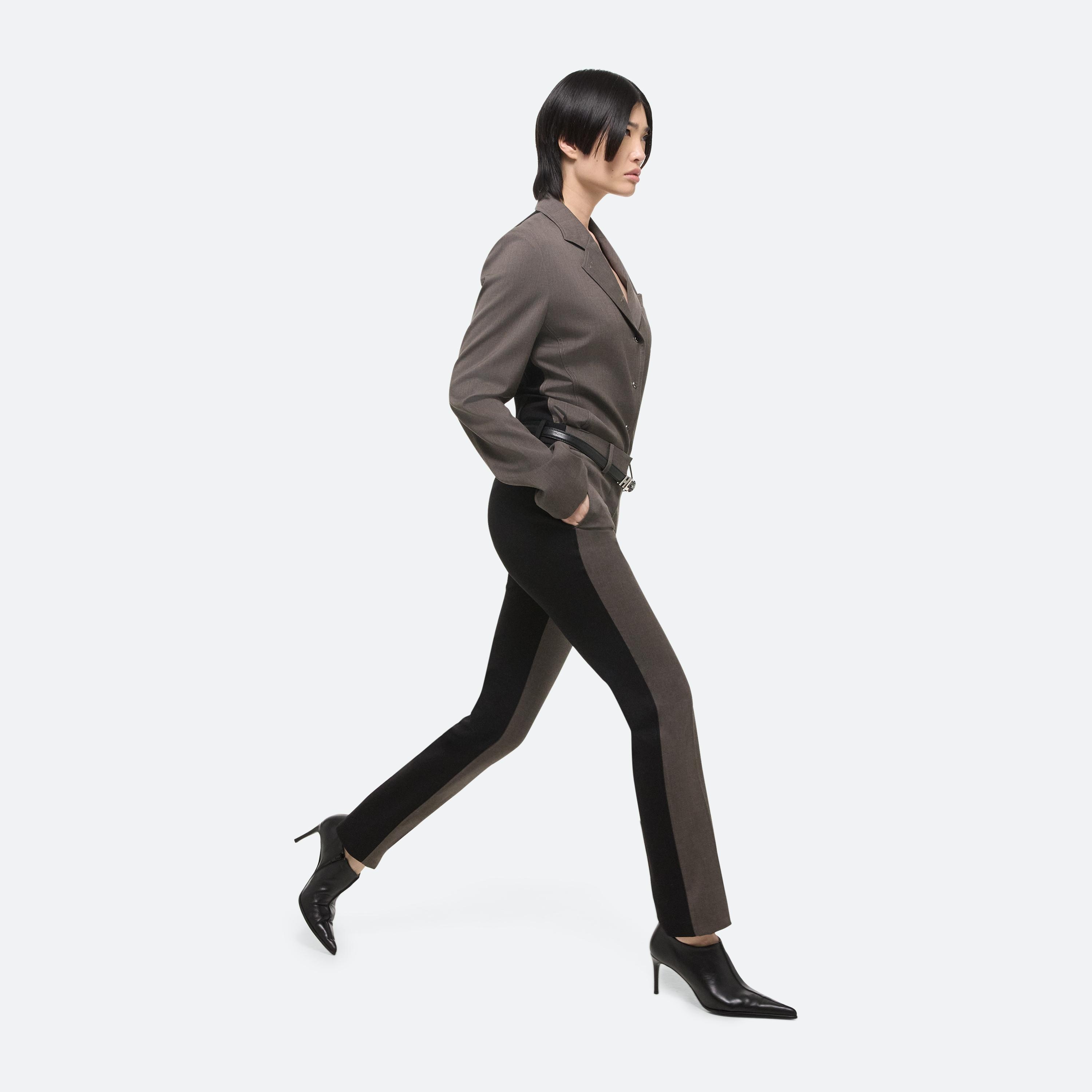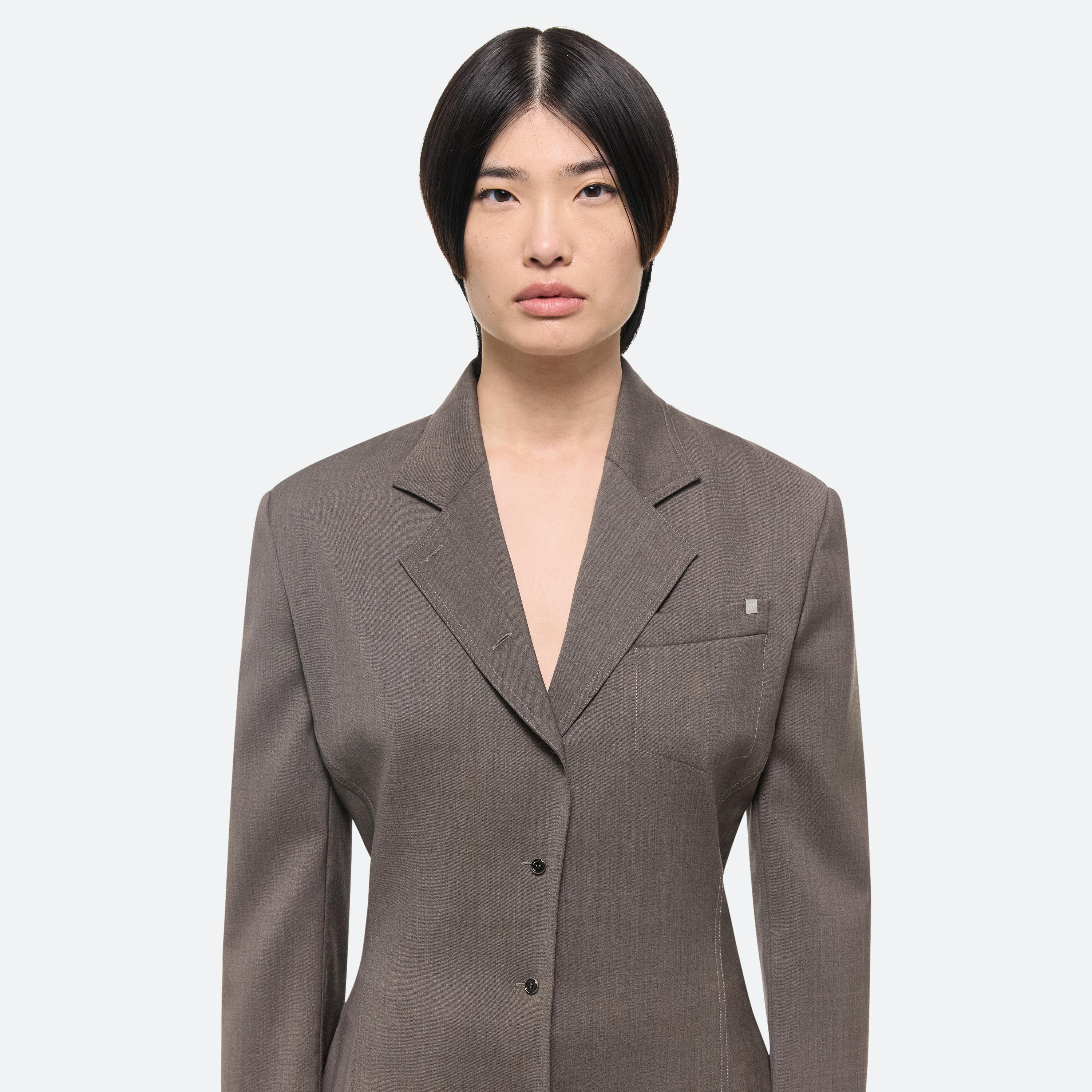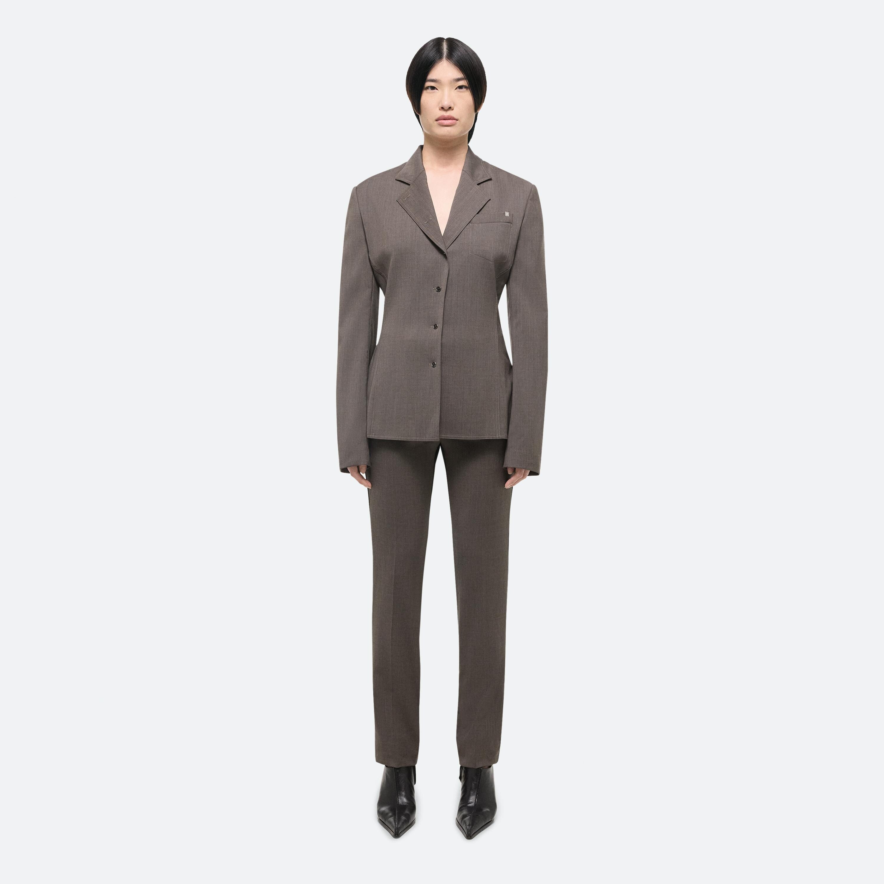 Tailored shirt in virgin Italian wool suiting, with a notched collar and classic suit jacket details. Back panel cut from a dense, structured ponte knit for an easy fit.