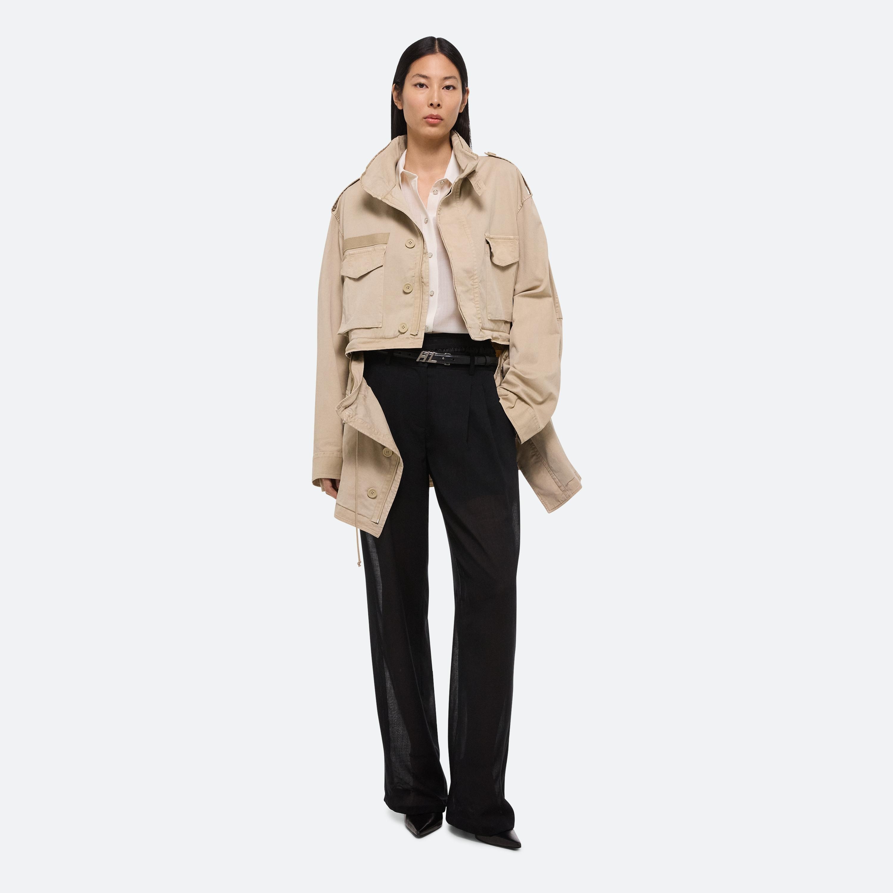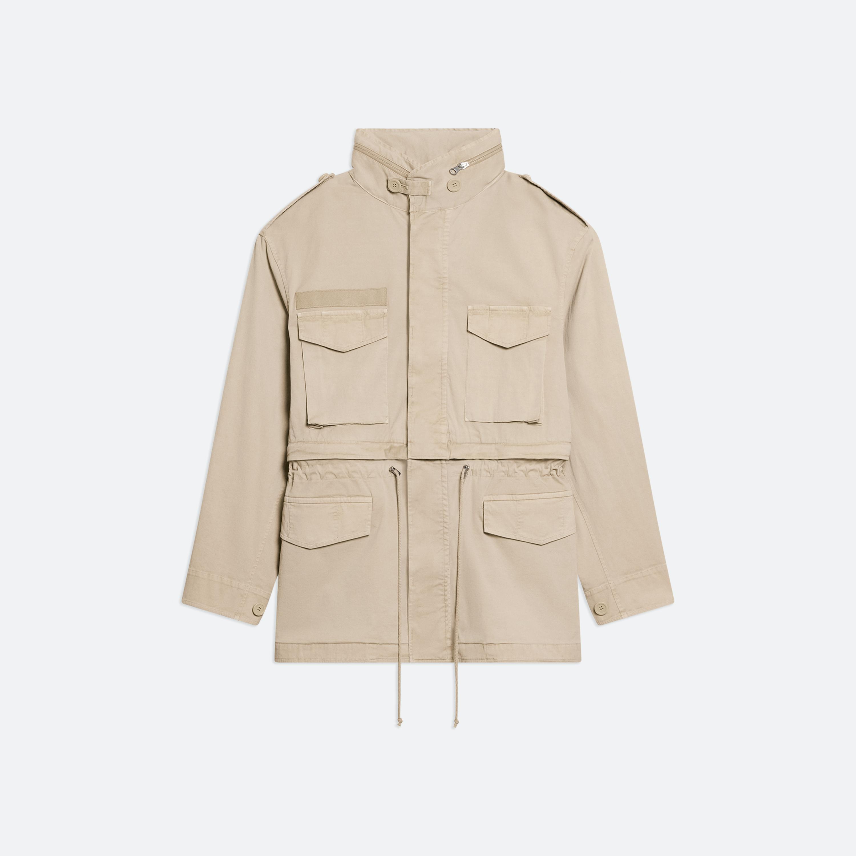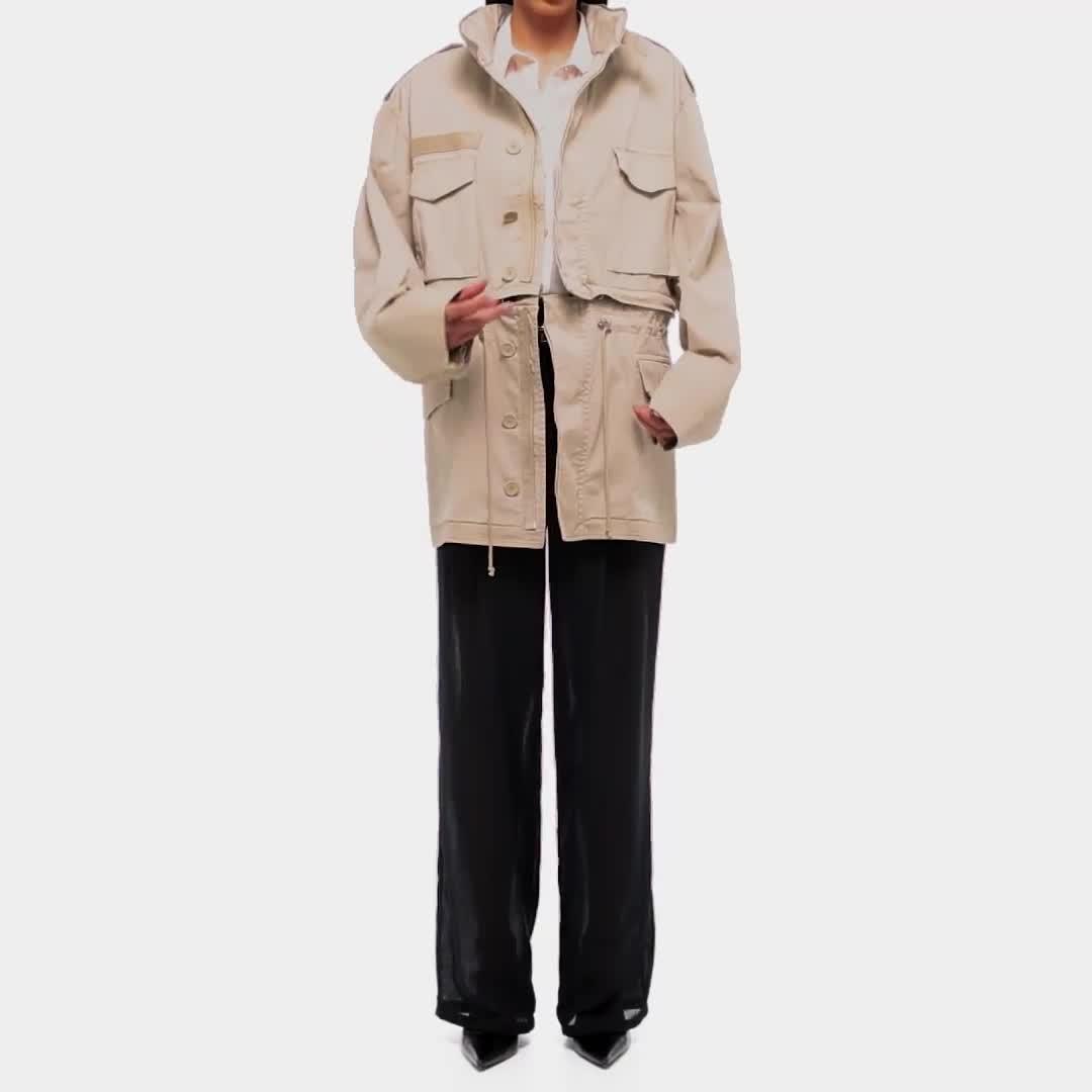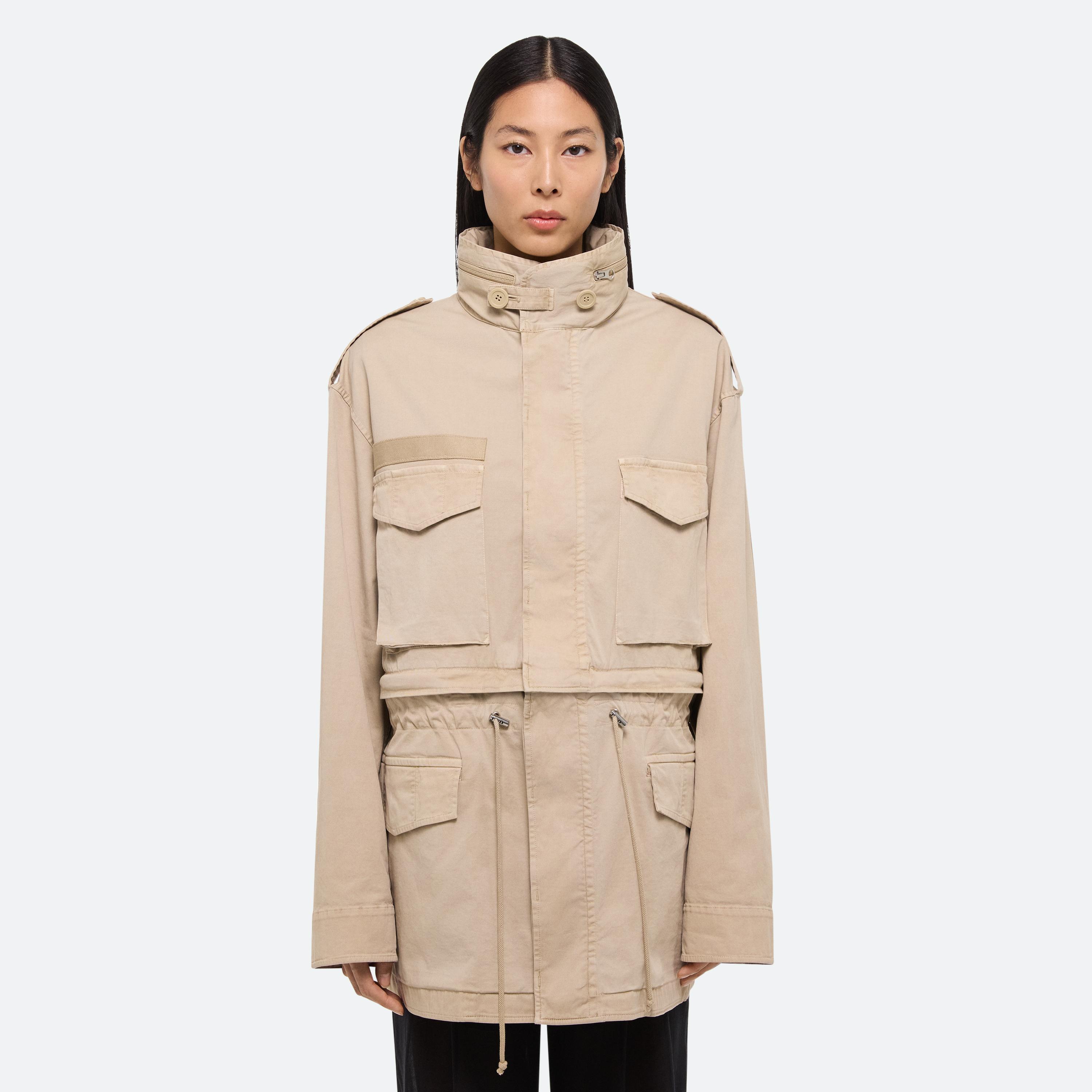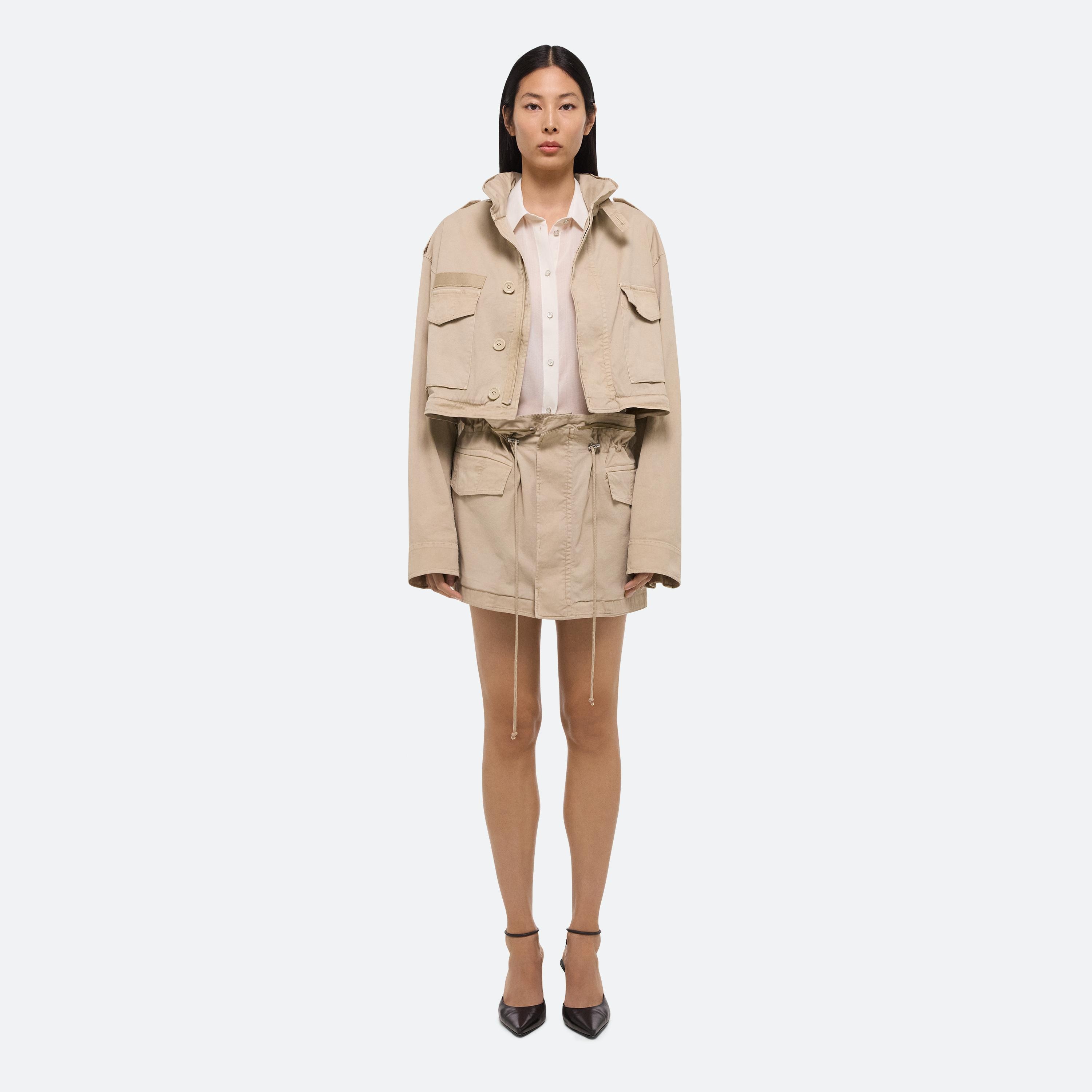 Convertible field jacket in lightweight cotton twill. Open the concealed zipper at the waist to transform the jacket into a cropped fit and mini skirt with a cinched waist. Finished with classic details and garment-dyed for a soft, lived-in feel.
