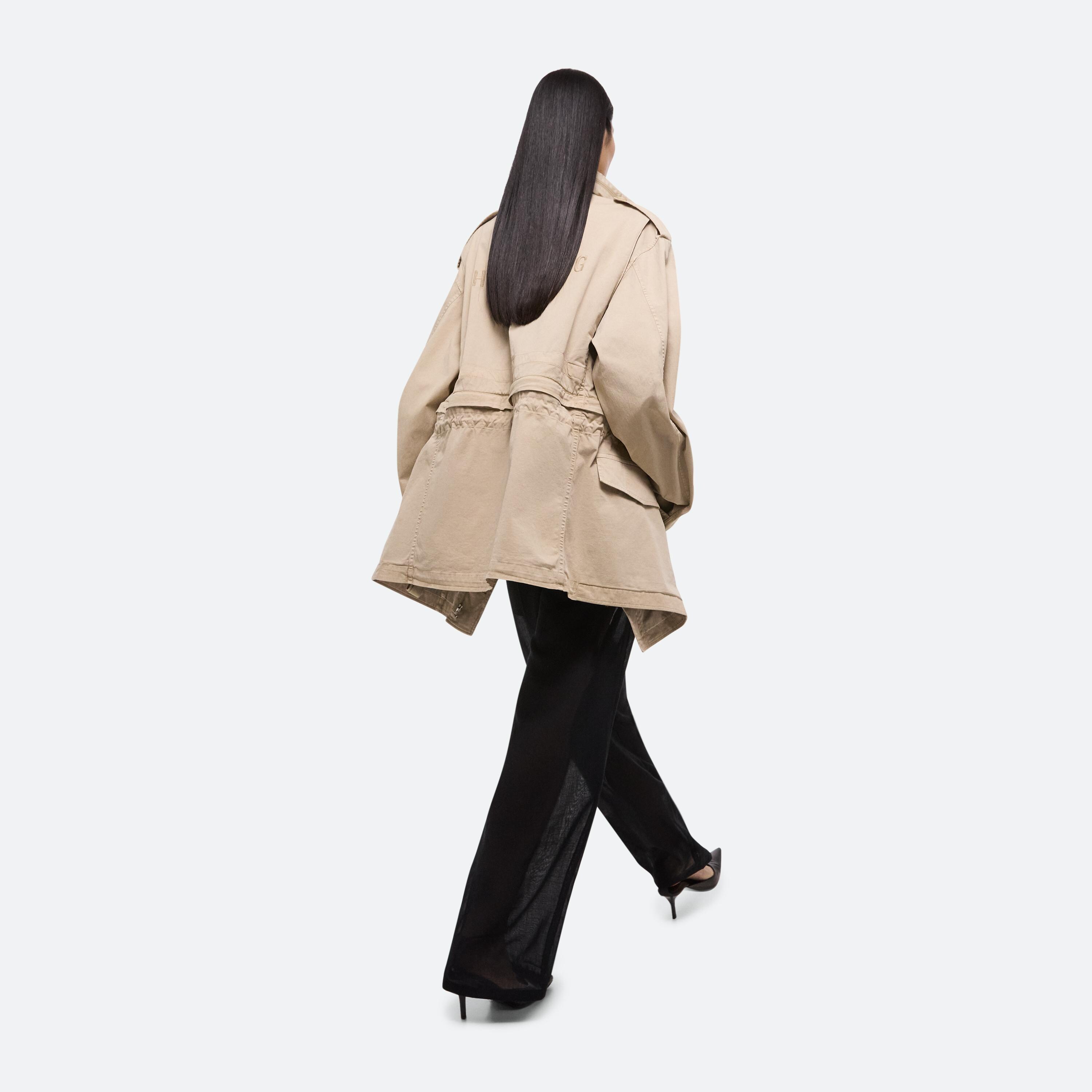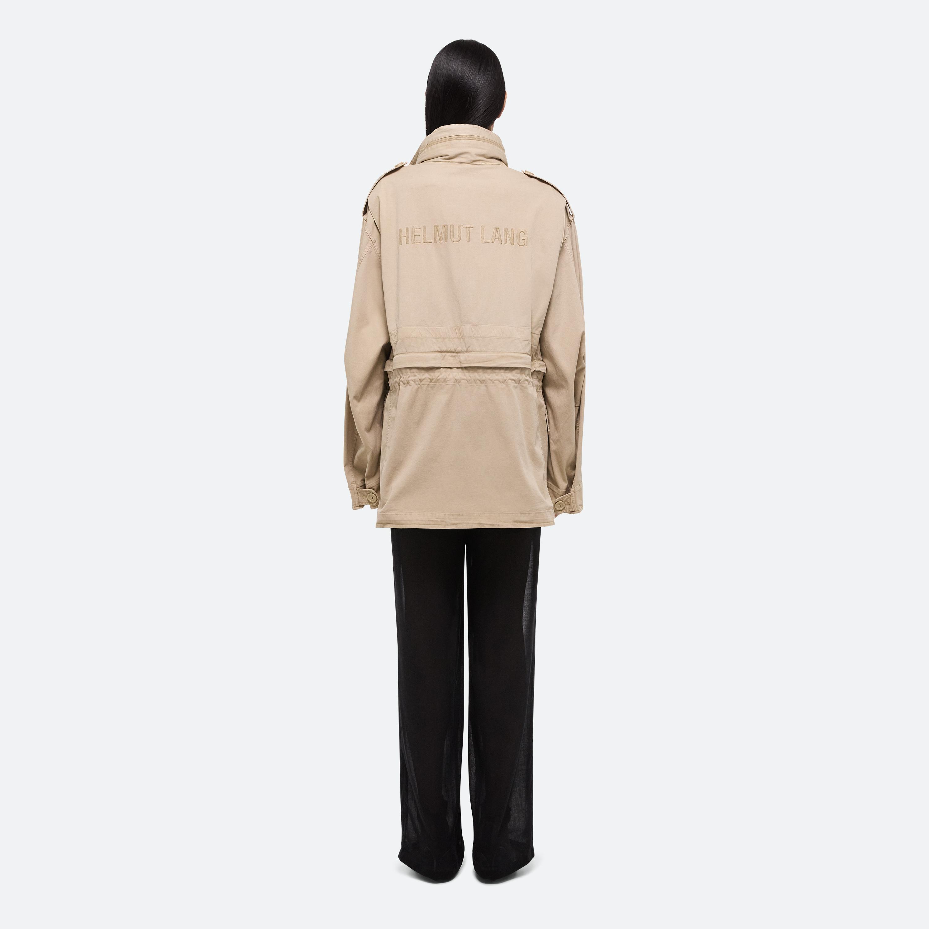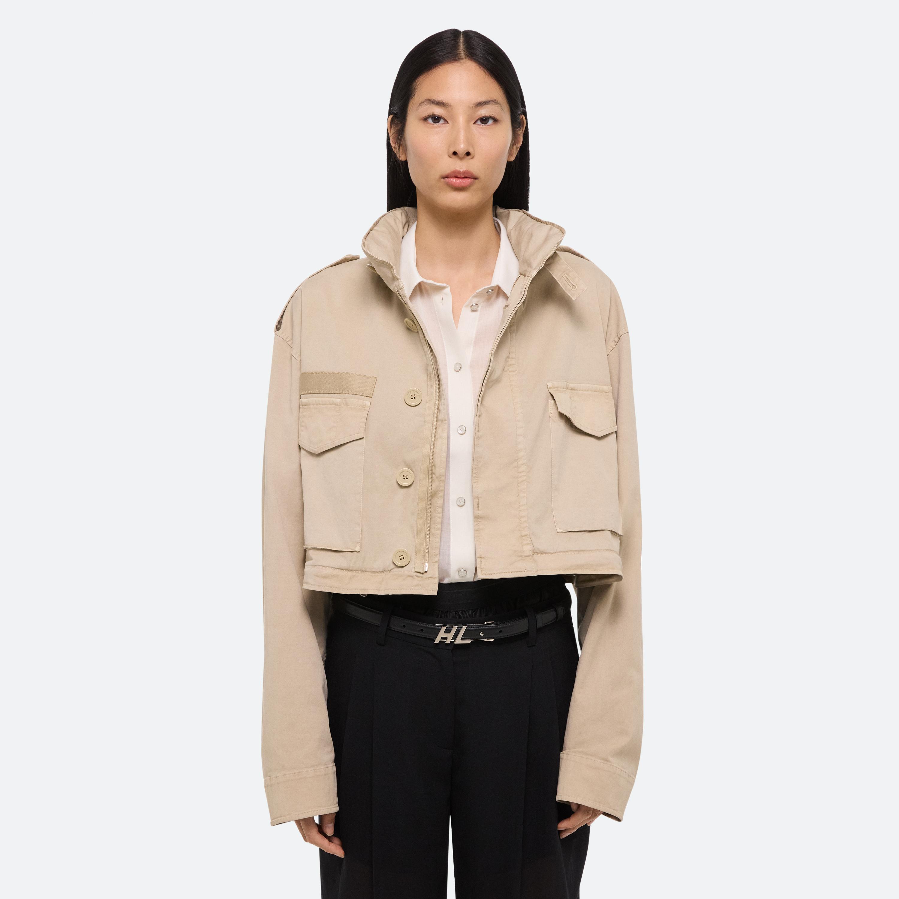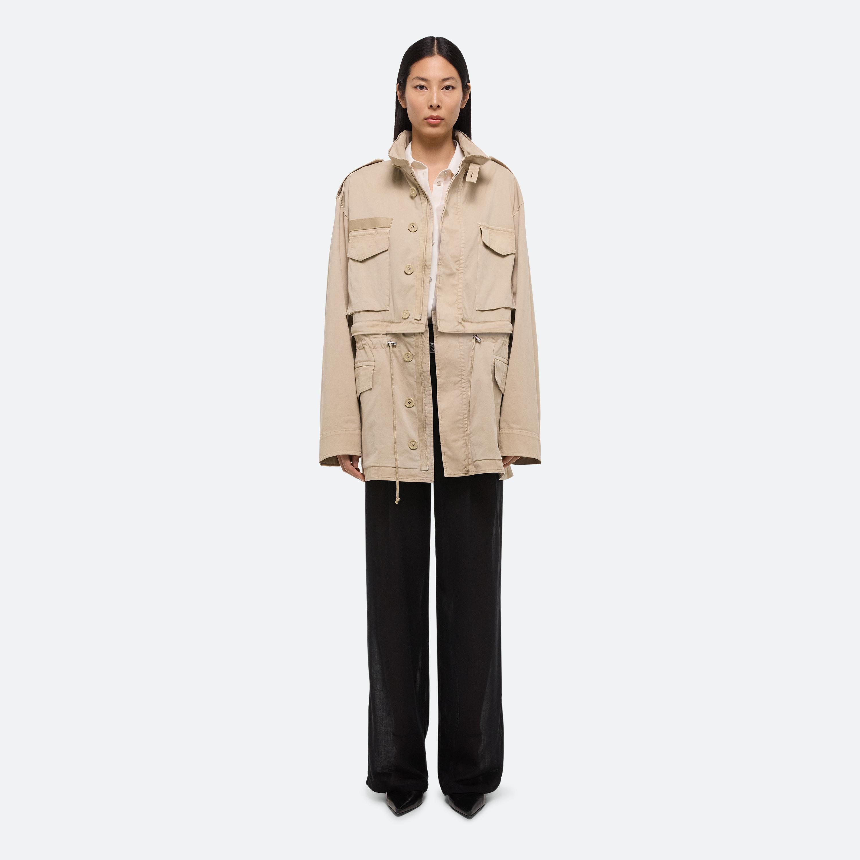 Convertible field jacket in lightweight cotton twill. Open the concealed zipper at the waist to transform the jacket into a cropped fit and mini skirt with a cinched waist. Finished with classic details and garment-dyed for a soft, lived-in feel.