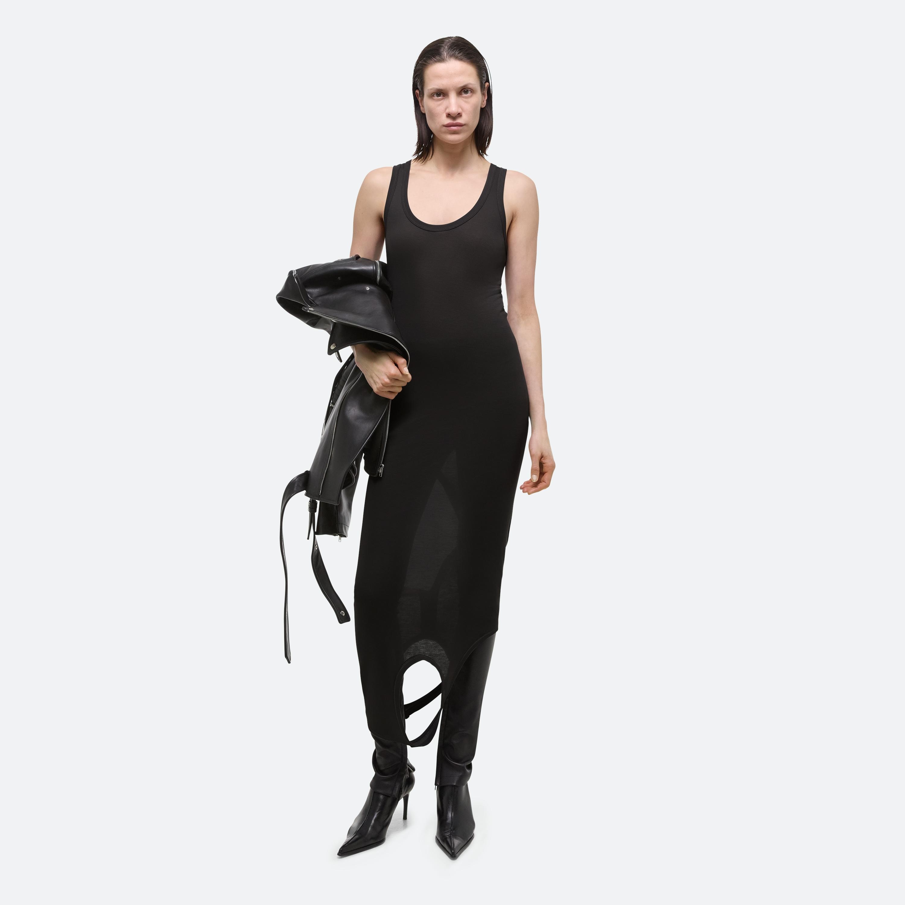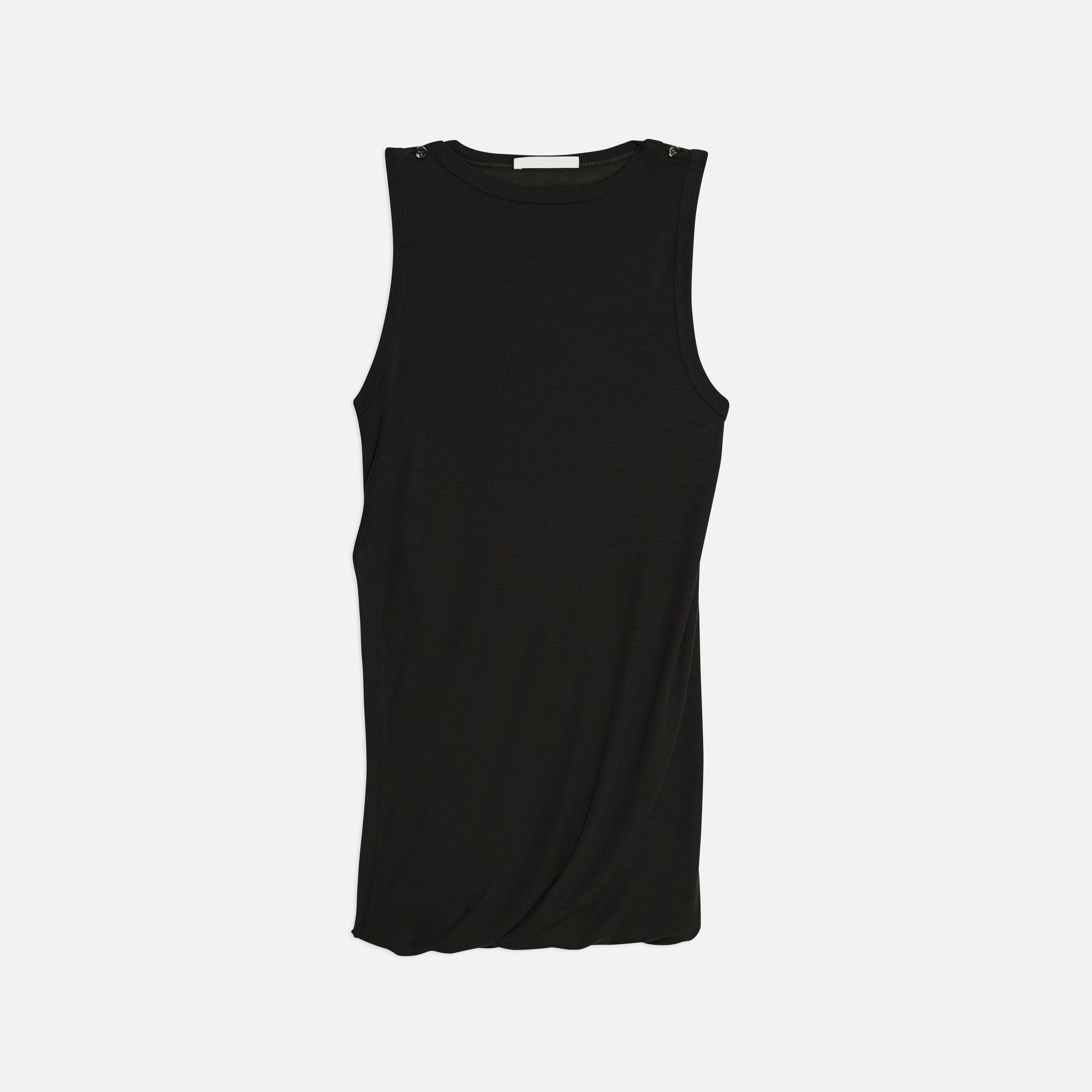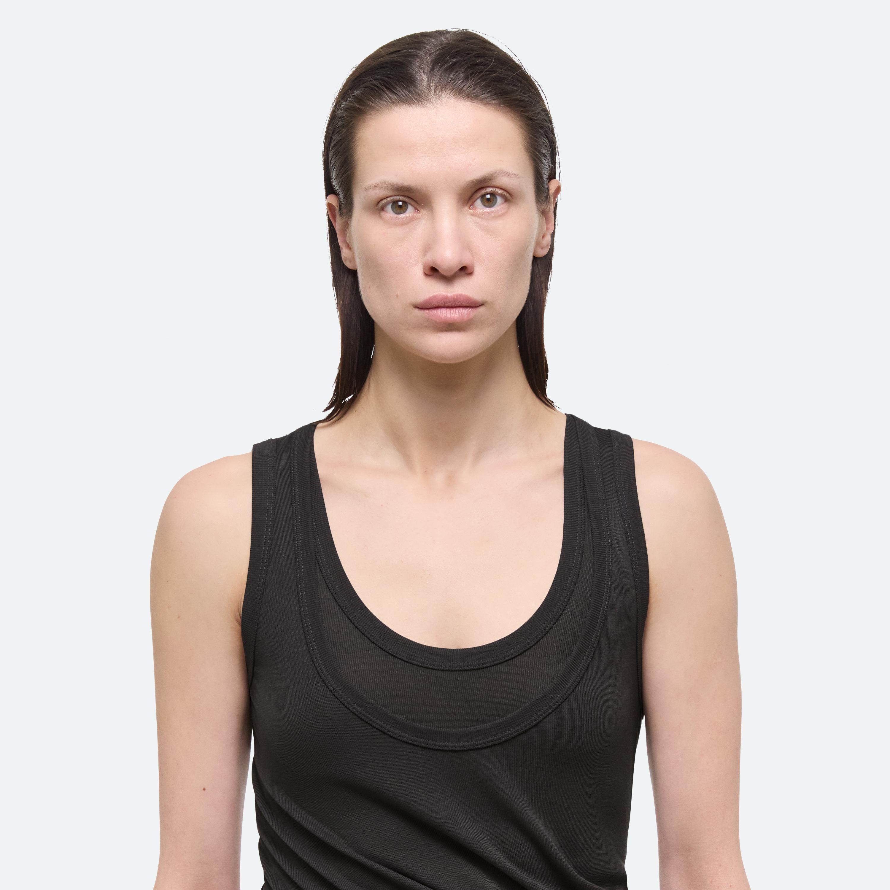 Layered tank top in a stretch viscose rib from Portugal. Twist and loop the two necklines to create a custom style, or wear it open as a dress.