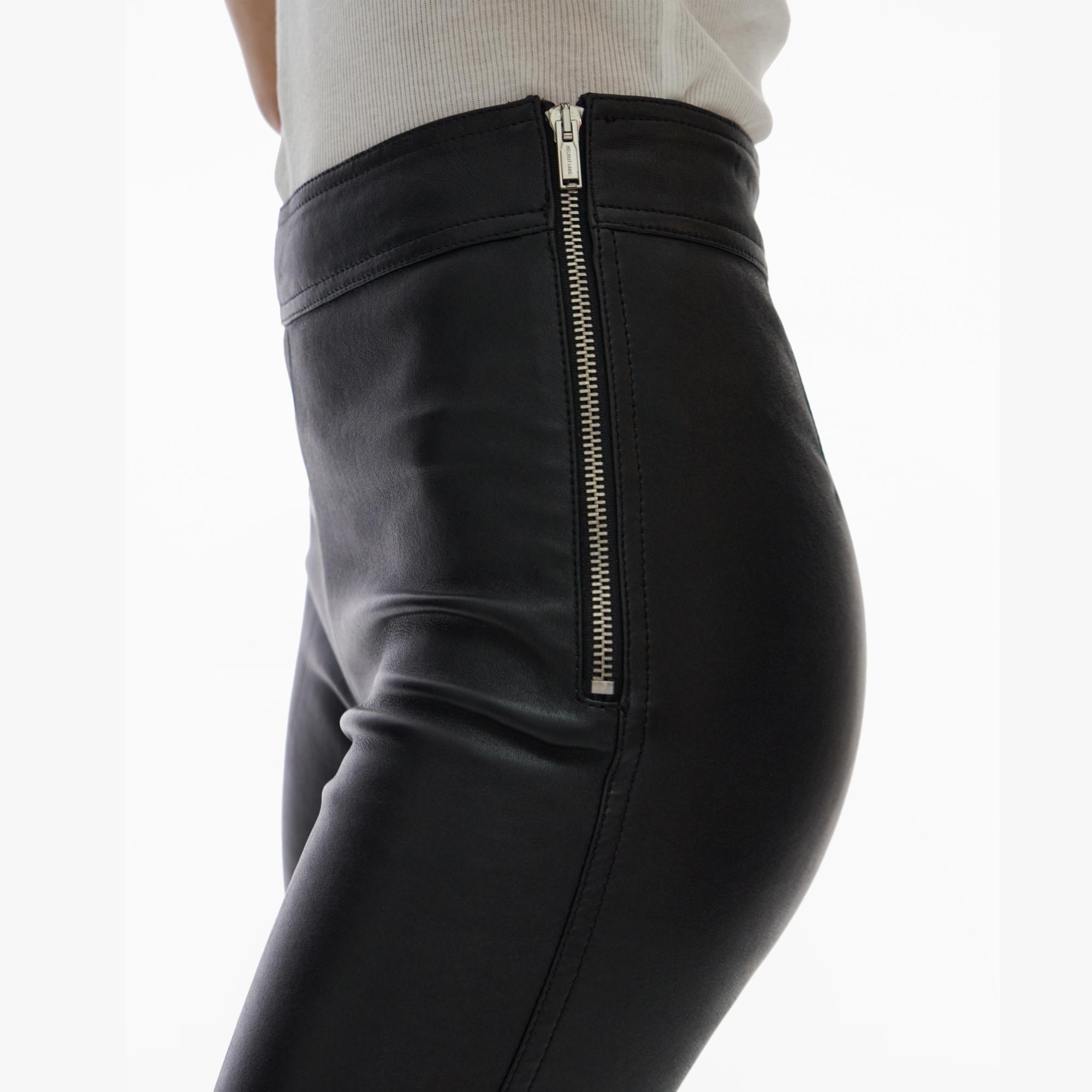 The Helmut Lang Core Slit Leather Pants are constructed in smooth lambskin; a key fabrication group in the Helmut Lang DNA. The stretchy backing supports the high-rise waistband and a concealed side zipper allows for comfortable wear in a legging-style pant.