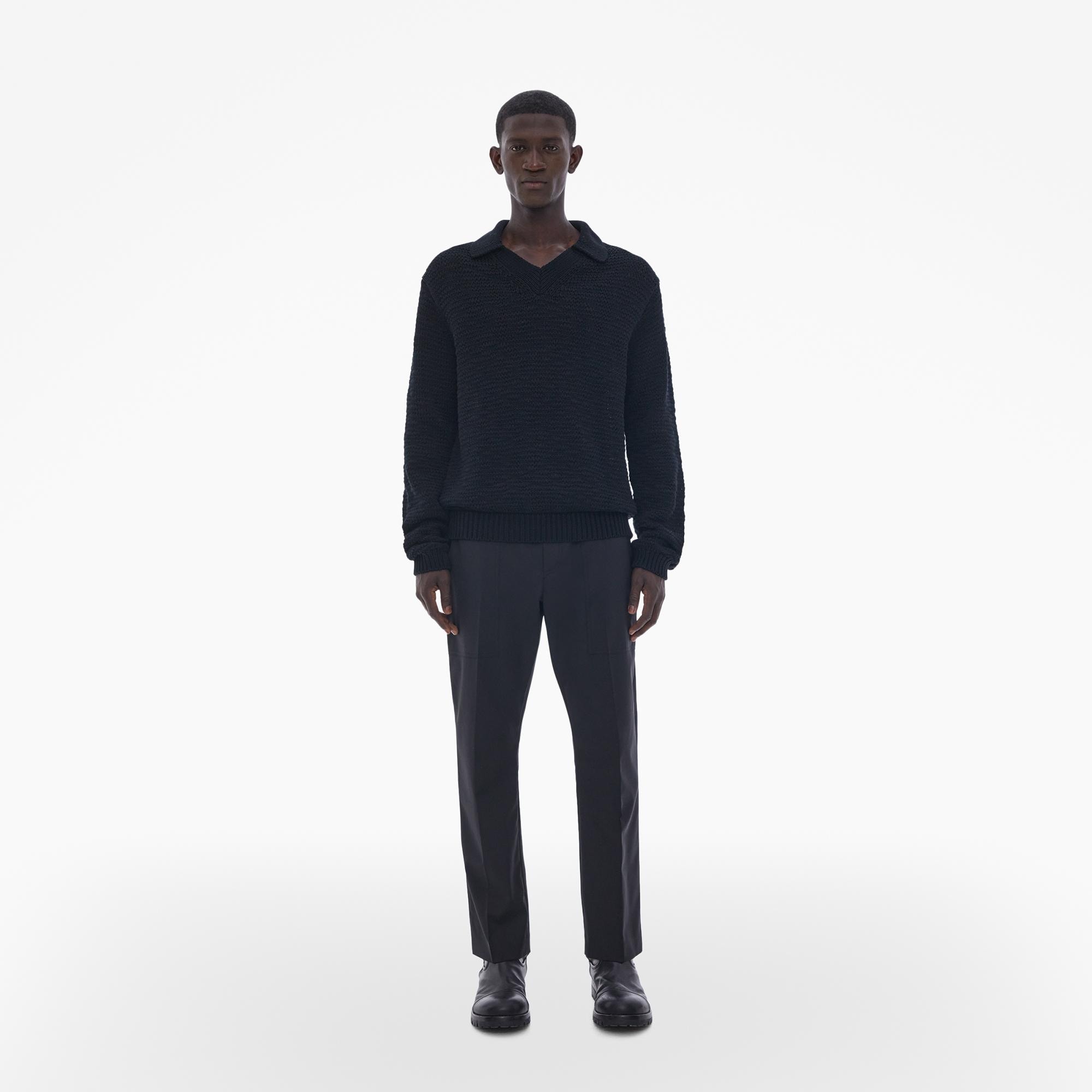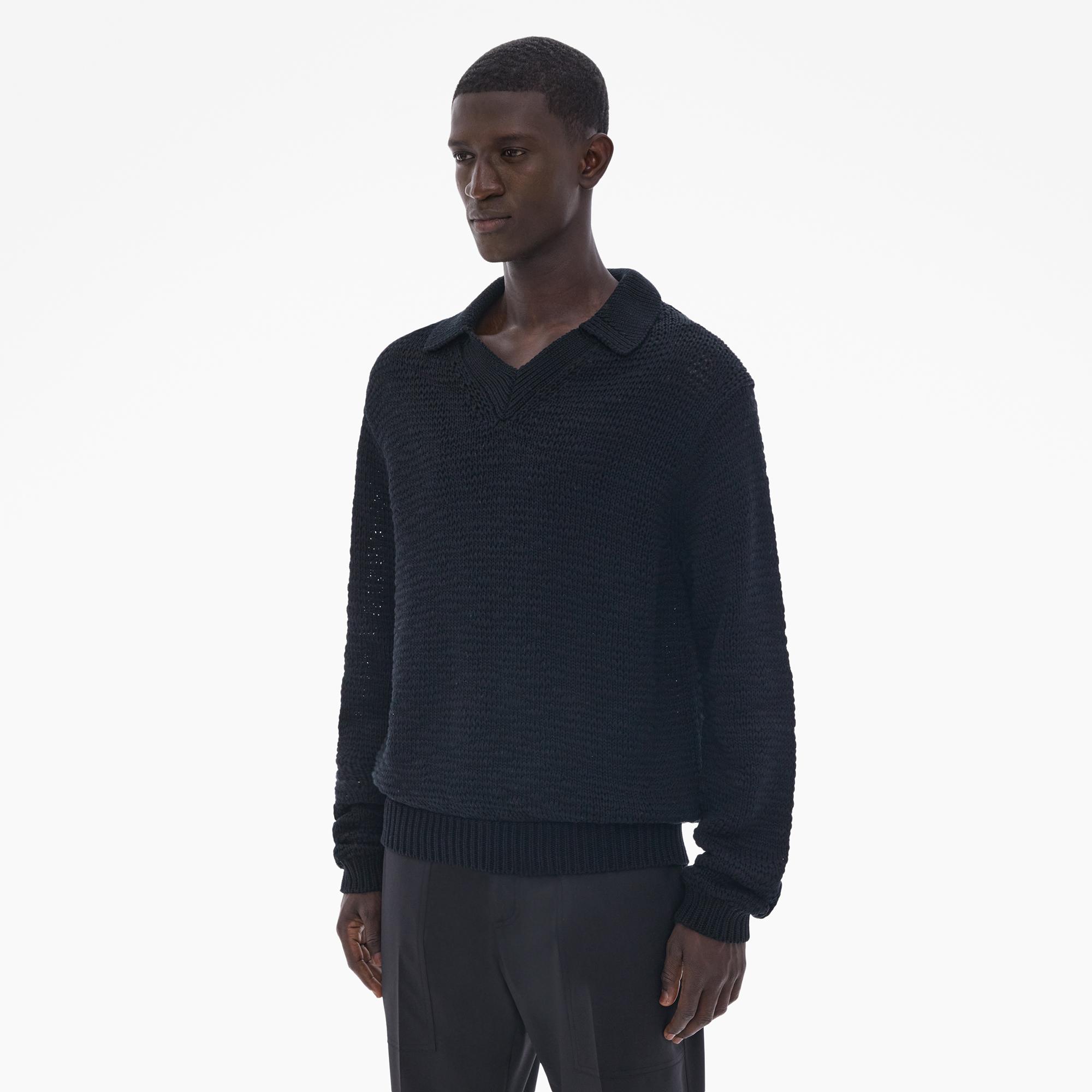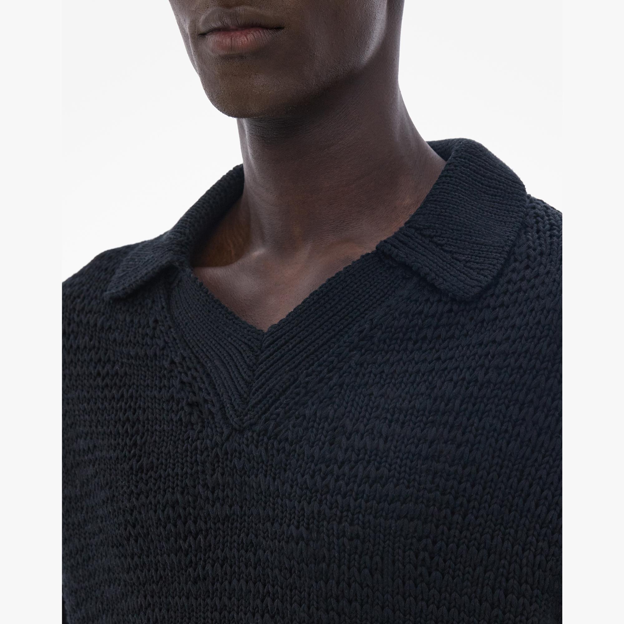 The Helmut Lang Polo Sweater is a relaxed style in a loosely knit cotton crafted in Italy with a pointed collar, a notched neckline, long sleeves, and rib knit details.