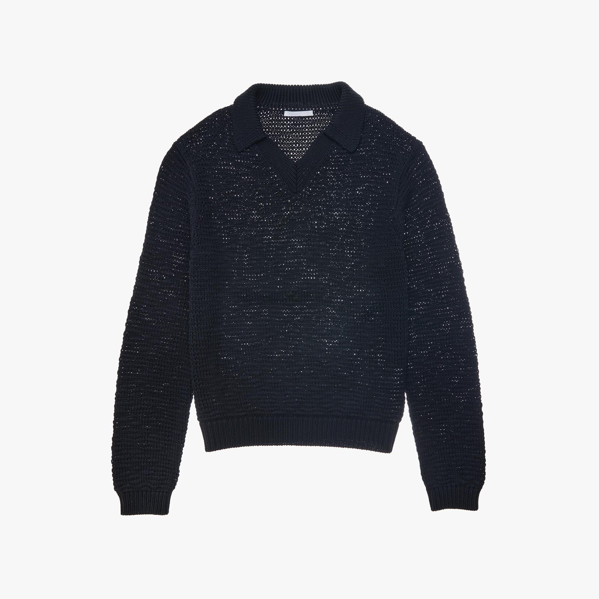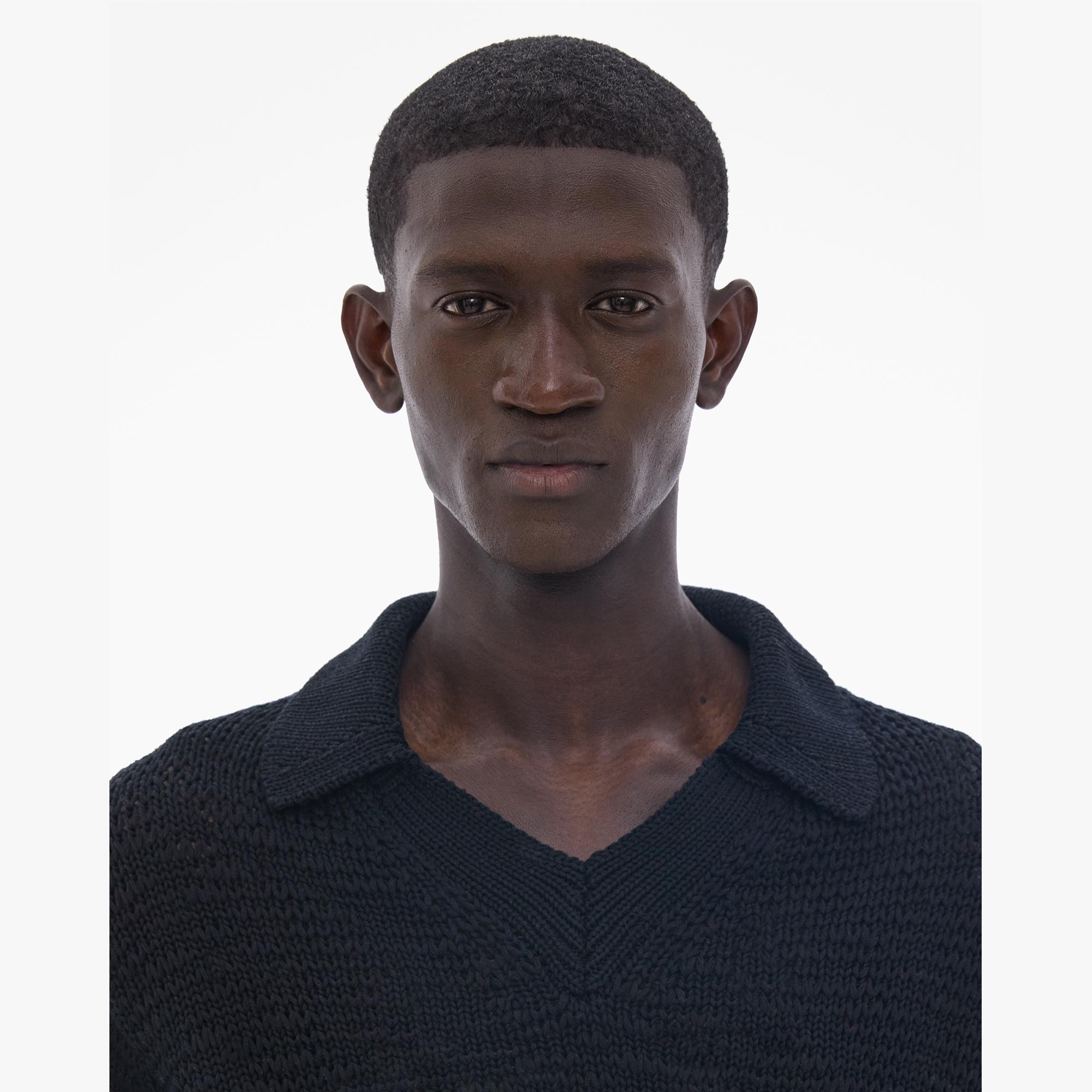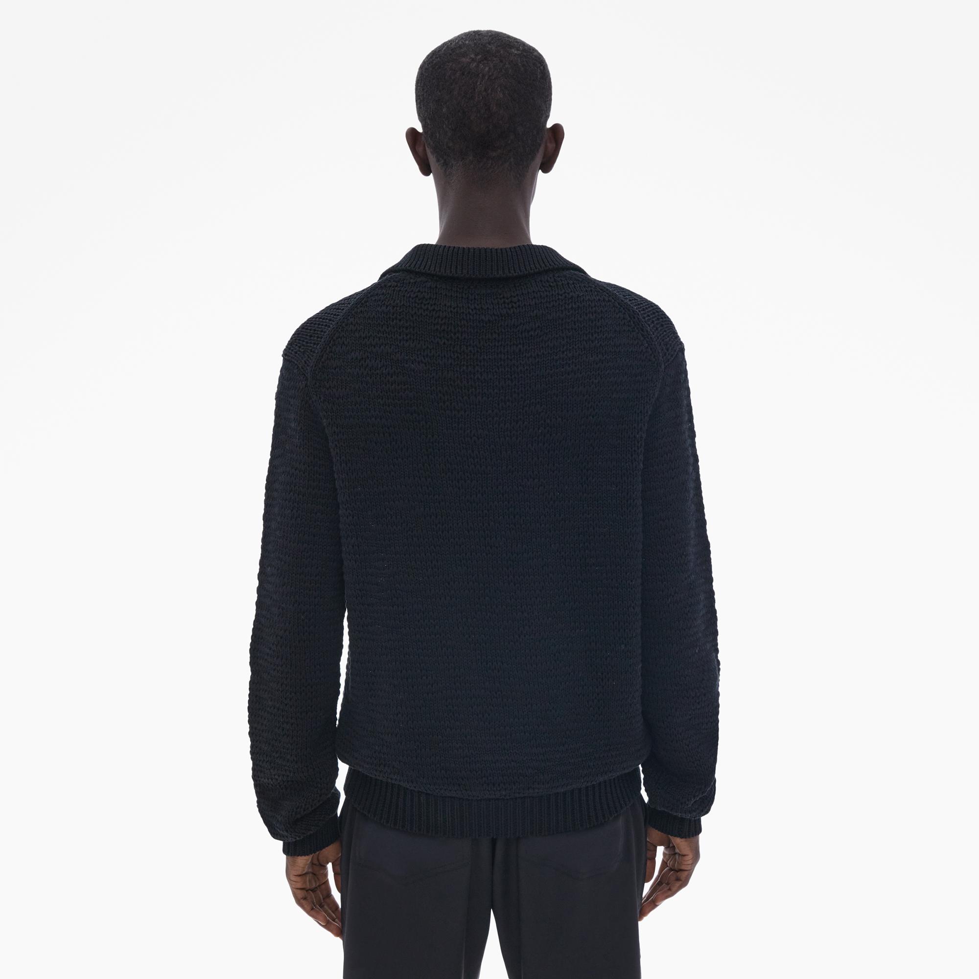 The Helmut Lang Polo Sweater is a relaxed style in a loosely knit cotton crafted in Italy with a pointed collar, a notched neckline, long sleeves, and rib knit details.