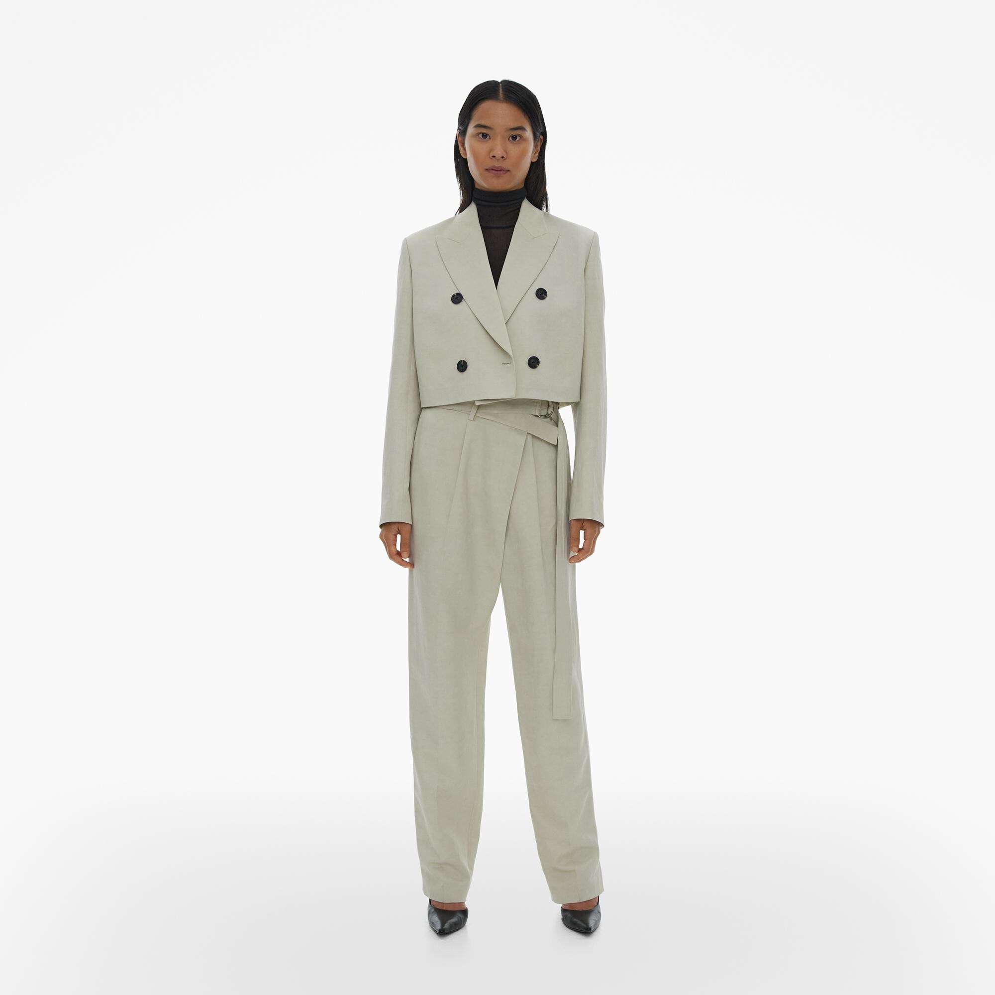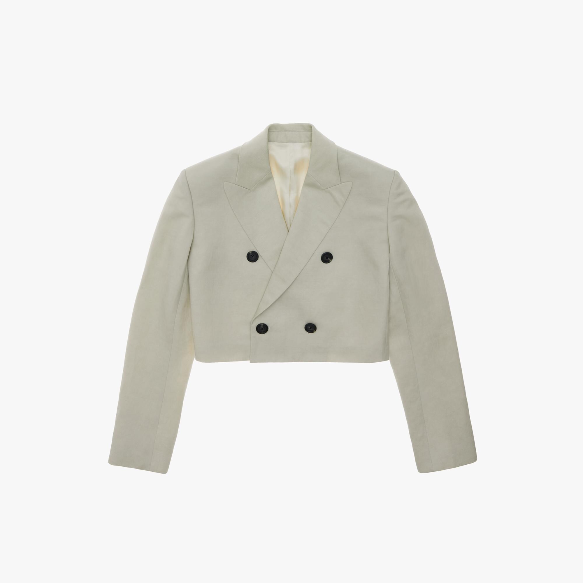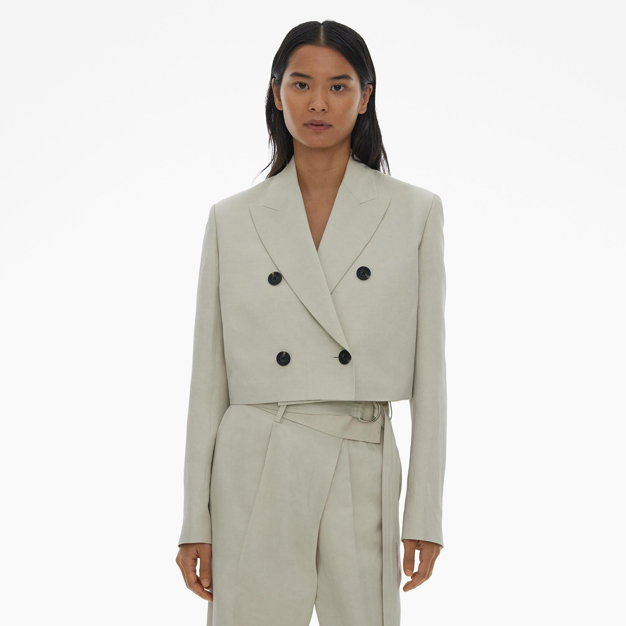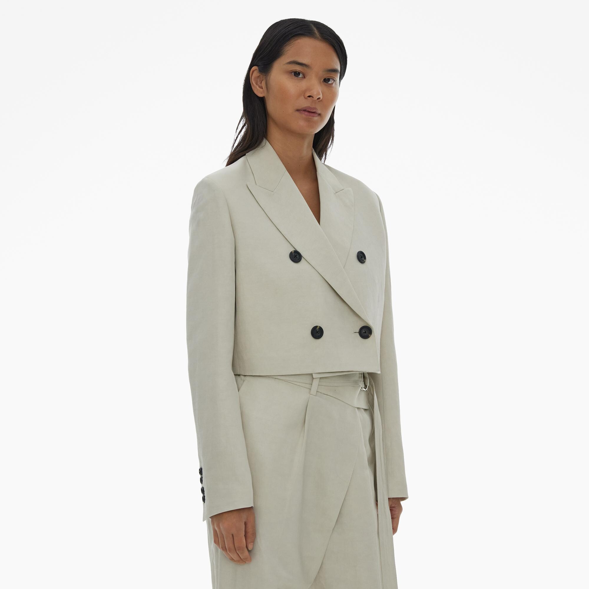 The Helmut Lang Double-Breasted Blazer is a cropped style in cotton-linen twill with structured shoulders, notched lapels, and button front closures.