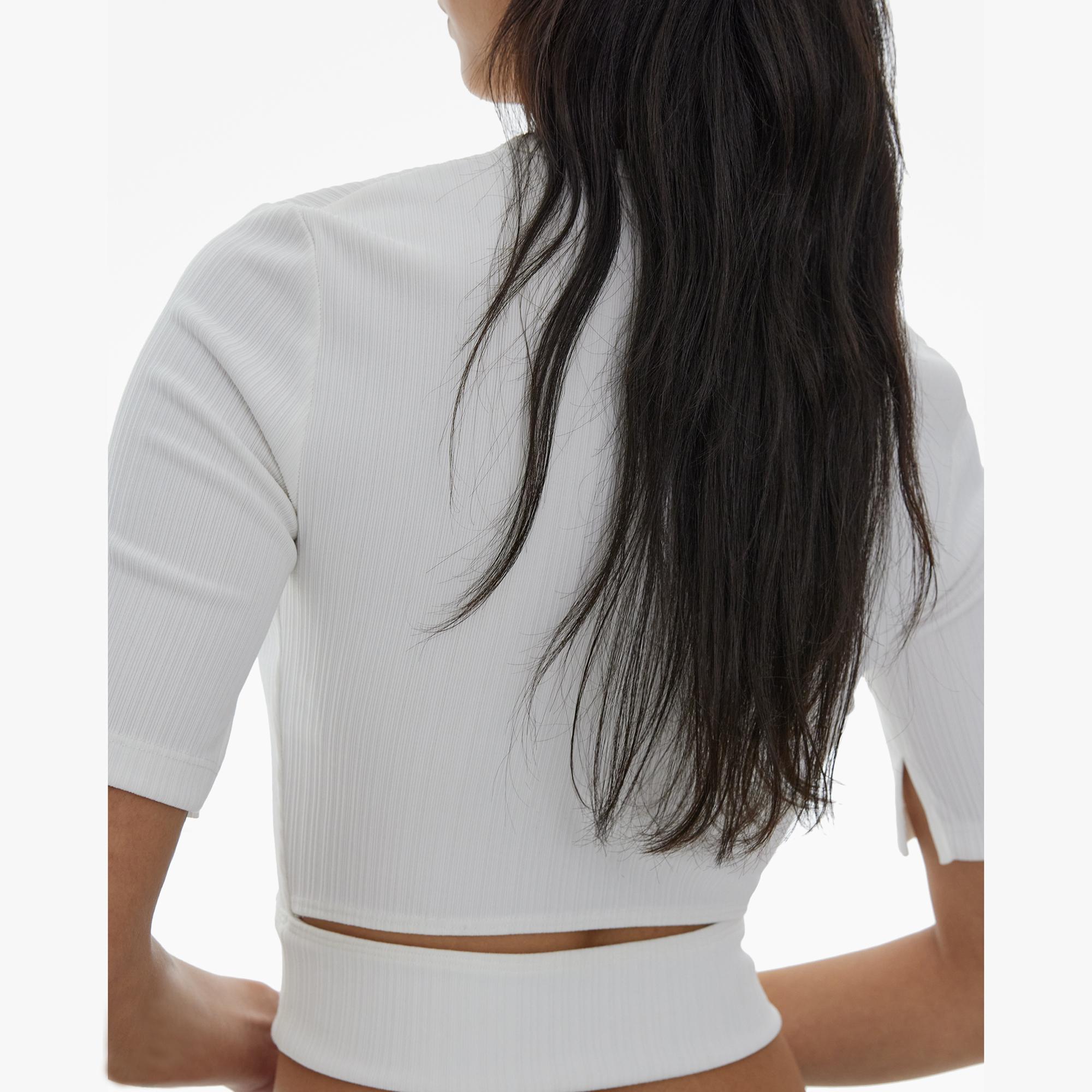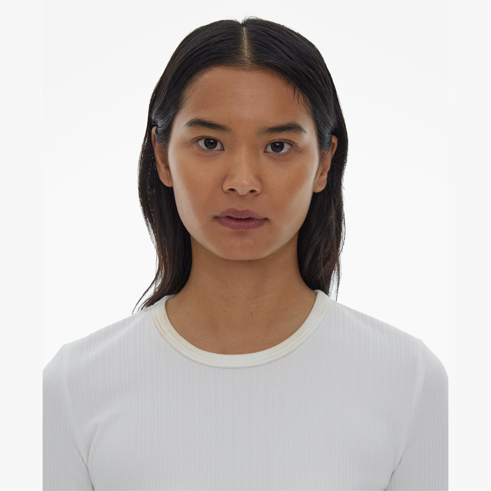 The Helmut Lang Cropped Tee is a slim-fitting style in cotton rib with a crew neckline, and short elbow-length sleeves.