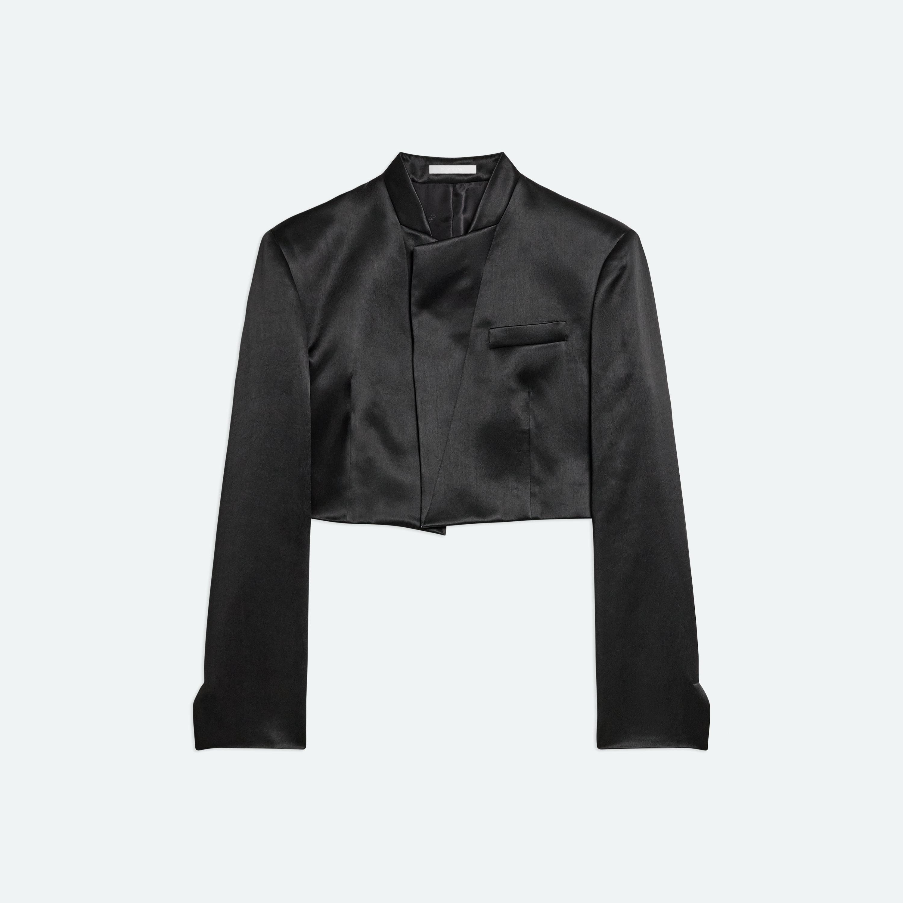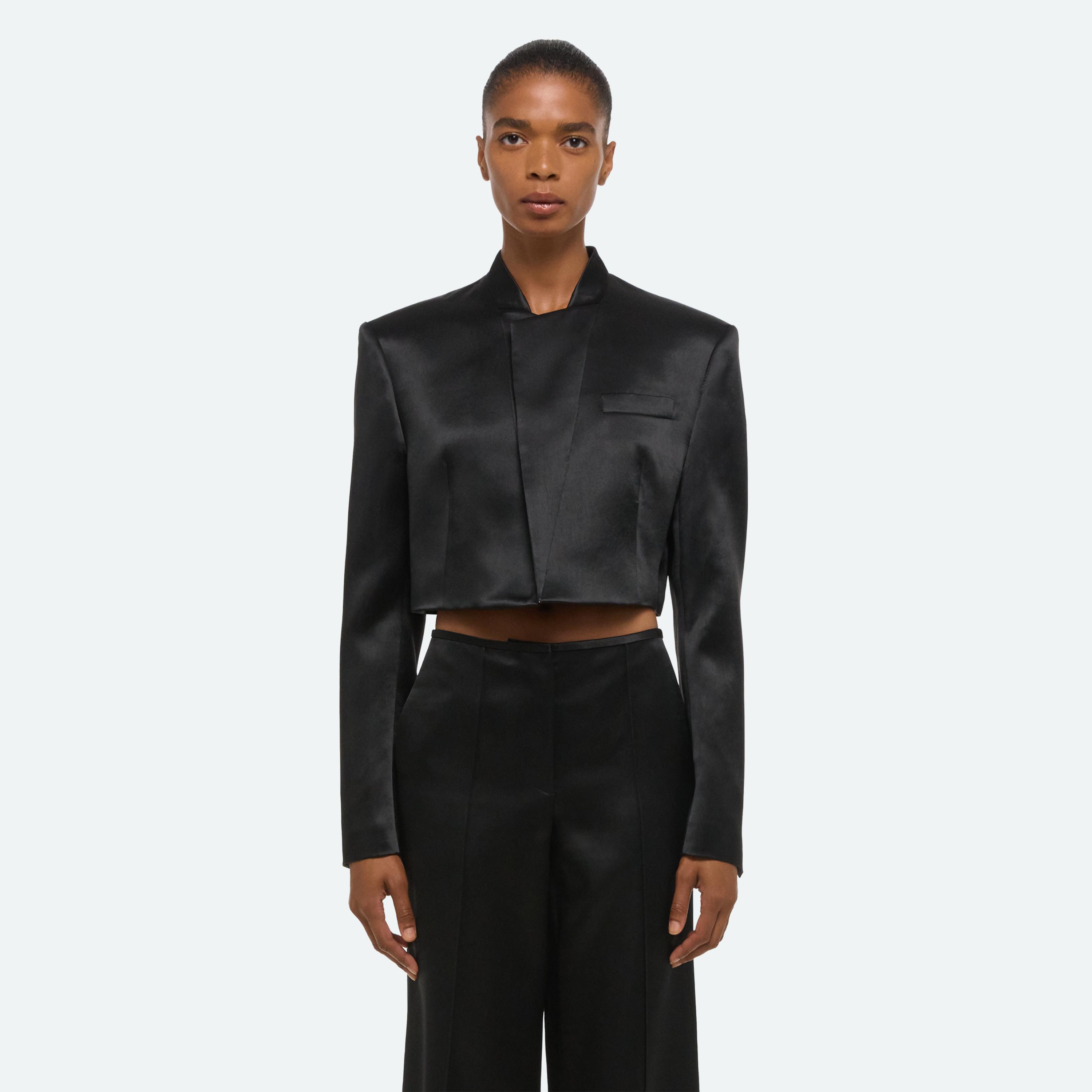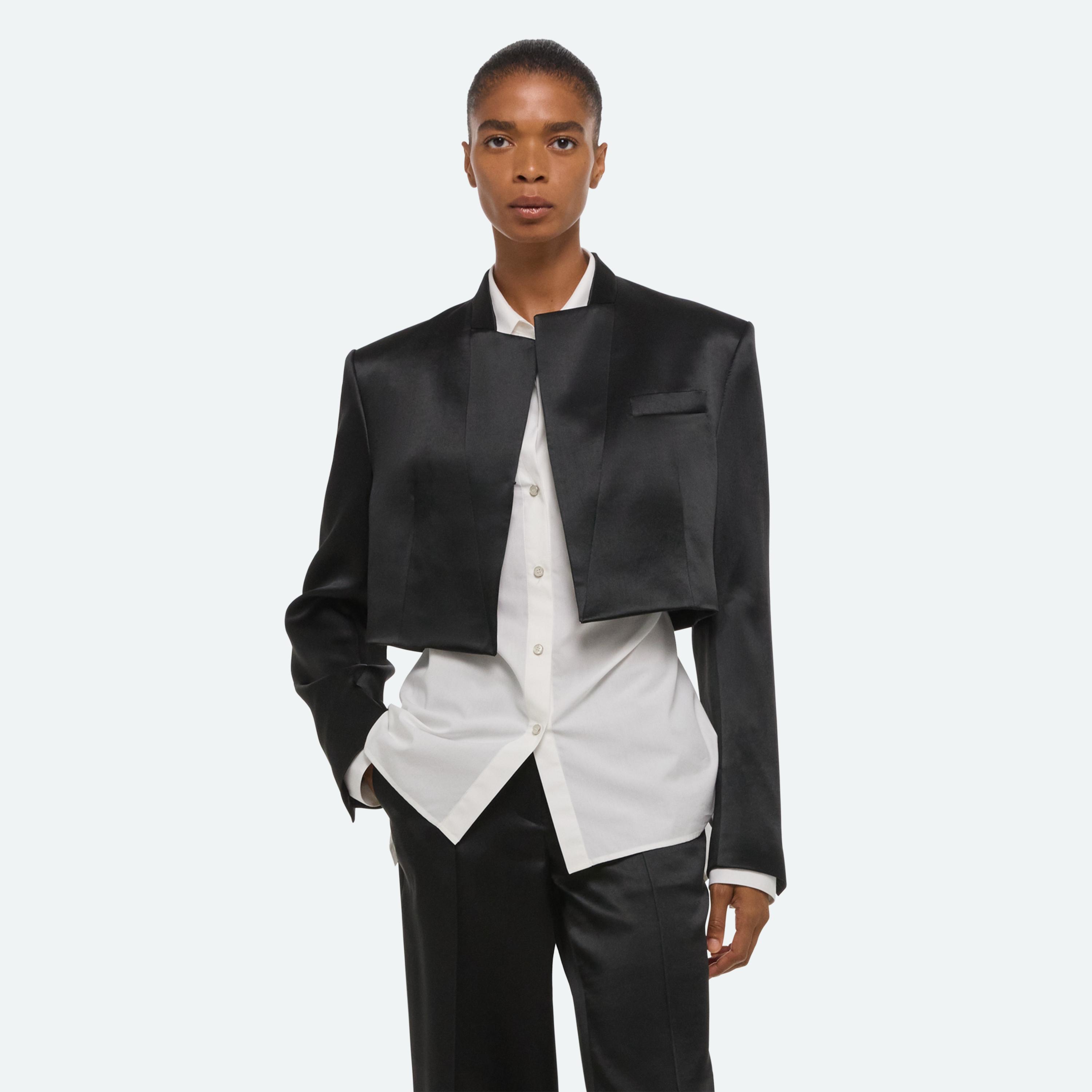 Cropped blazer in duchesse satin with a stand collar and structured shoulders. Matches the Minimal Satin Pants.