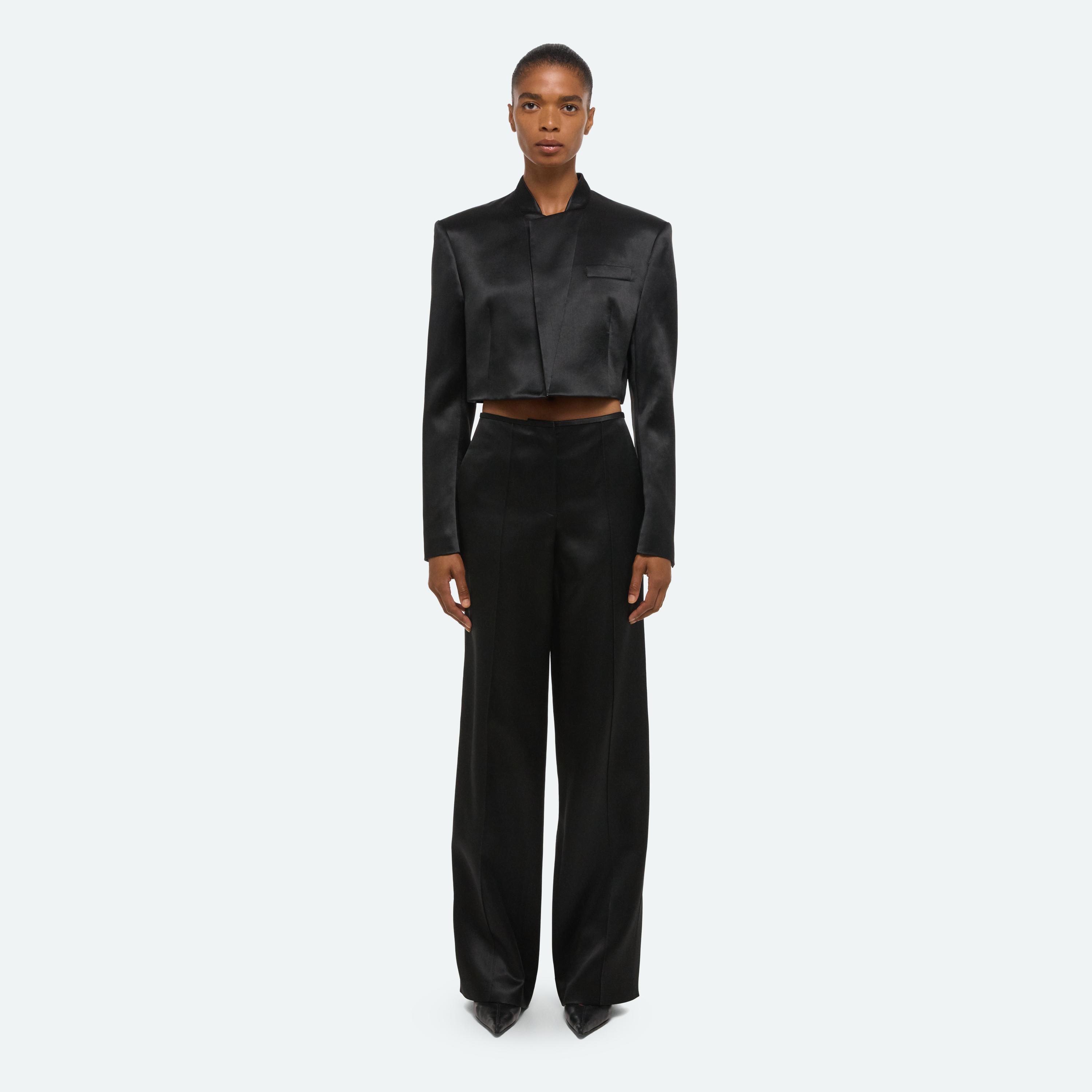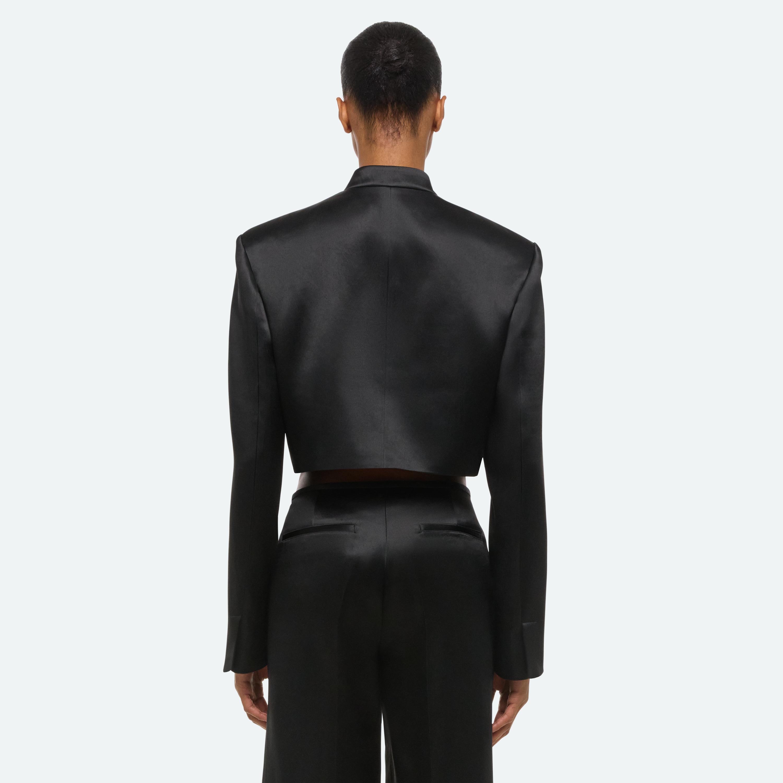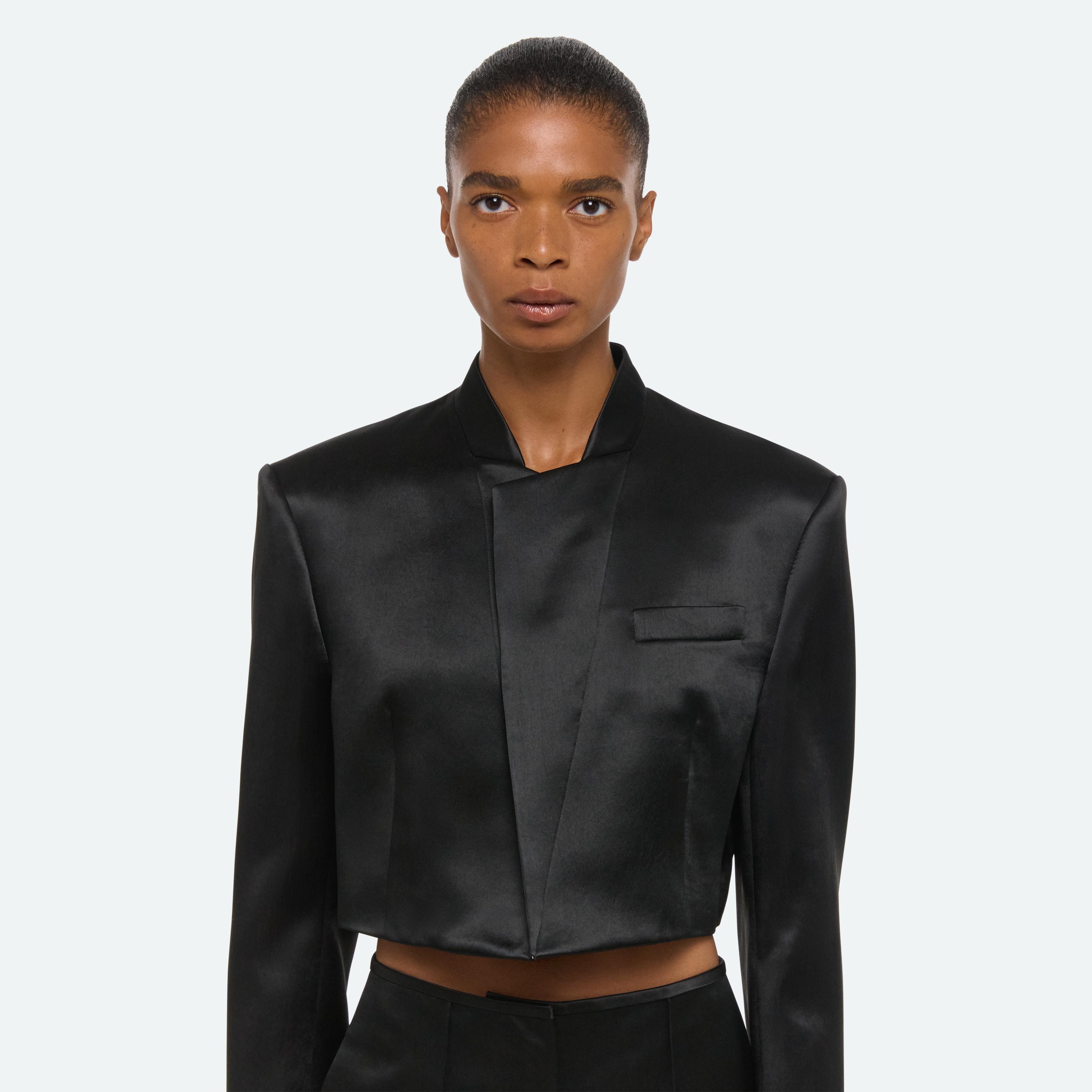 Cropped blazer in duchesse satin with a stand collar and structured shoulders. Matches the Minimal Satin Pants.