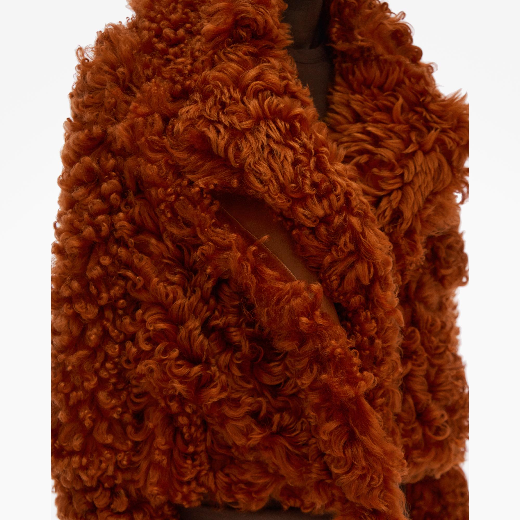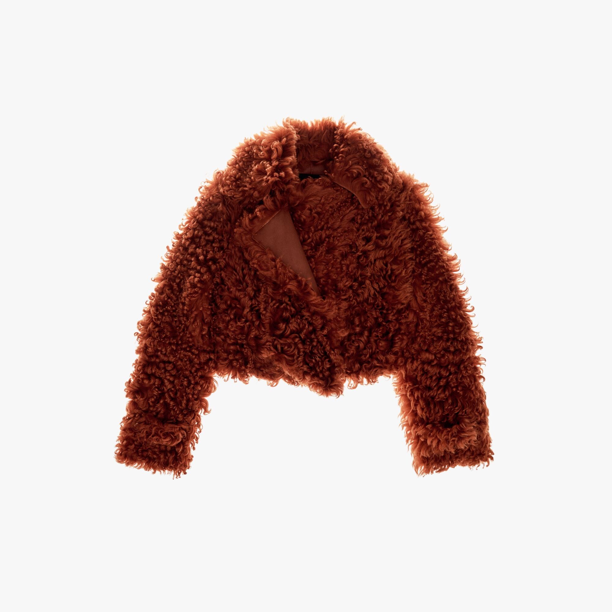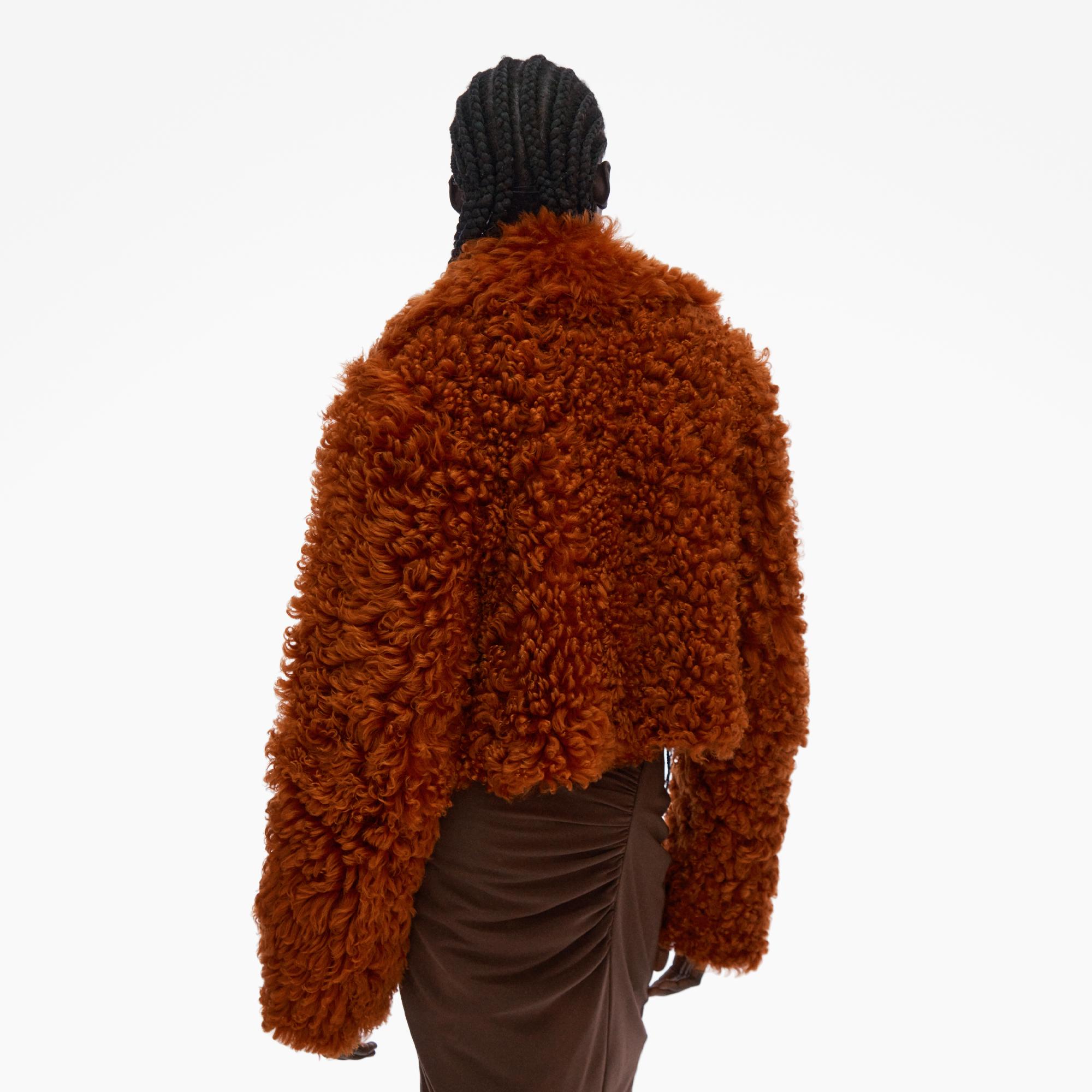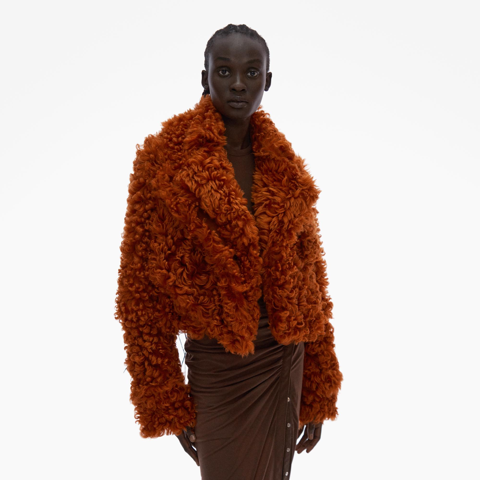 The Helmut Lang Trench Jacket is a cropped style in shearling with notched lapels, draped storm flap and asymmetrical snap closures.