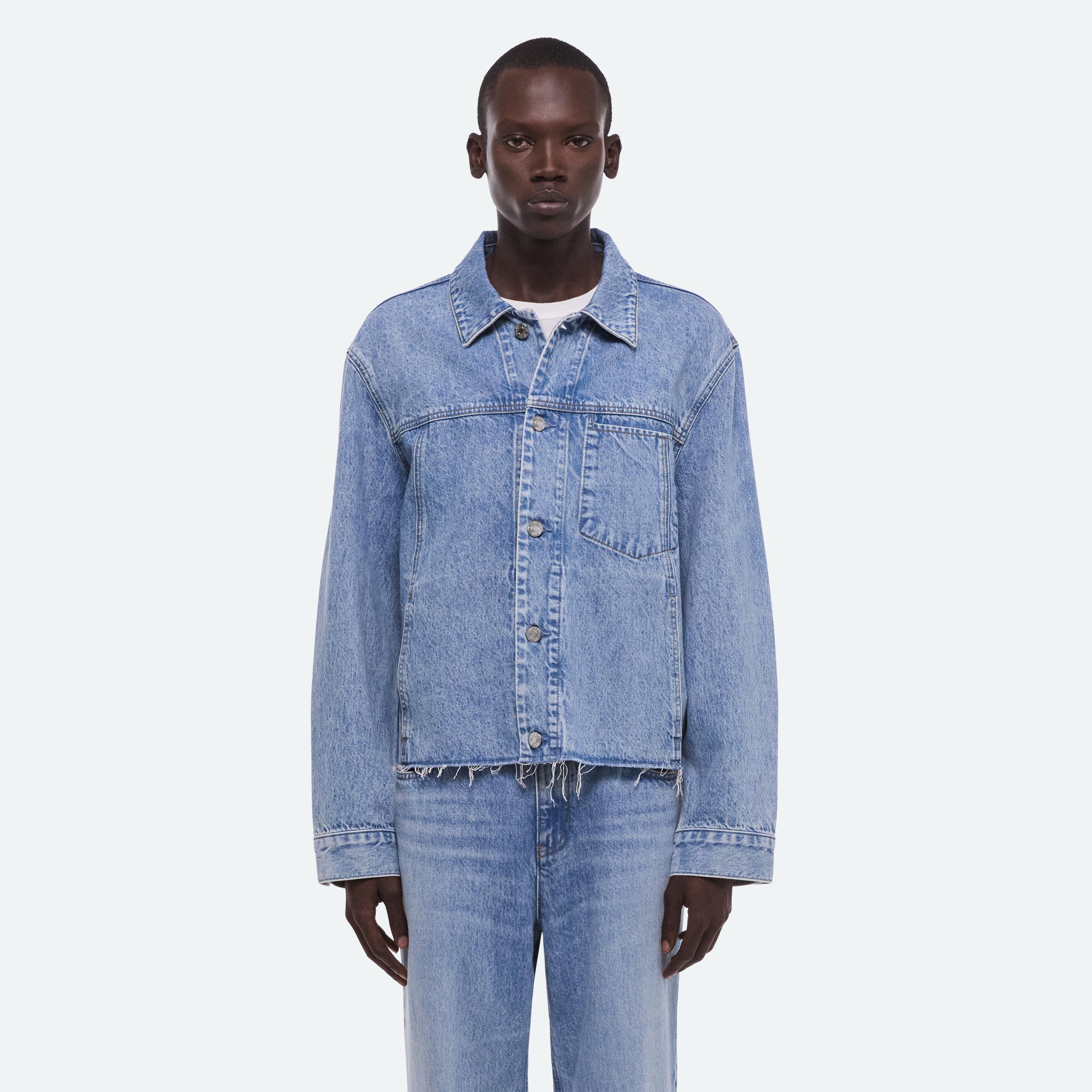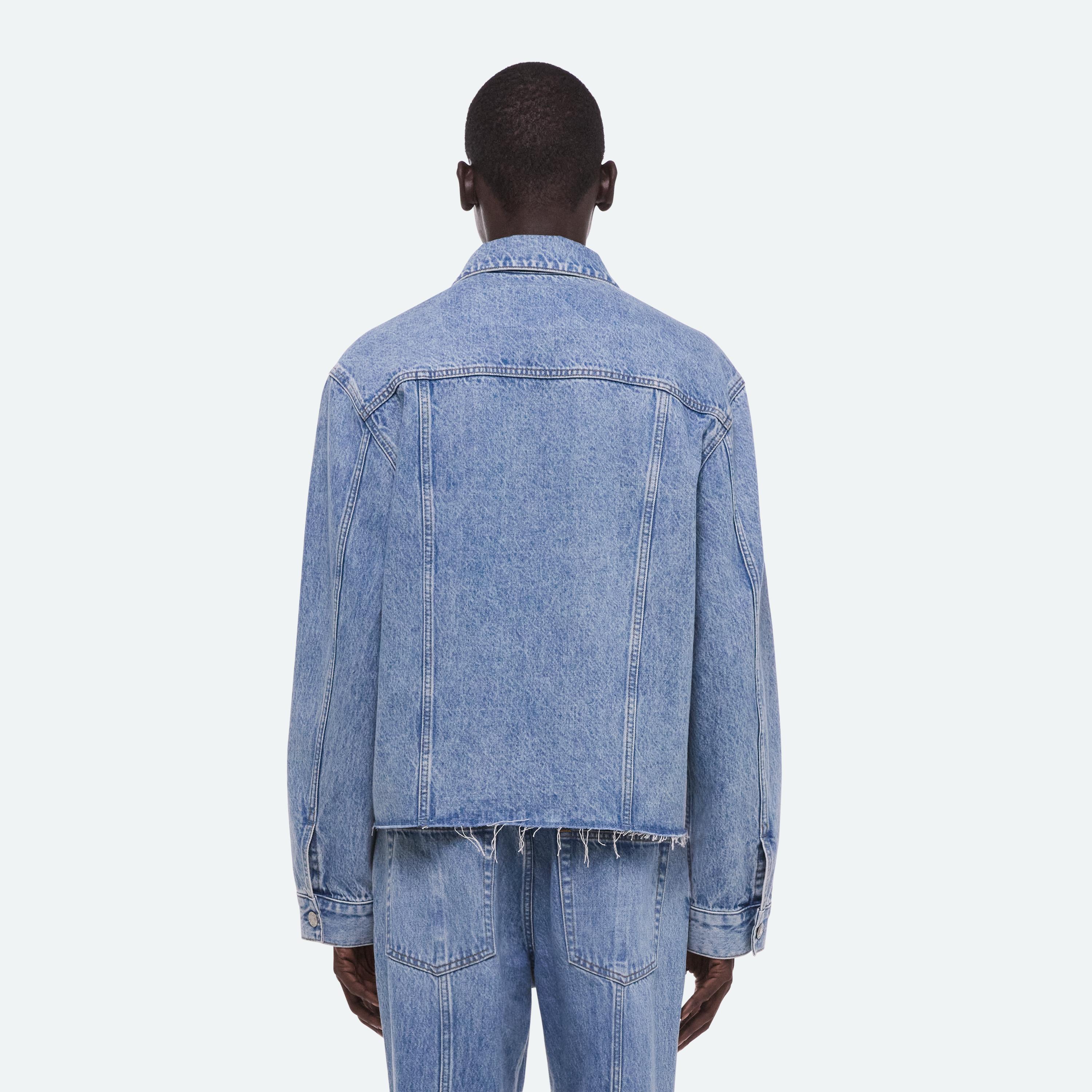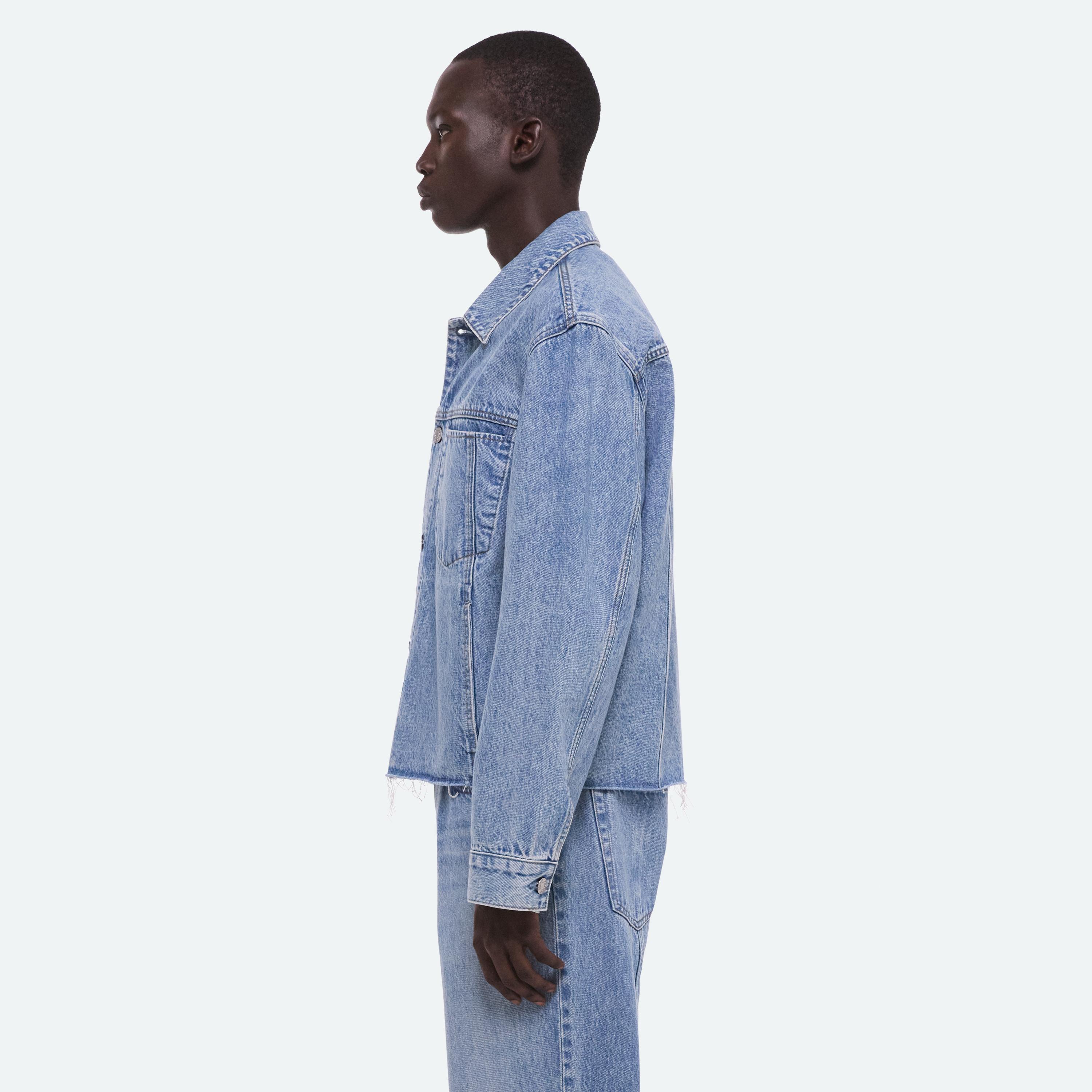 Trucker jacket in Italian denim with a light indigo rinse. Features a front welt pocket that reinterprets classic trucker construction and finished with a raw hem.